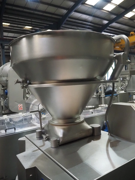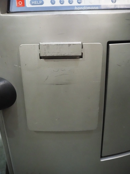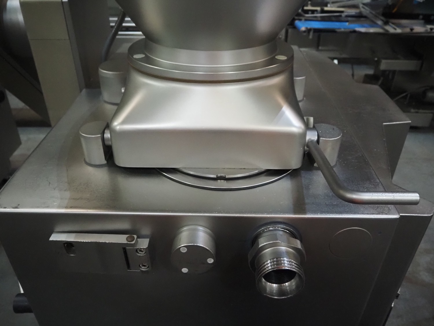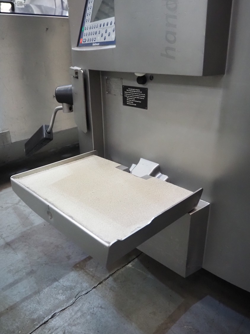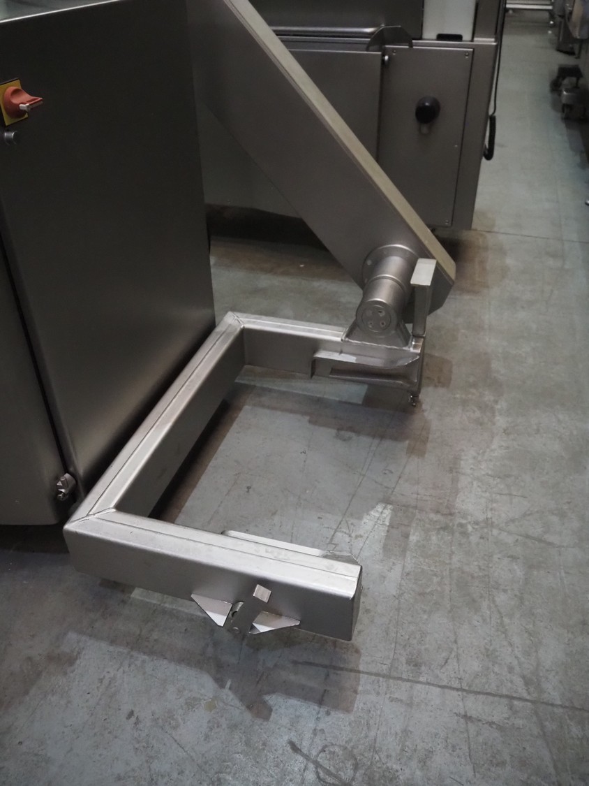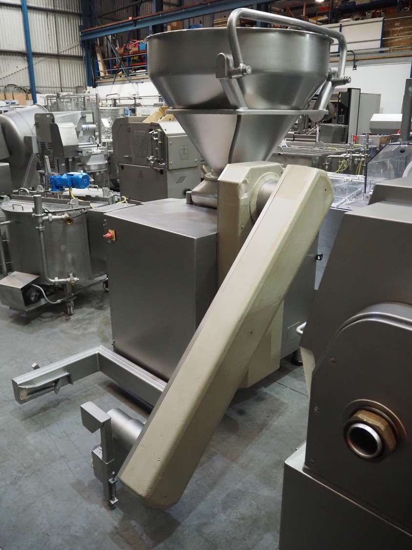 Handtmann vacuum filling machine with lifter for 200 litre meat bins, type: VF628, number: 16380, year of construction: 2003, 420 V, 3 Ph, 50 Hz, 18.6 A, 13.5 kW, dimensions: 1750 mm x 1350 mm x 2100 mm.