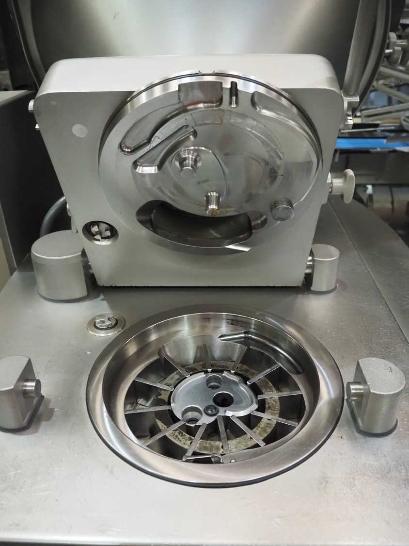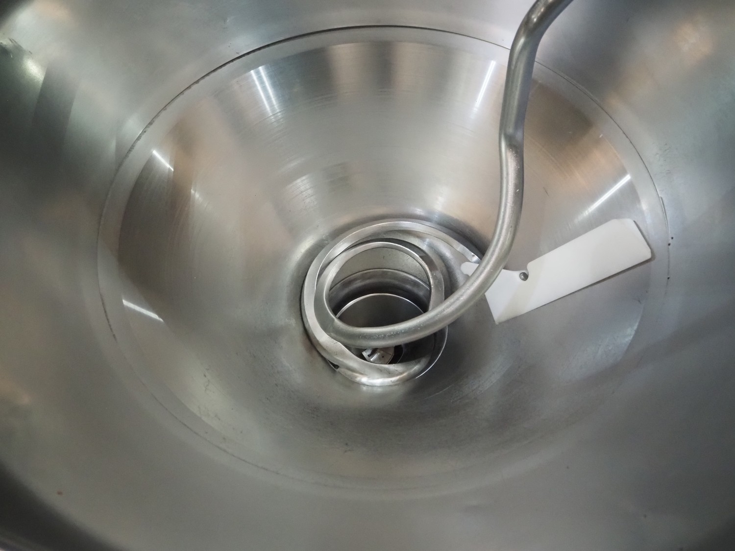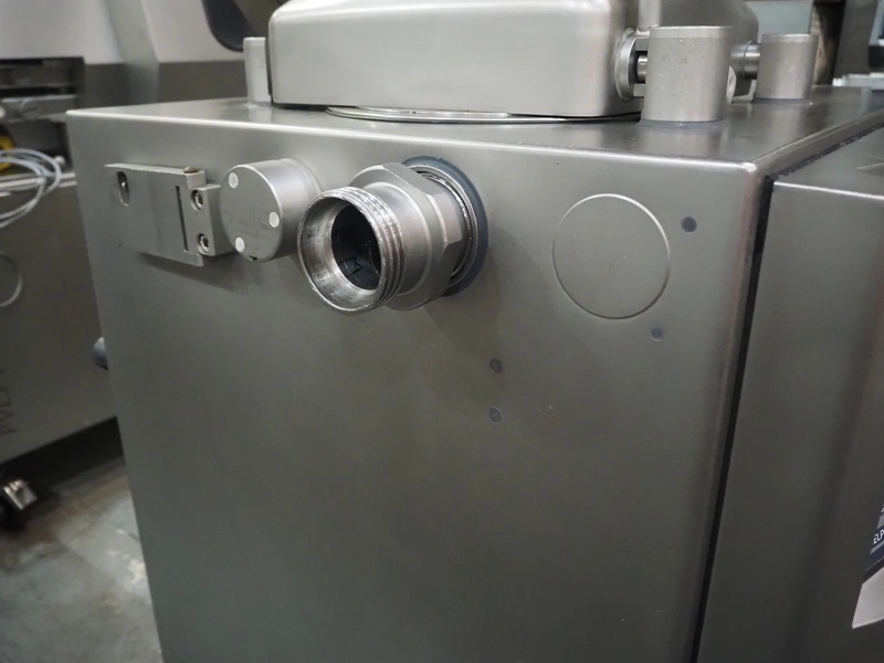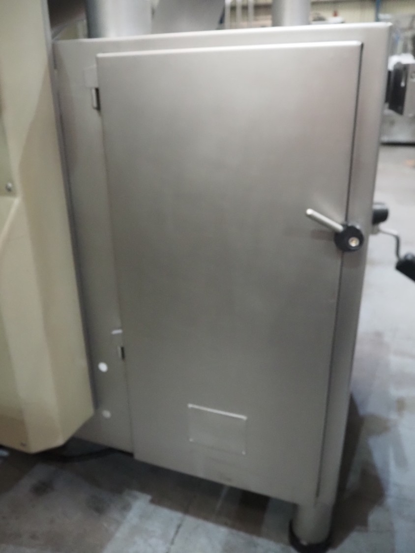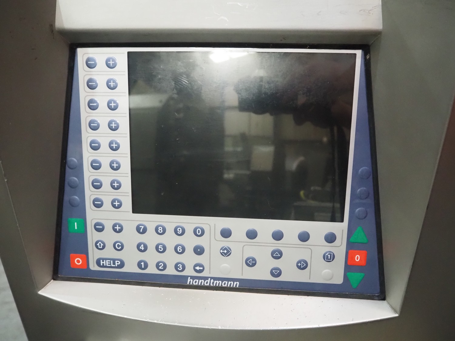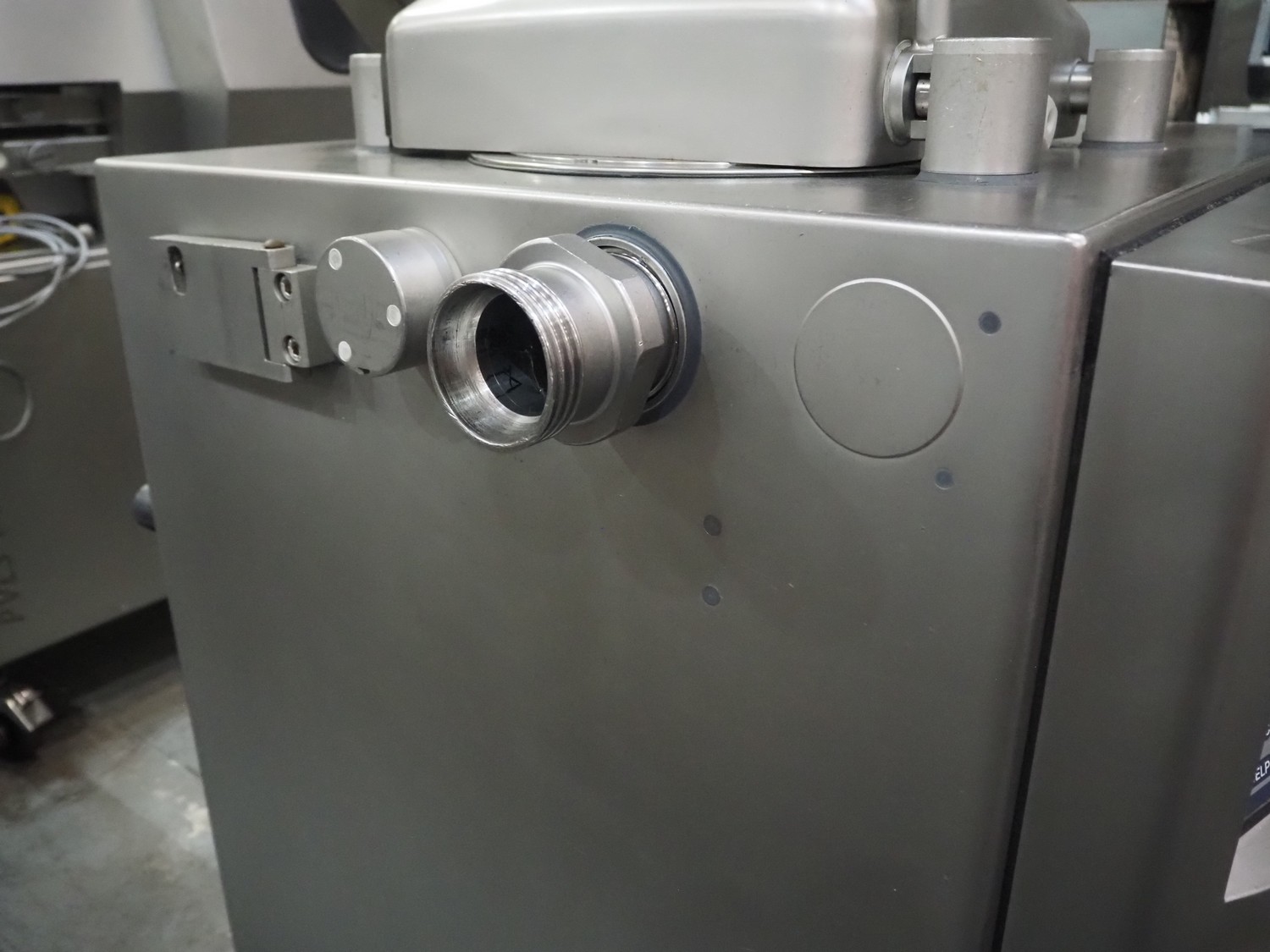 Handtmann vacuum filling machine with lifter for 200 litre meat bins, type: VF628, number: 16380, year of construction: 2003, 420 V, 3 Ph, 50 Hz, 18.6 A, 13.5 kW, dimensions: 1750 mm x 1350 mm x 2100 mm.