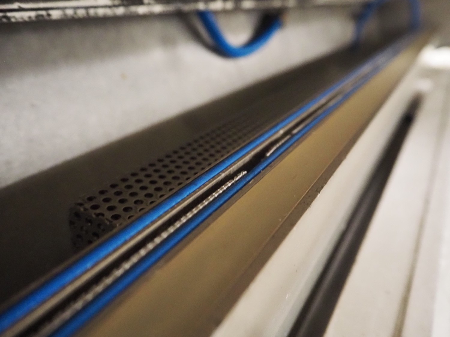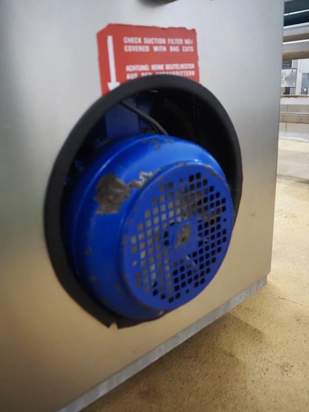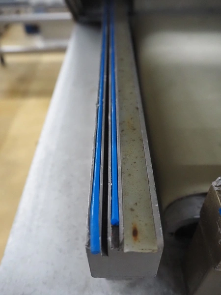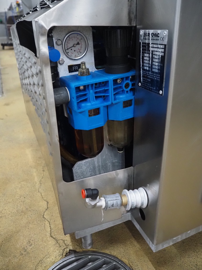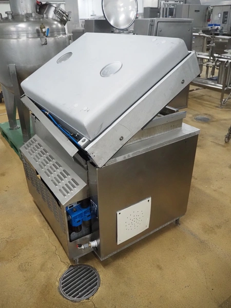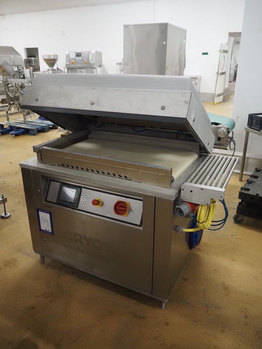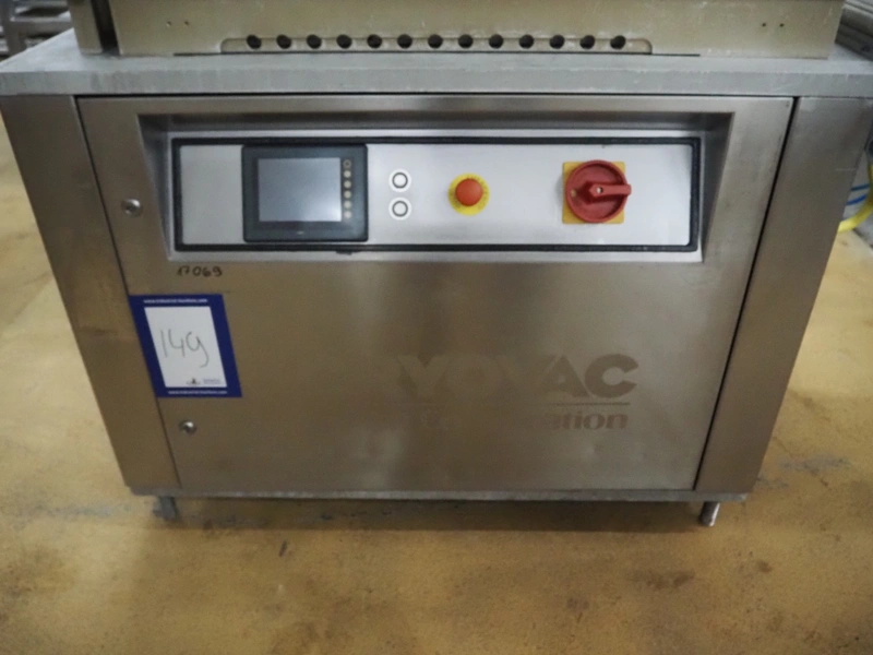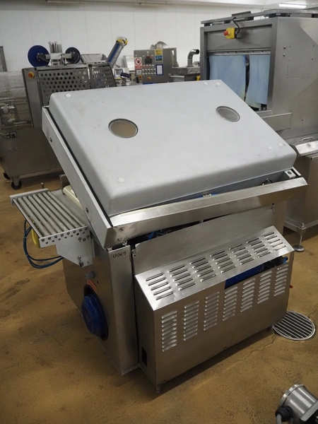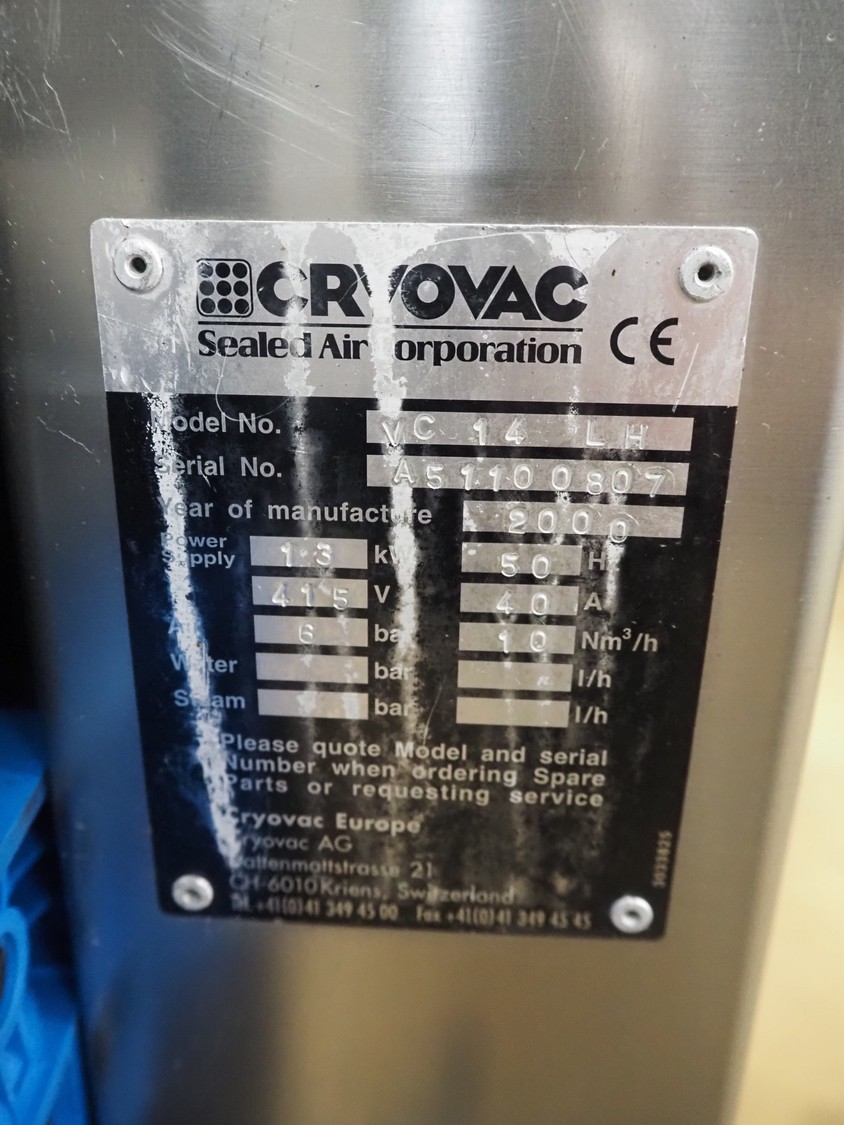 Cryovac belt vacuum machine, model: VC 14 LH, serial number: A51100807, year of construction: 2000, 415 V, 50 Hz, 4.0 A, 1.3 kW, plastic belt, belt width: 480 mm, seal length: (2x) 940 mm, (1x) 650 mm, total dimensions: 1400 mm x 1000 mm x 1100 mm.