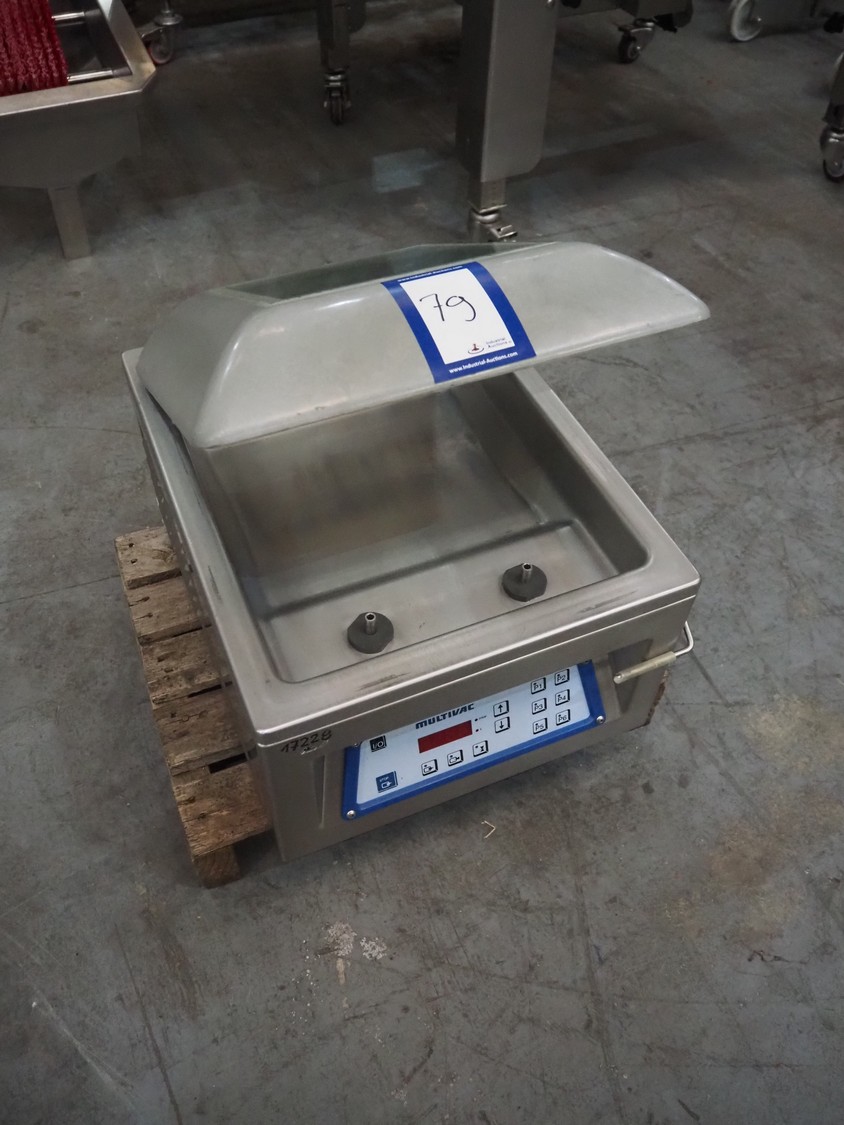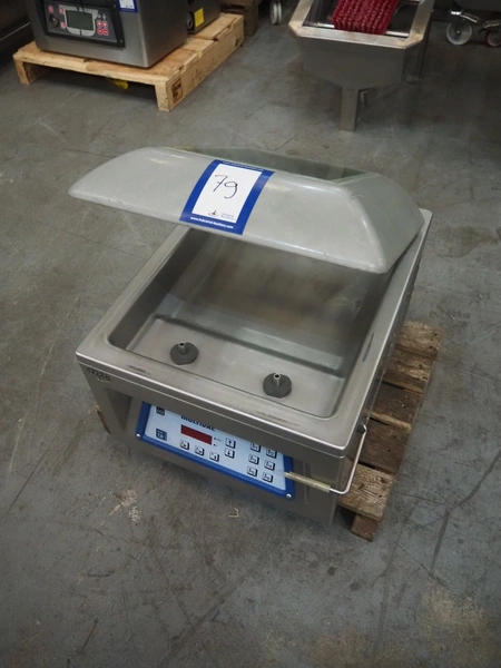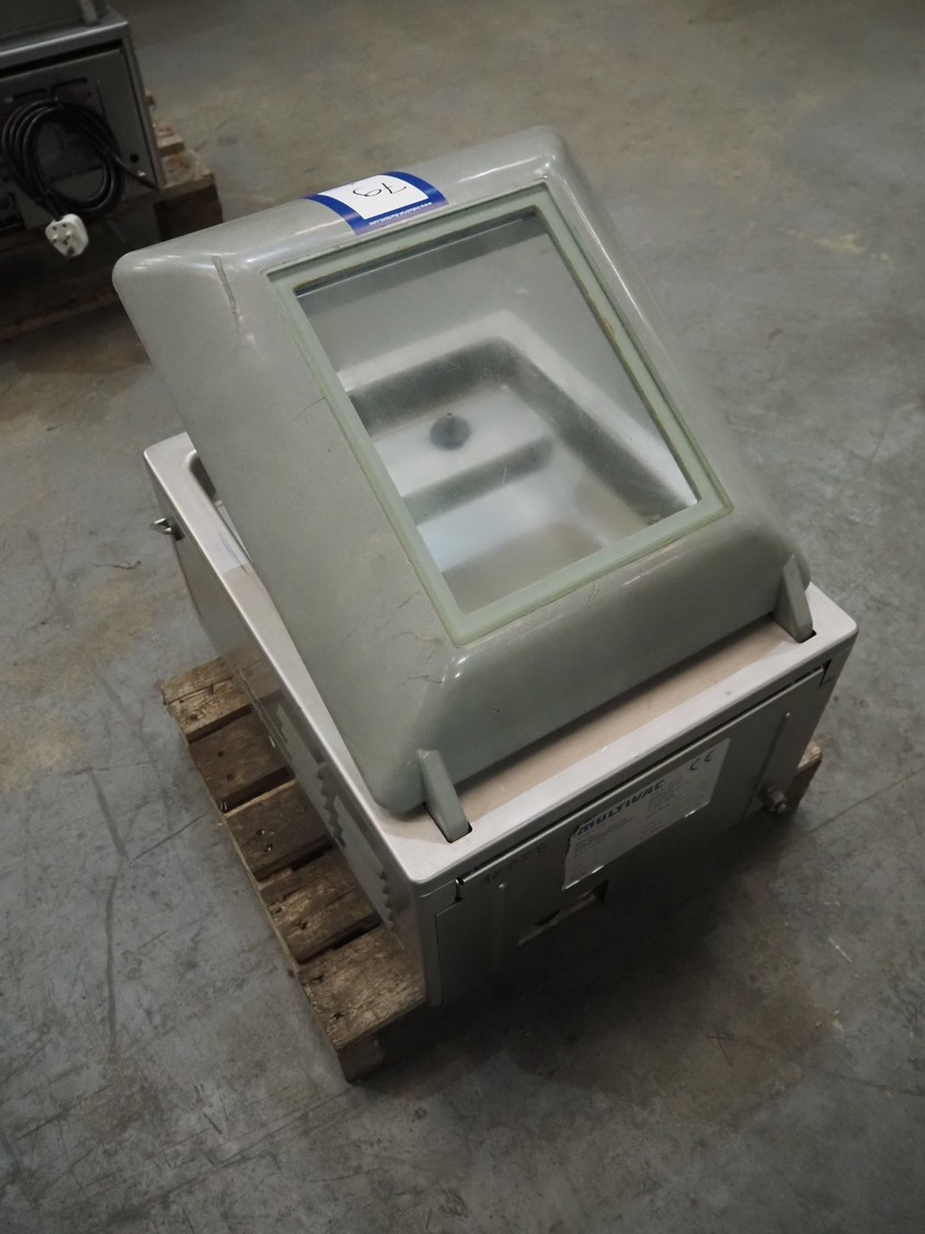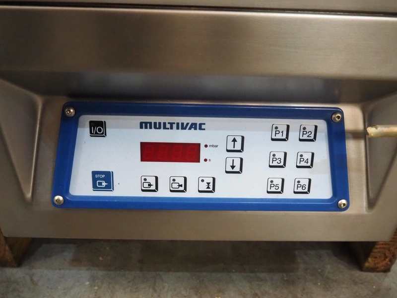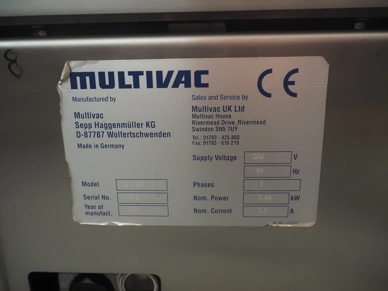 Multivac vacuum machine, type: C100, serial number: 1392, year of construction: 1997, 230 V, 1 Ph, 50 Hz, 3.5 A, 0.66 kW, seal length: 300 mm, dimensions chamber: 330 mm x 330 mm, Busch vacuum pump, total dimensions: 500 mm x 400 mm x 400 mm. Missing seal.