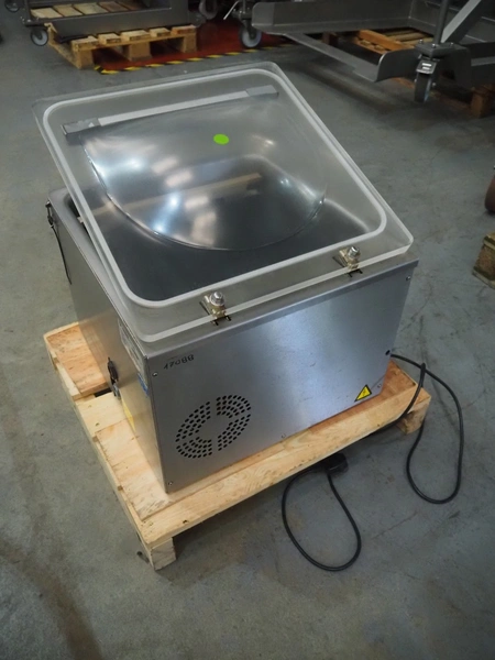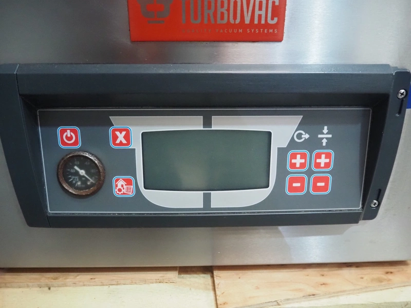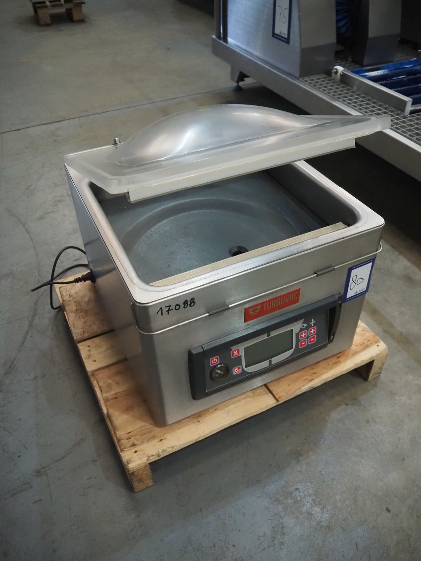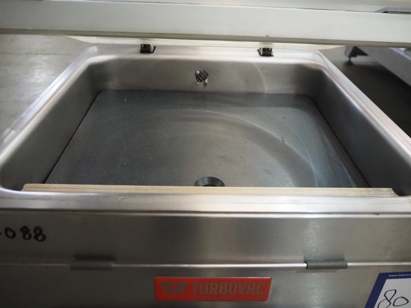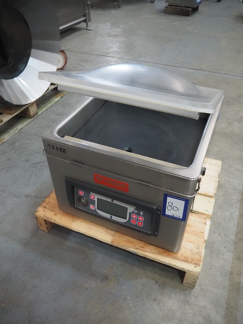 Turbovac vacuum machine, model: T40, serial number: 20170398, year of construction: 2017, 220-240 V, 1 Ph, 50 Hz, 6.5 A, seal length: 420 mm, dimensions chamber: 370 mm x 440 mm, total dimensions: 550 mm x 510 mm x 480 mm.