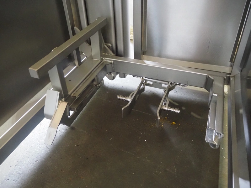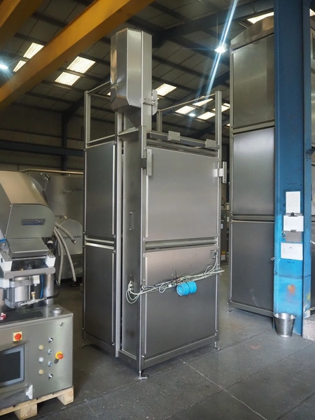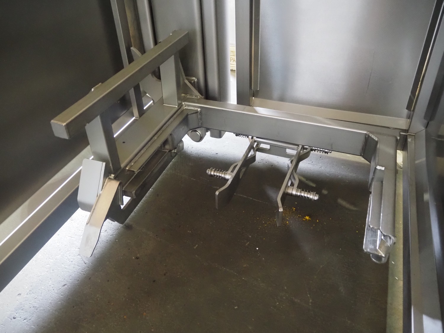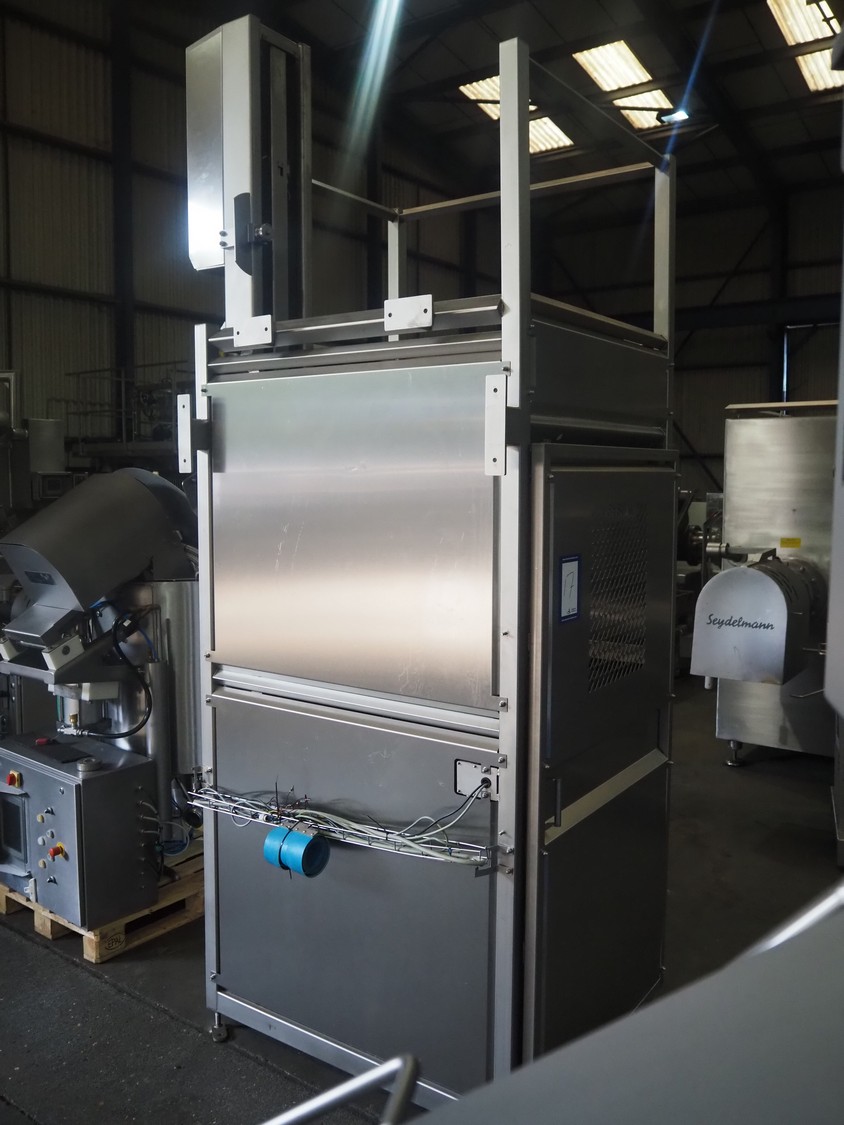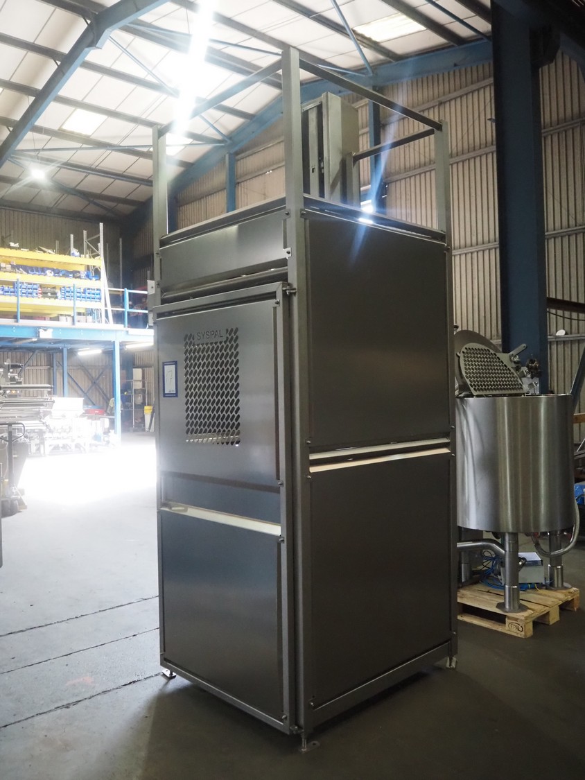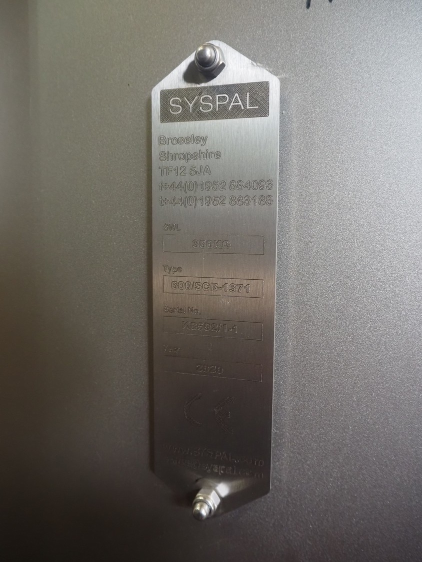 Syspal lifter for 200 litre meat bins with s/s protection cage, type: 600/SCB-1371, serial number: K8592/1-1, year of construction: 2020, safe work load: 350 kg, lifting height: 2650 mm, total dimensions: 1350 mm x 1400 mm x 3600 mm.