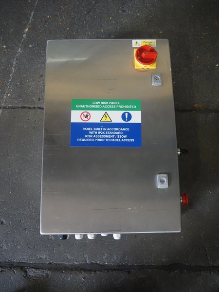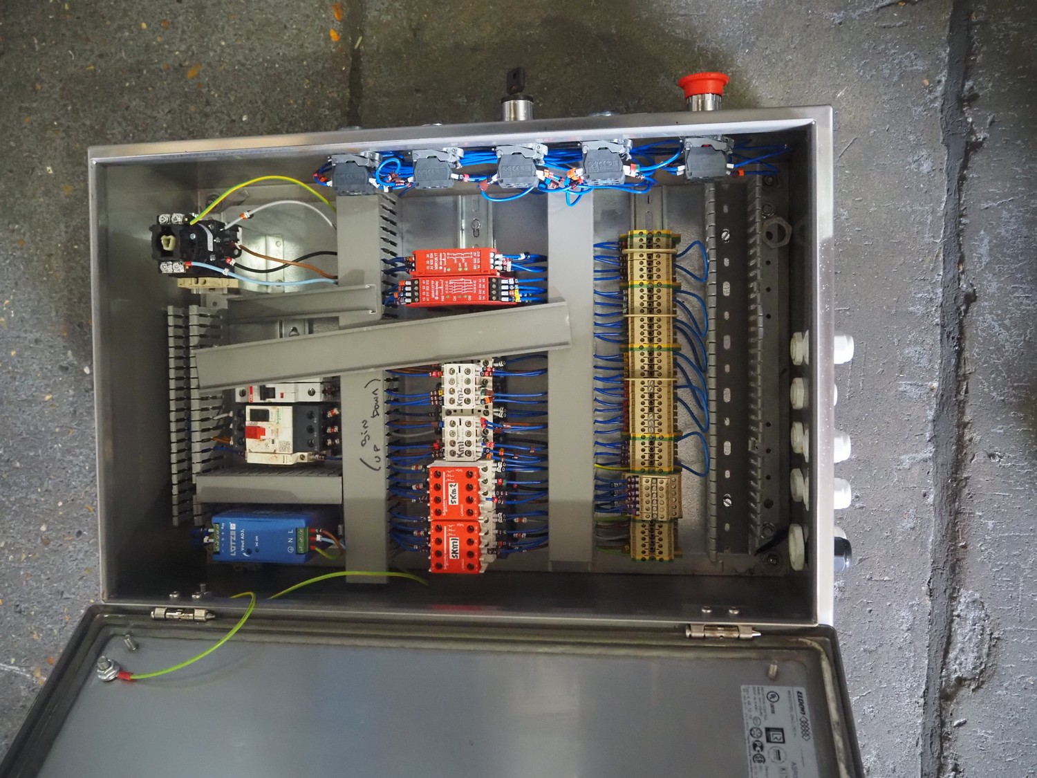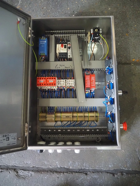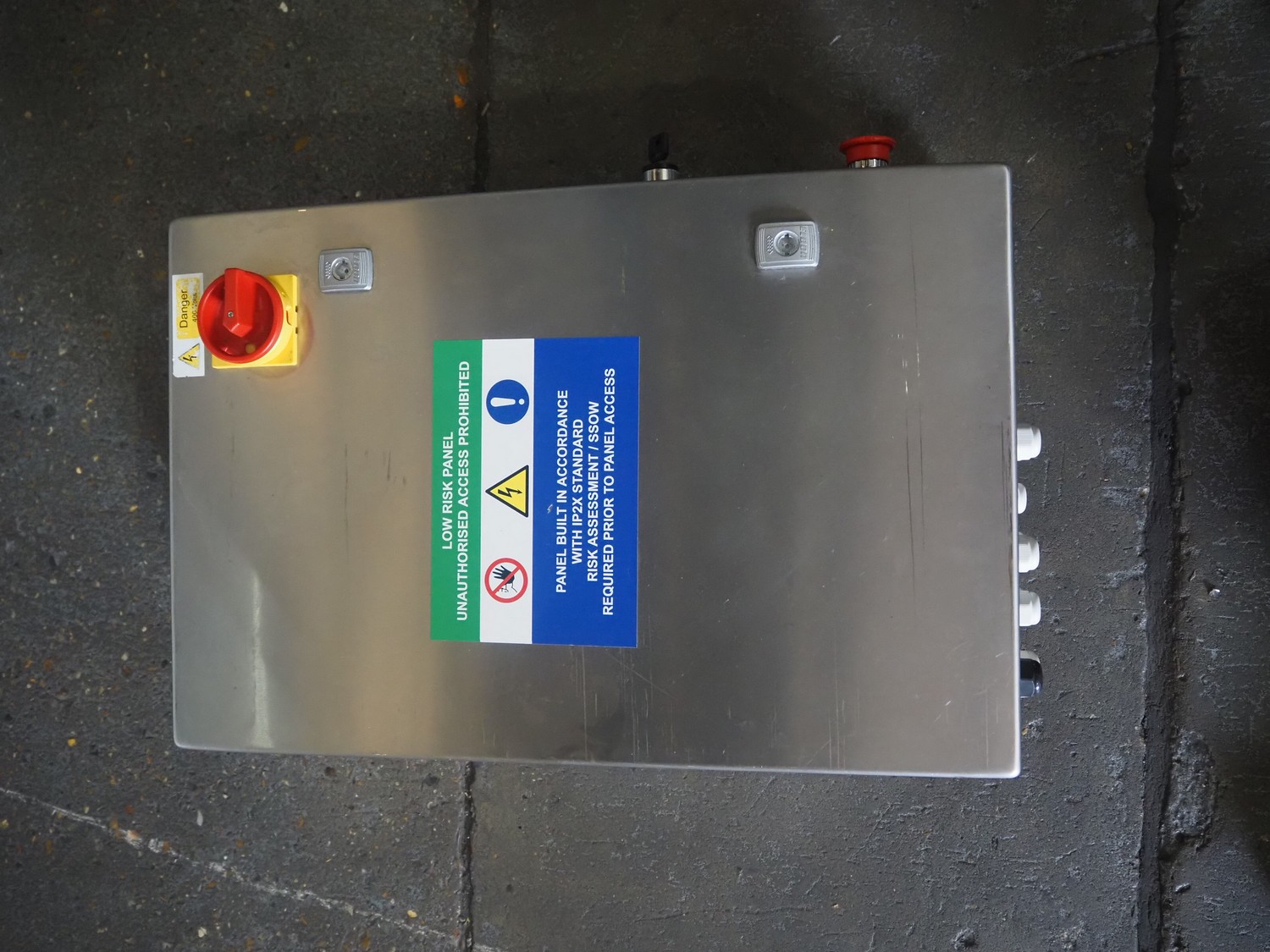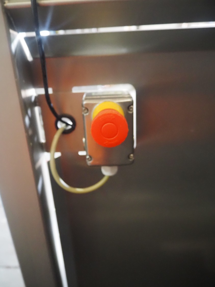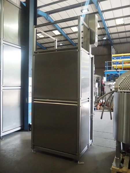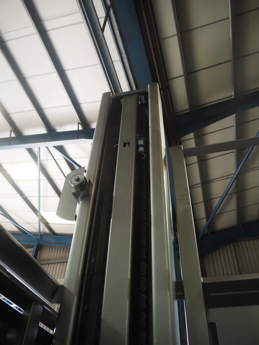 Syspal lifter for 200 litre meat bins with s/s protection cage, type: 600/SCB-1371, serial number: K8592/1-1, year of construction: 2020, safe work load: 350 kg, lifting height: 2650 mm, total dimensions: 1350 mm x 1400 mm x 3600 mm.