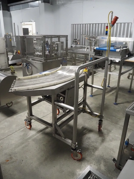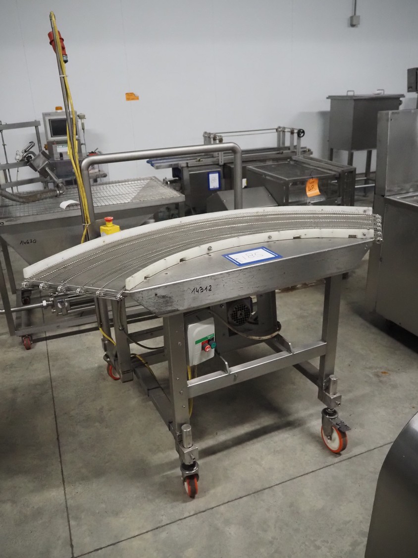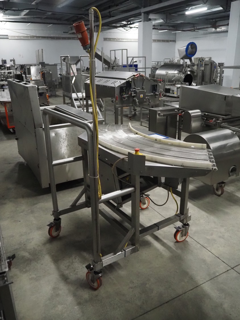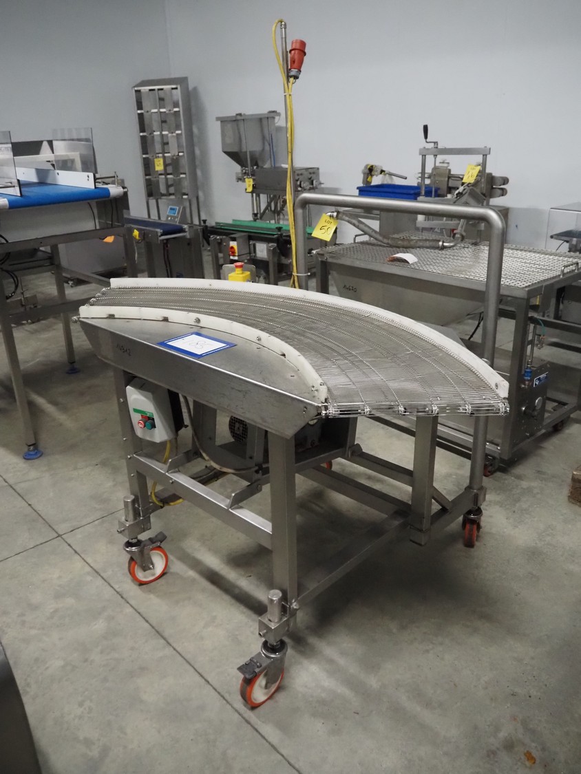Mobile 45° curve conveyor, s/s mesh belt, belt width: 400 mm, total dimensions: 1700 mm x 1100 mm x 1930 mm.