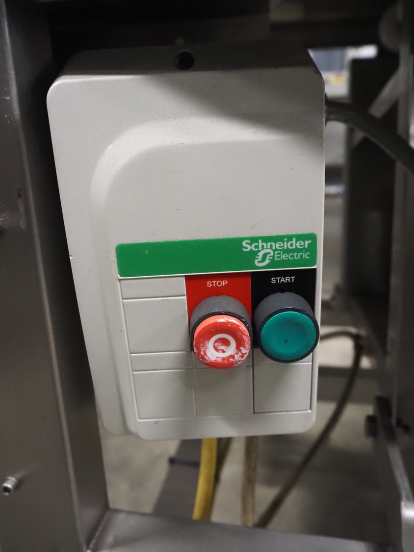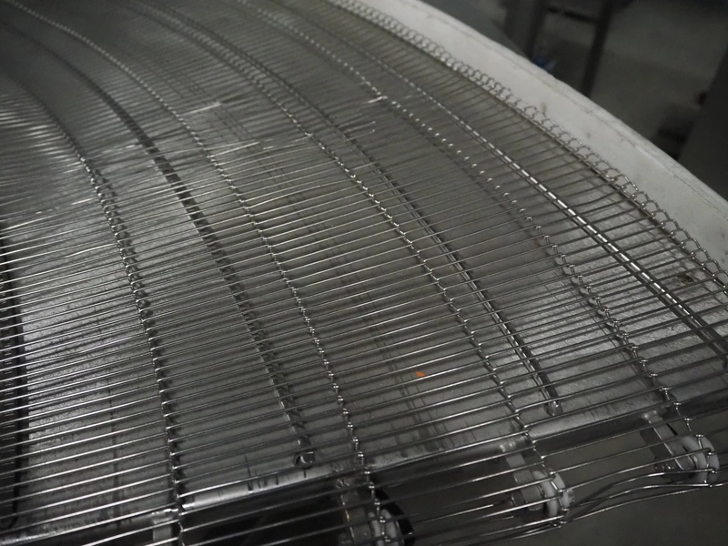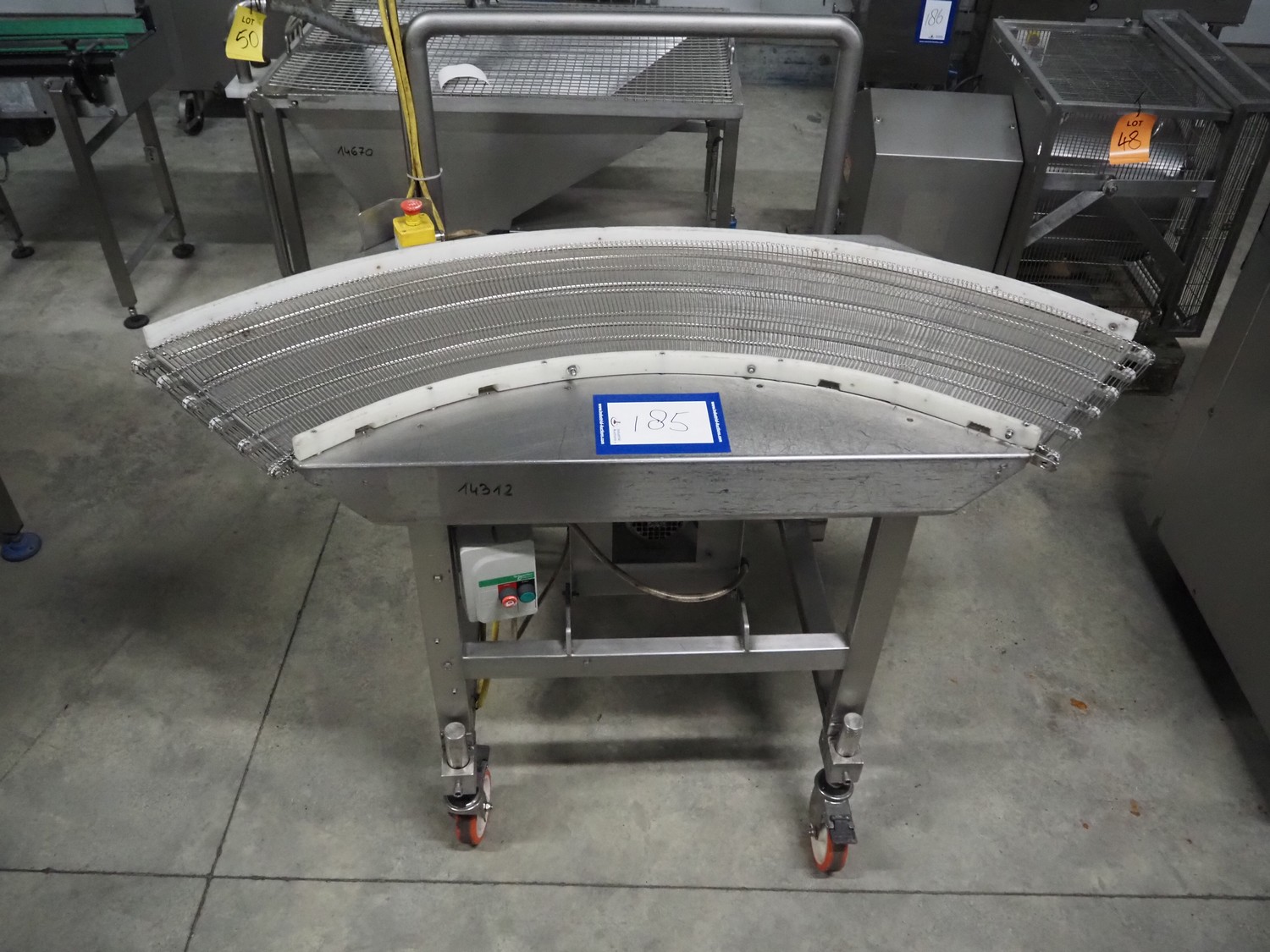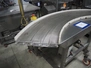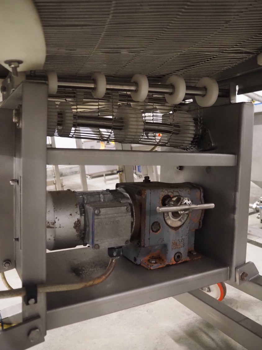 Mobile 45° curve conveyor, s/s mesh belt, belt width: 400 mm, total dimensions: 1700 mm x 1100 mm x 1930 mm.