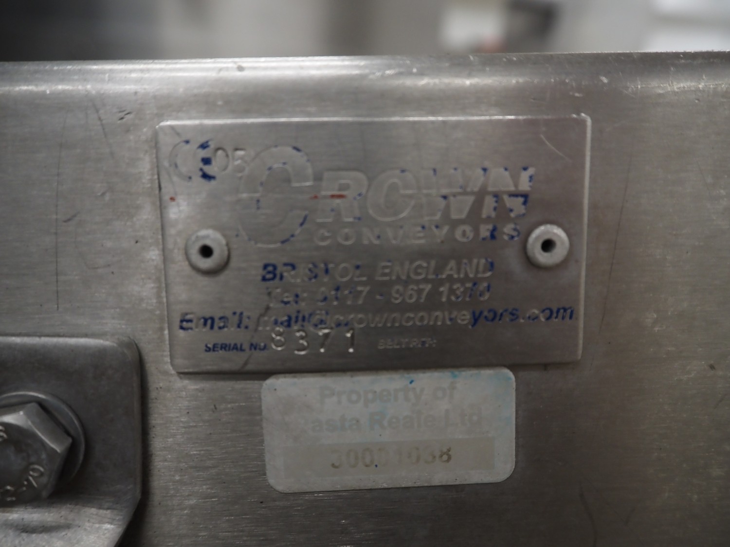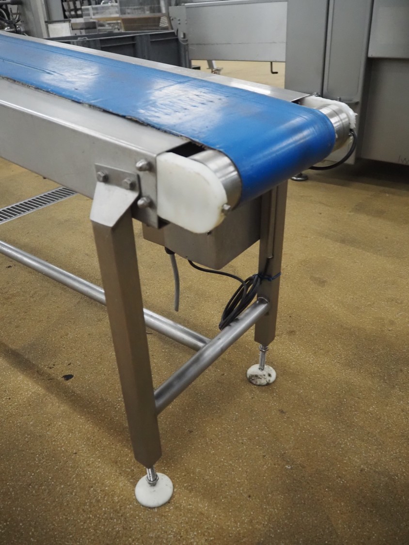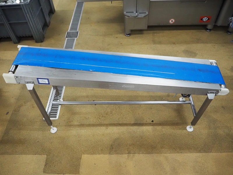 Crown conveyors elevating belt, serial number: 8371, plastic belt, belt width: 245 mm, elevating height: 970 mm, total dimensions: 2000 mm x 500 mm x 970 mm.