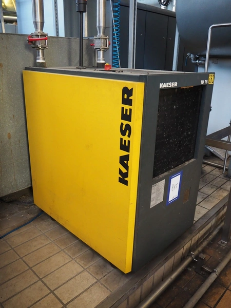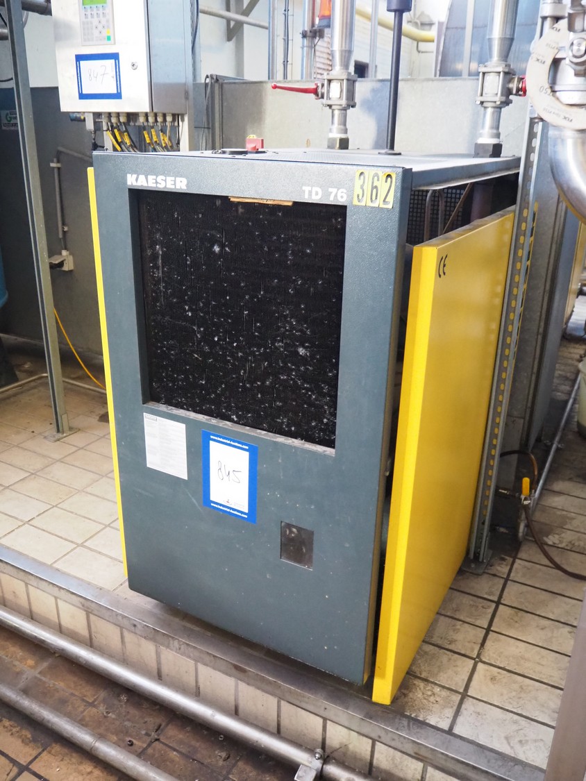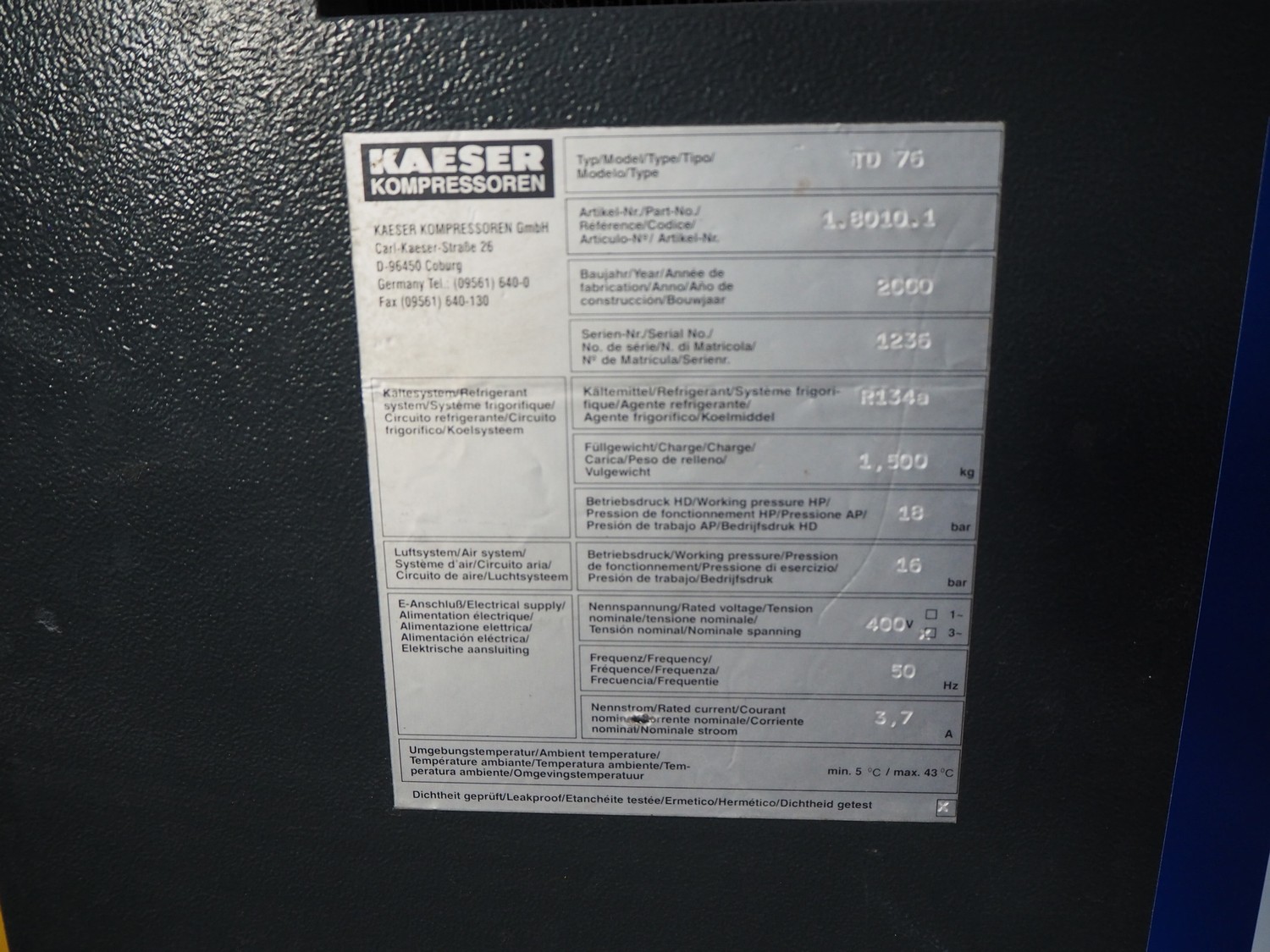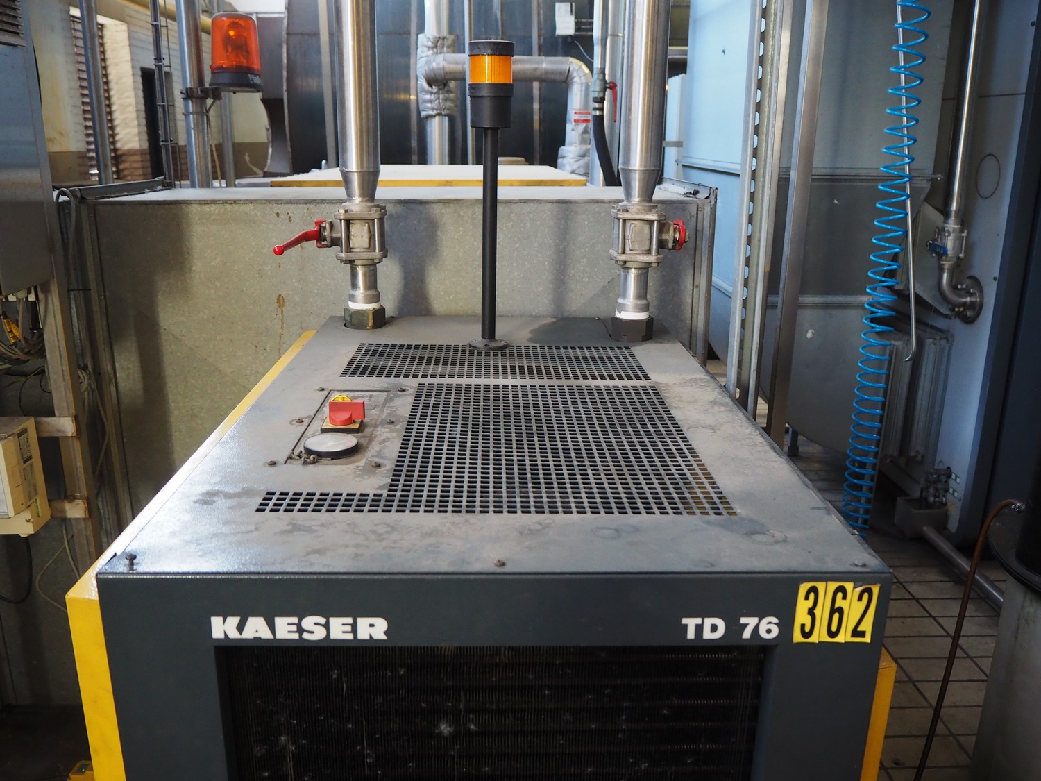 Kaeser air dryer, type: TD 76, serial number: 1236, year of construction: 2000, 400 V, 3 Ph, 50 Hz, 3.7 A, refrigerant: R134a, dimensions: 1100 mm x 730 mm x 1200 mm.