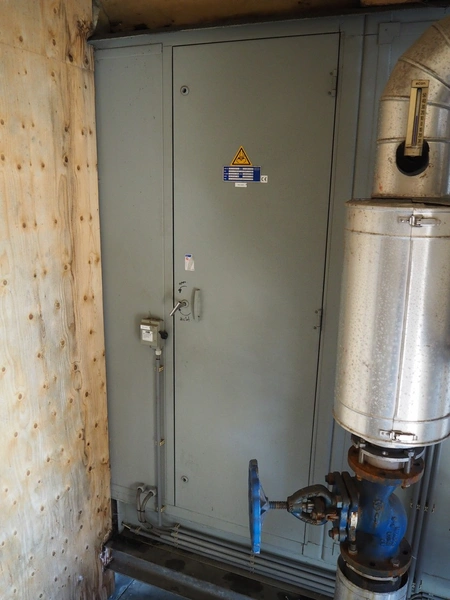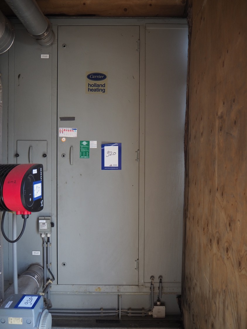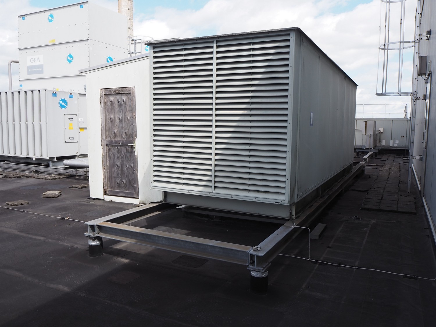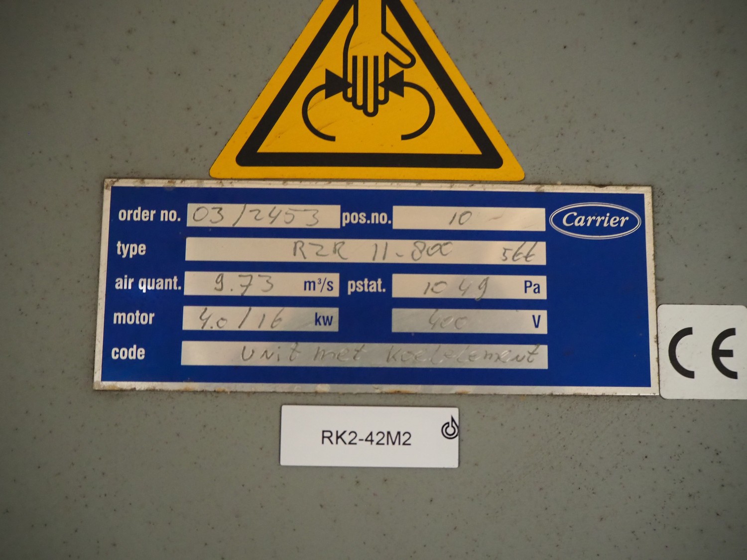 Carrier air treatment cabinet on steel frame, type: RZR 11-800 566, 400 V, 4/16 kW, air quant: 9.73 m³/s, dimensions without steel frame: 6050 mm x 2000 mm x 2250 mm, dimensions including steel frame: 9800 mm x 2190 mm x 2350 mm.