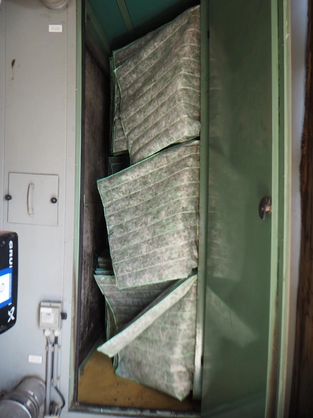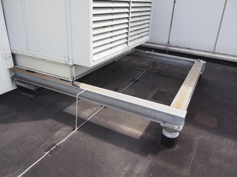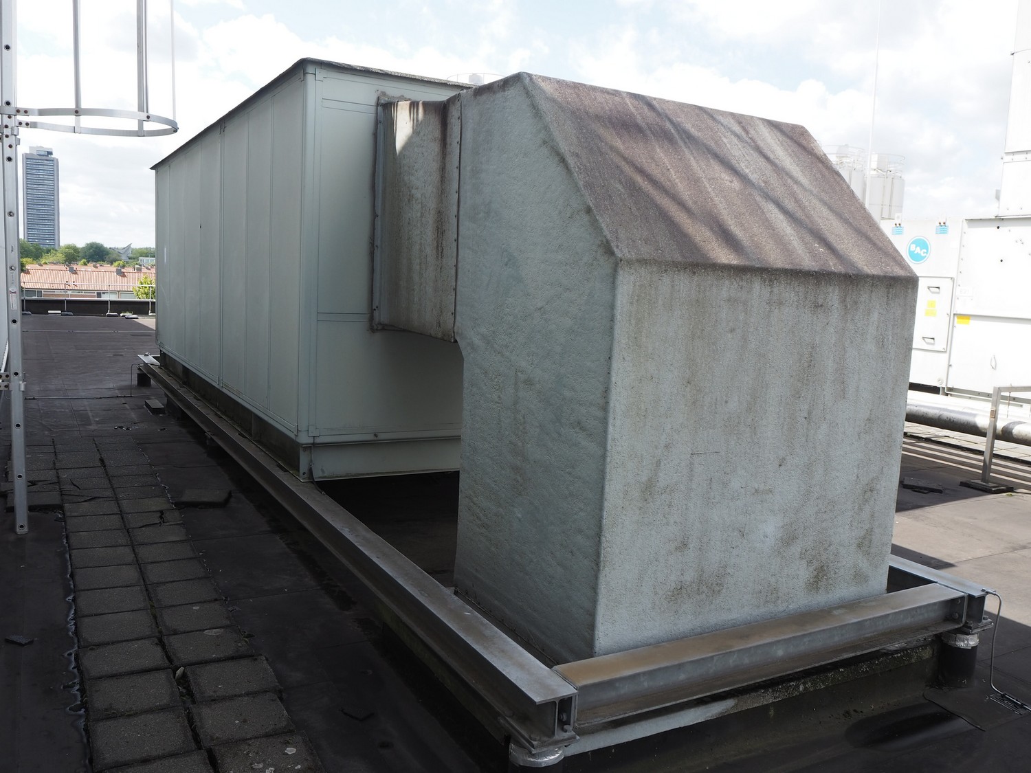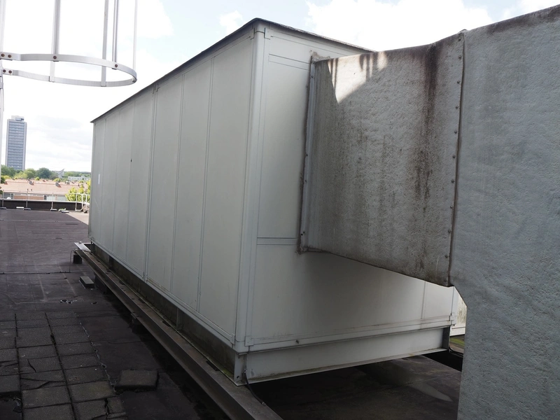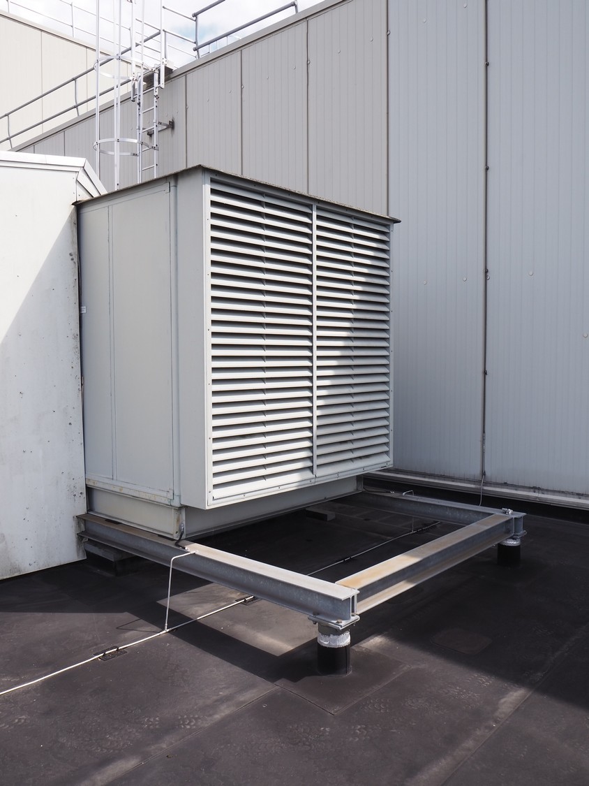 Carrier air treatment cabinet on steel frame, type: RZR 11-800 566, 400 V, 4/16 kW, air quant: 9.73 m³/s, dimensions without steel frame: 6050 mm x 2000 mm x 2250 mm, dimensions including steel frame: 9800 mm x 2190 mm x 2350 mm.