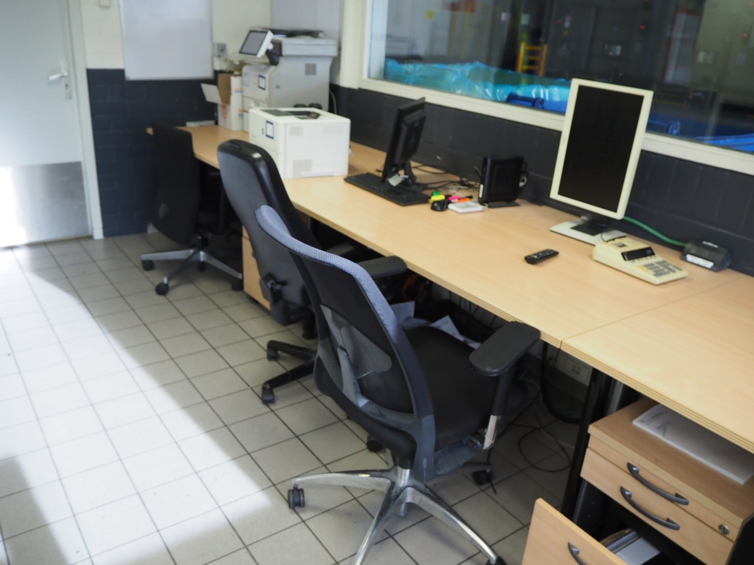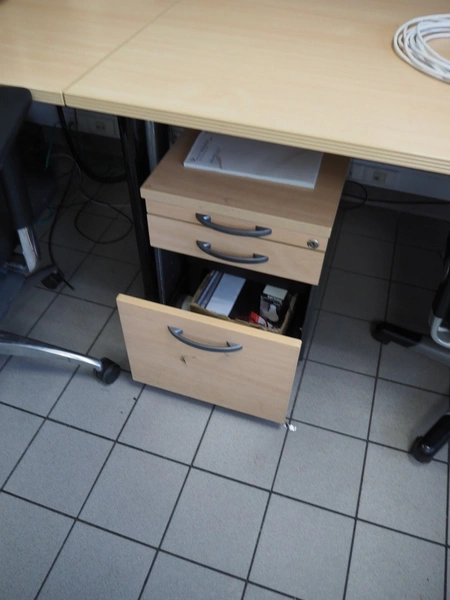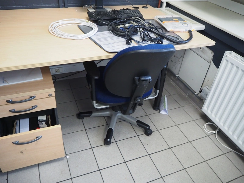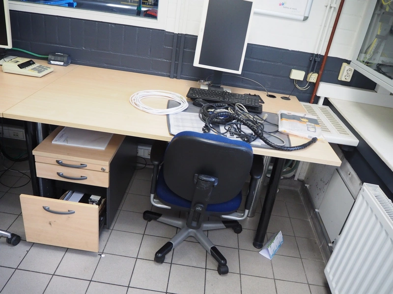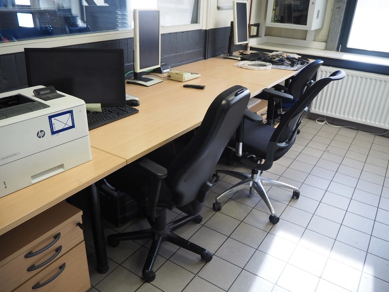 Office inventory consisting of: 3 office desks, dimensions: 1000 mm x 1580 mm x 790 mm, 2 drawers, dimensions: (2x) 900 mm x 4010 mm x 500 mm, steel cabinet, dimensions: 1200 mm x 950 mm x 21050 mm, 4 chairs, white board. Computer equipment is not included.