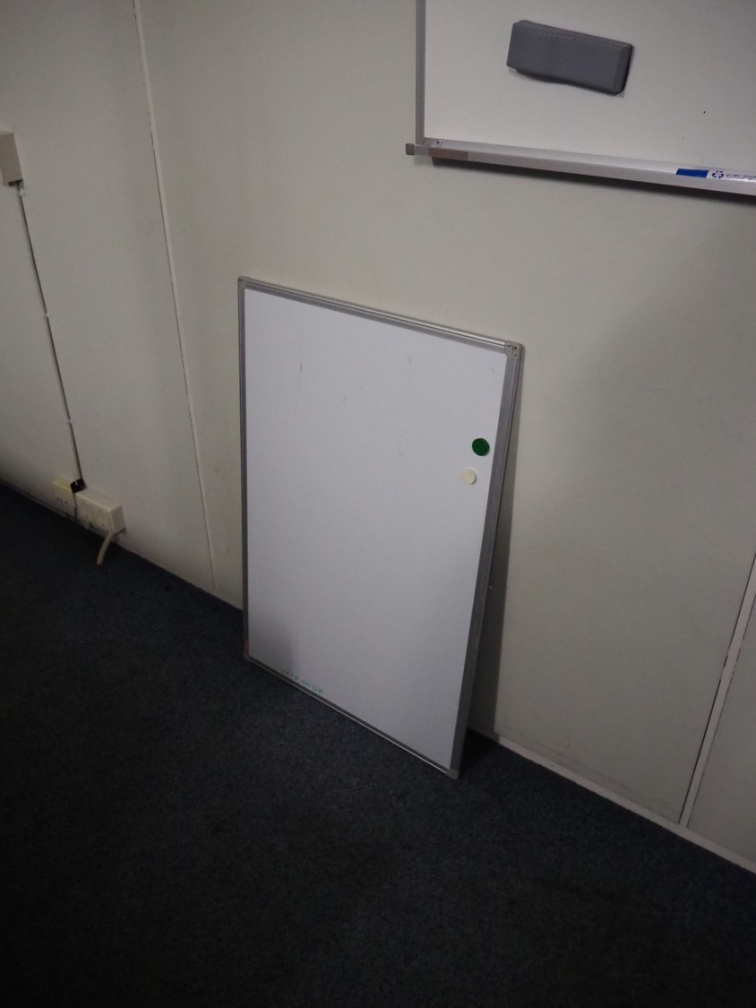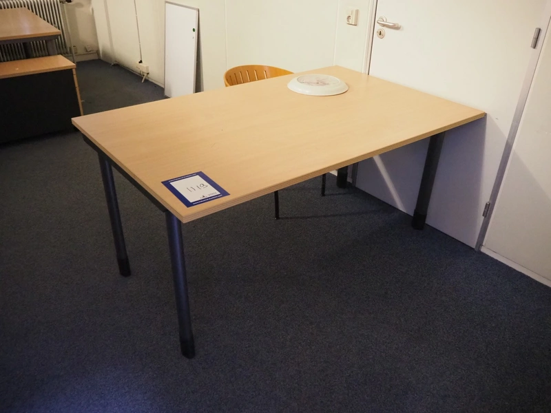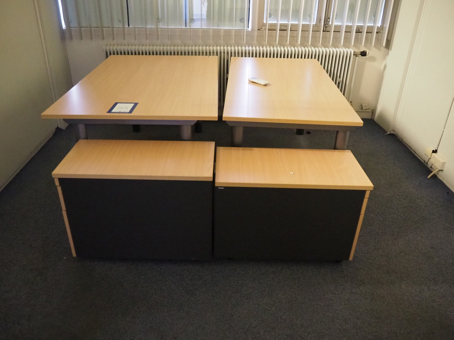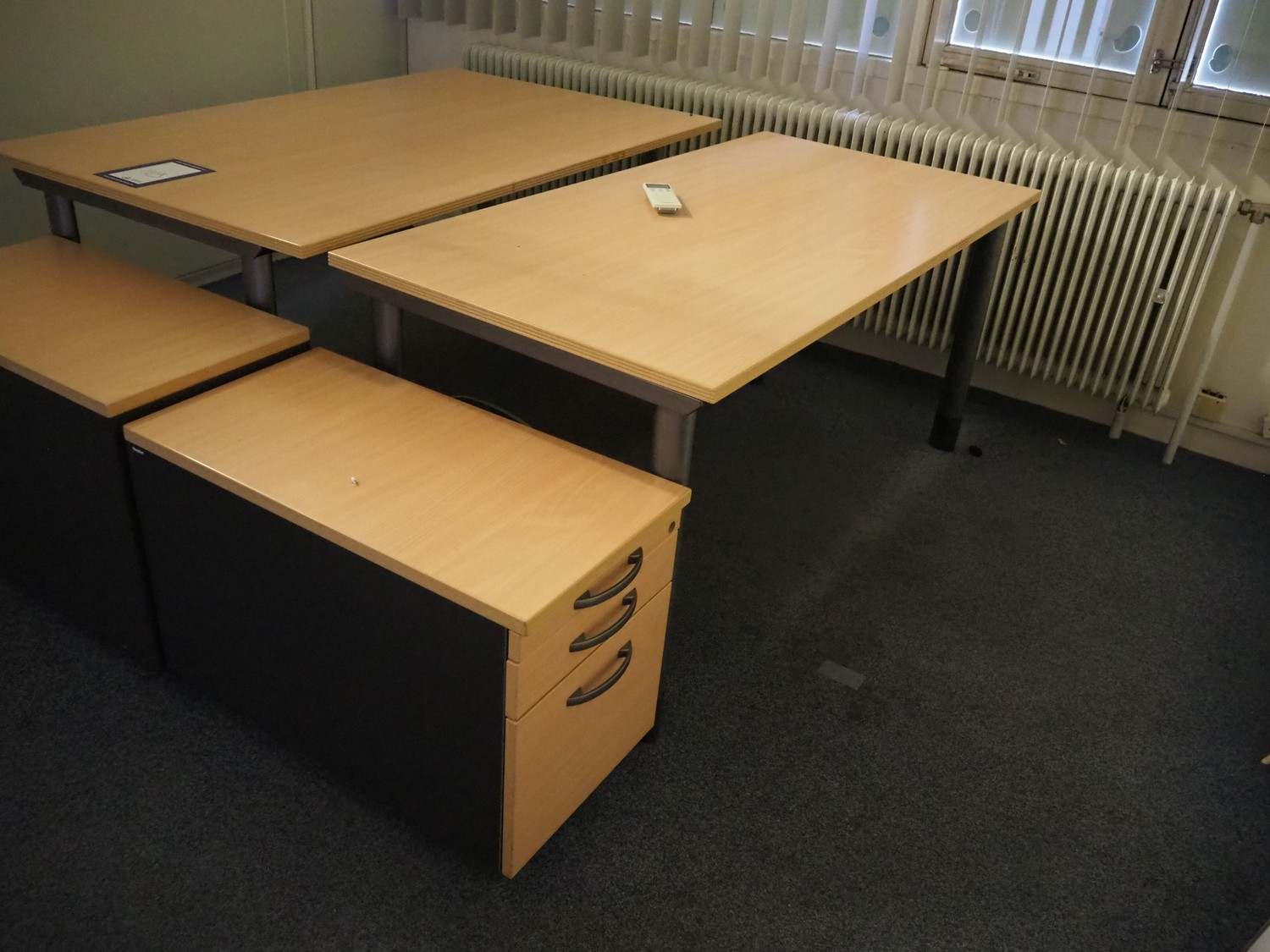Office inventory consisting of: 3 desks, dimensions: (2x) 1600 mm x 800 mm x 750 mm, 1600 mm x 1000 mm x 750 mm, 3 cabinets, (3x) 800 mm x 420 mm x 560 mm, 2 white boards. Without computer equipment.
