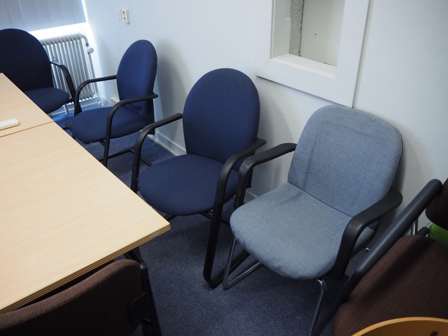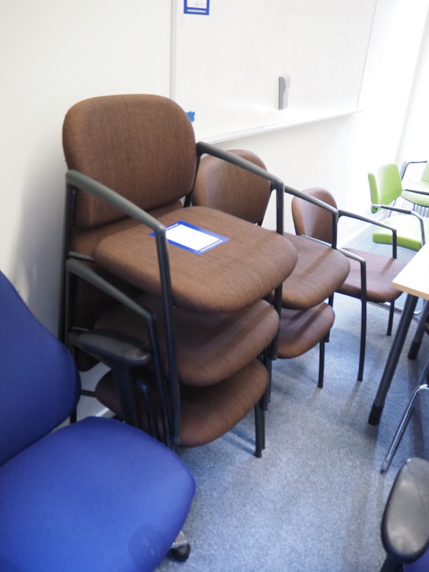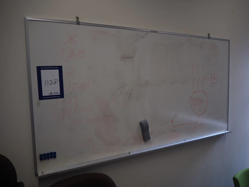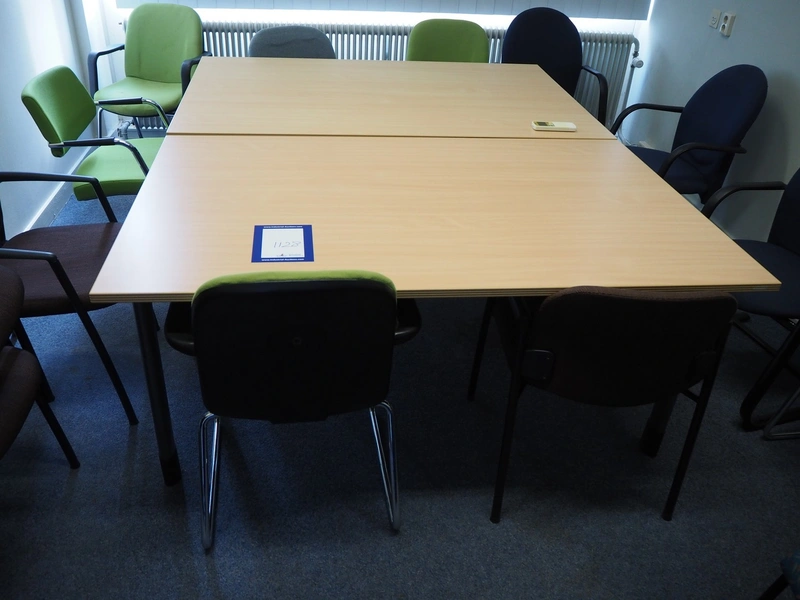Office inventory consisting of: 2 desks, dimensions: (2x) 1600 mm x 1000 mm x 760 mm, 25 chairs, dimensions: (25x) 600 mm x 500 mm x 900 mm, white board. Without computer equipment.