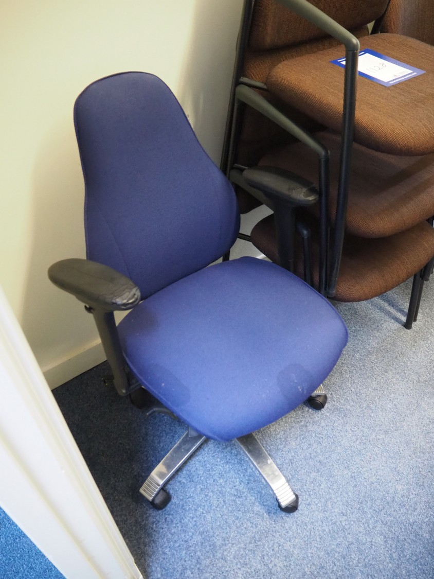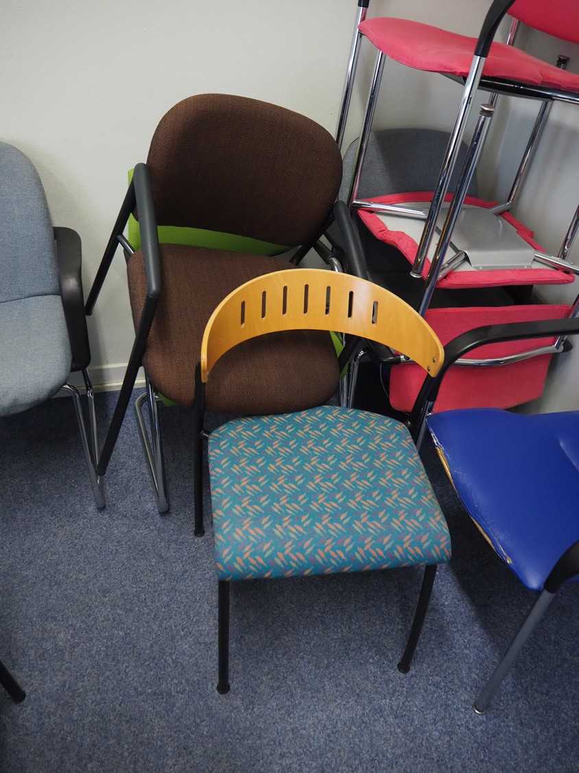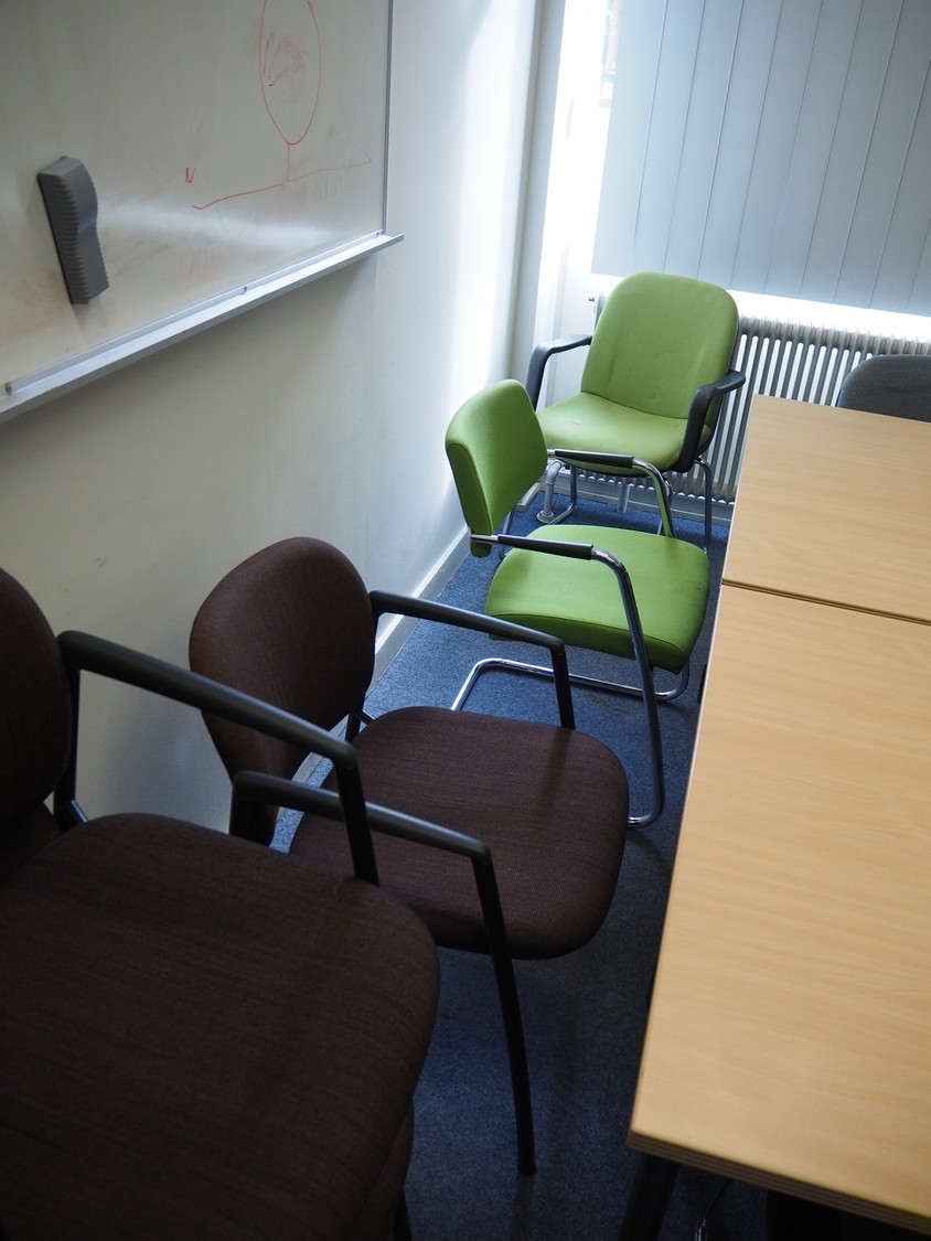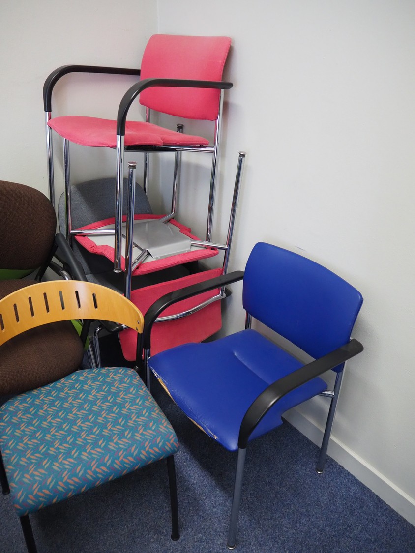 Office inventory consisting of: 2 desks, dimensions: (2x) 1600 mm x 1000 mm x 760 mm, 25 chairs, dimensions: (25x) 600 mm x 500 mm x 900 mm, white board. Without computer equipment.
