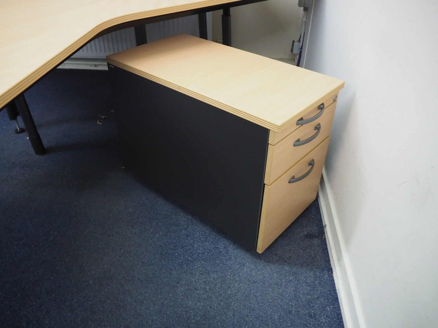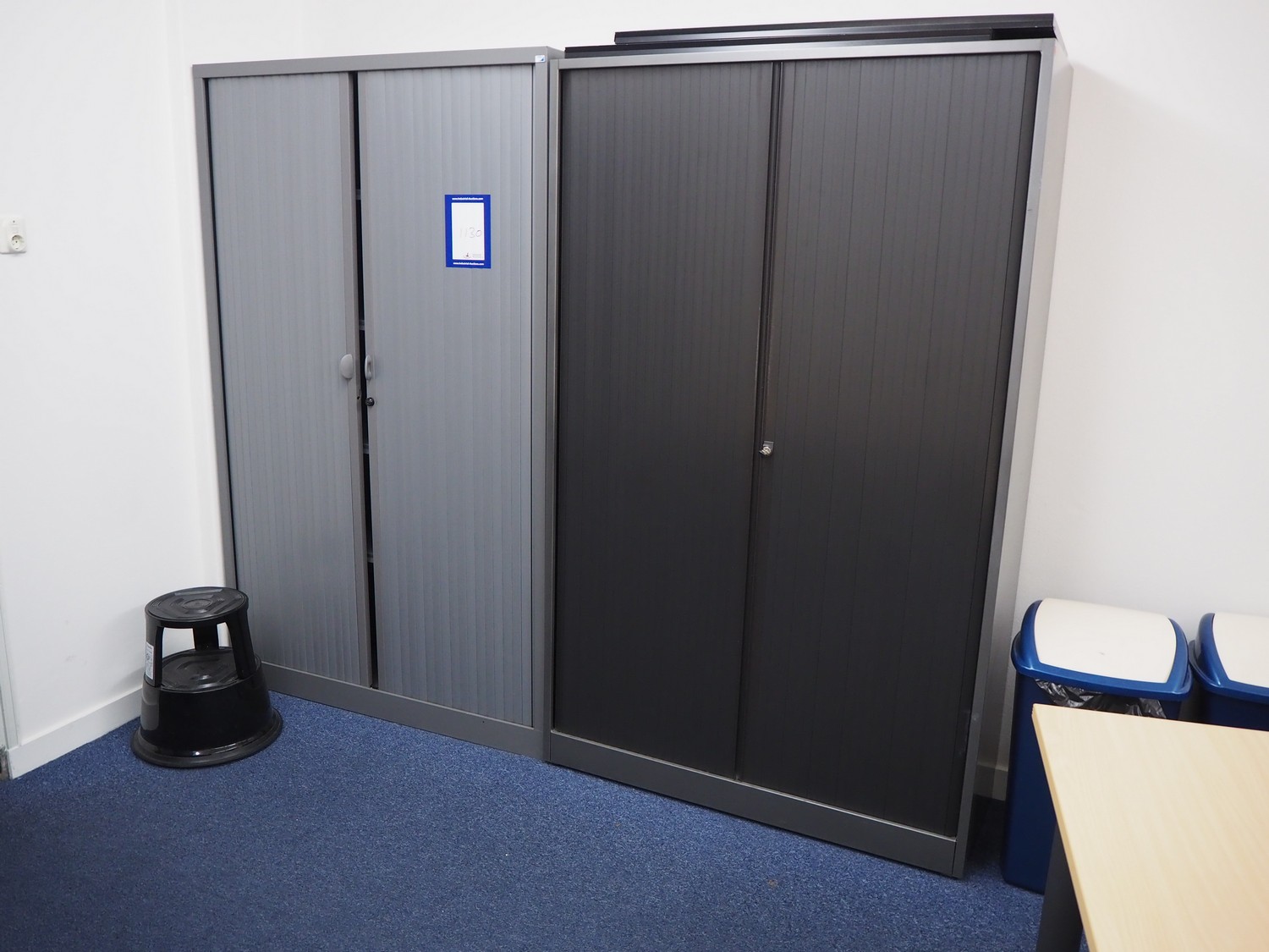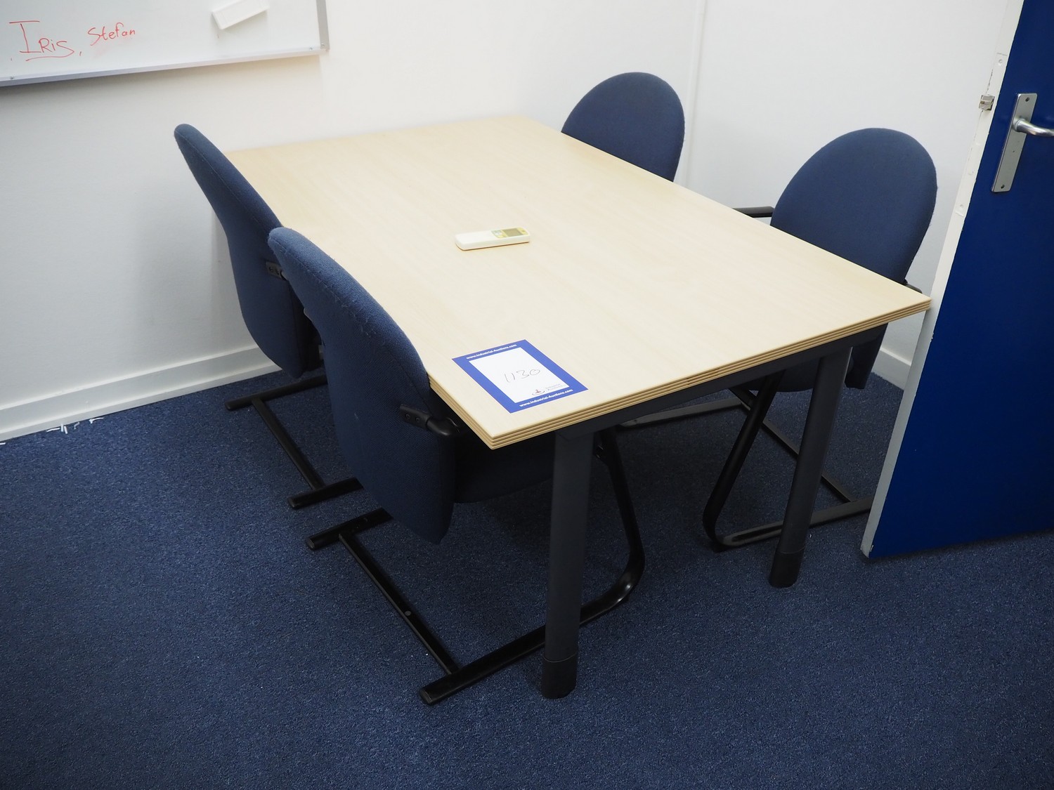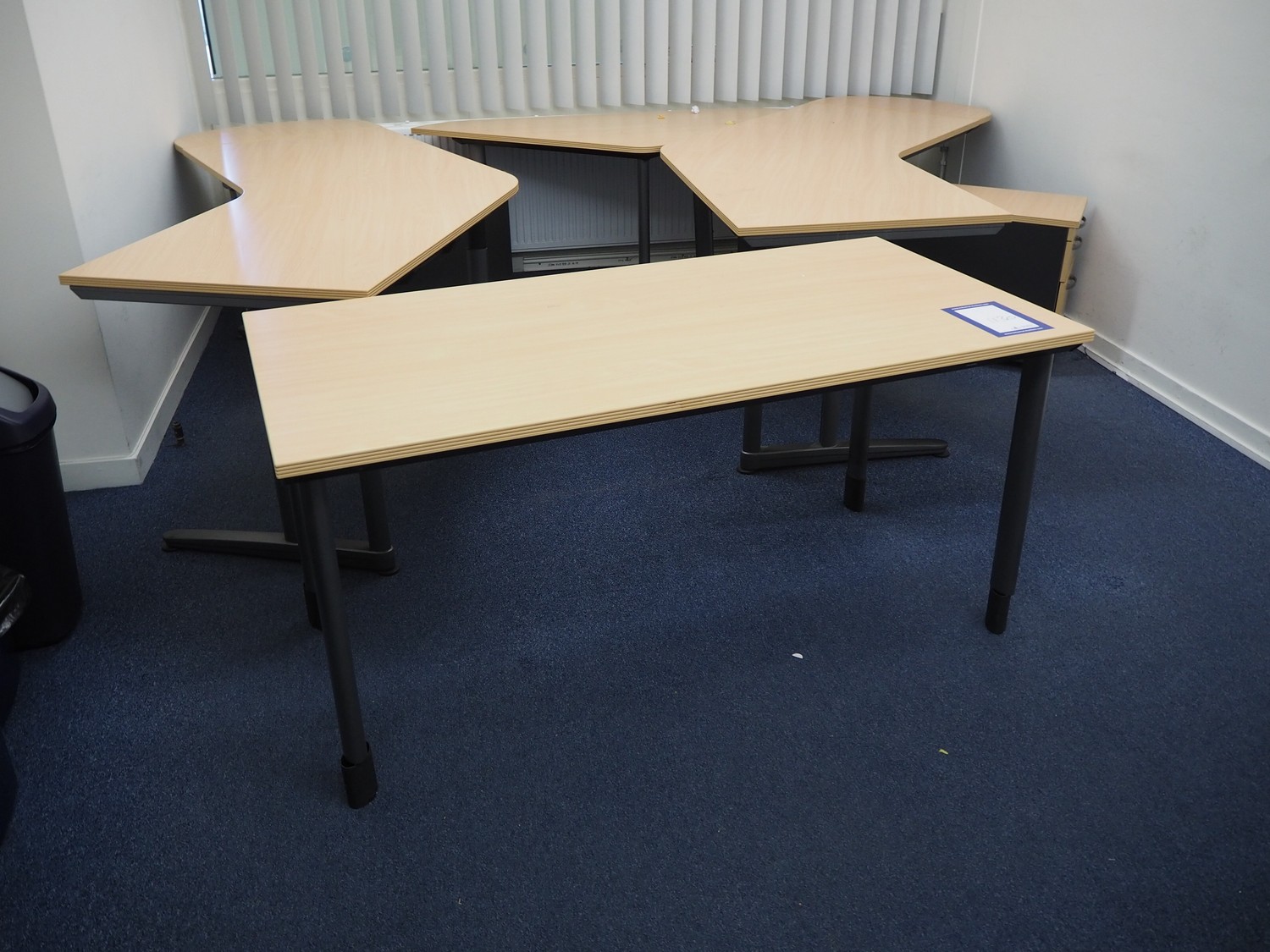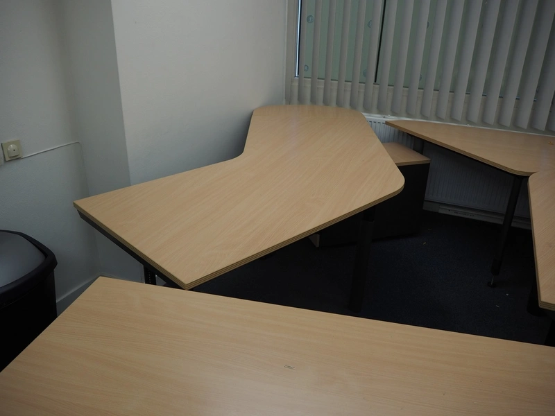 Office inventory consisting of: 5 desks, dimensions: (2x) 2600 mm x 1600 mm x 780 mm, 1600 mm x 1000 mm x 700 mm, 1600 mm x 800 mm x 780 mm, 1700 mm x 950 mm x 750 mm, 4 chairs, dimensions: (4x) 600 mm x 500 mm x 750 mm, 4 cabinets, dimensions: (2x) 800 mm x 420 mm x 580 mm, (2x) 1200 mm x 450 mm x 1950 mm, 3 waste bins, dimensions: (3x) 400 mm x 300 mm x 700 mm. Without computer equipment.