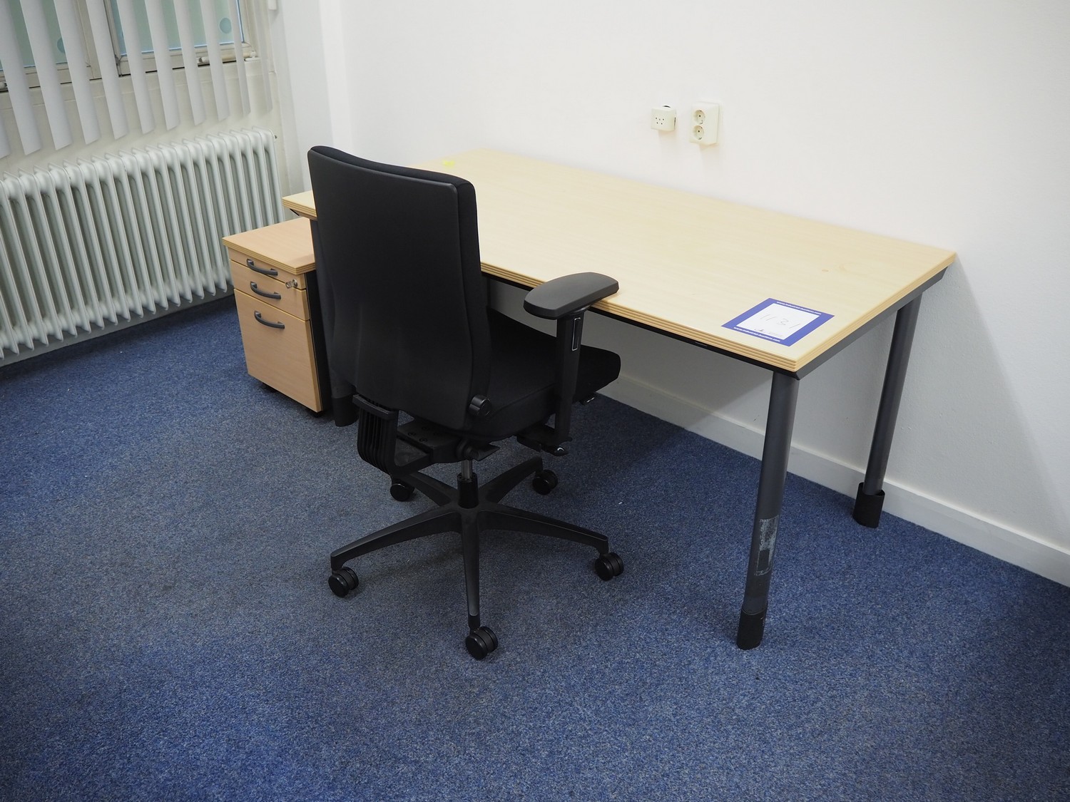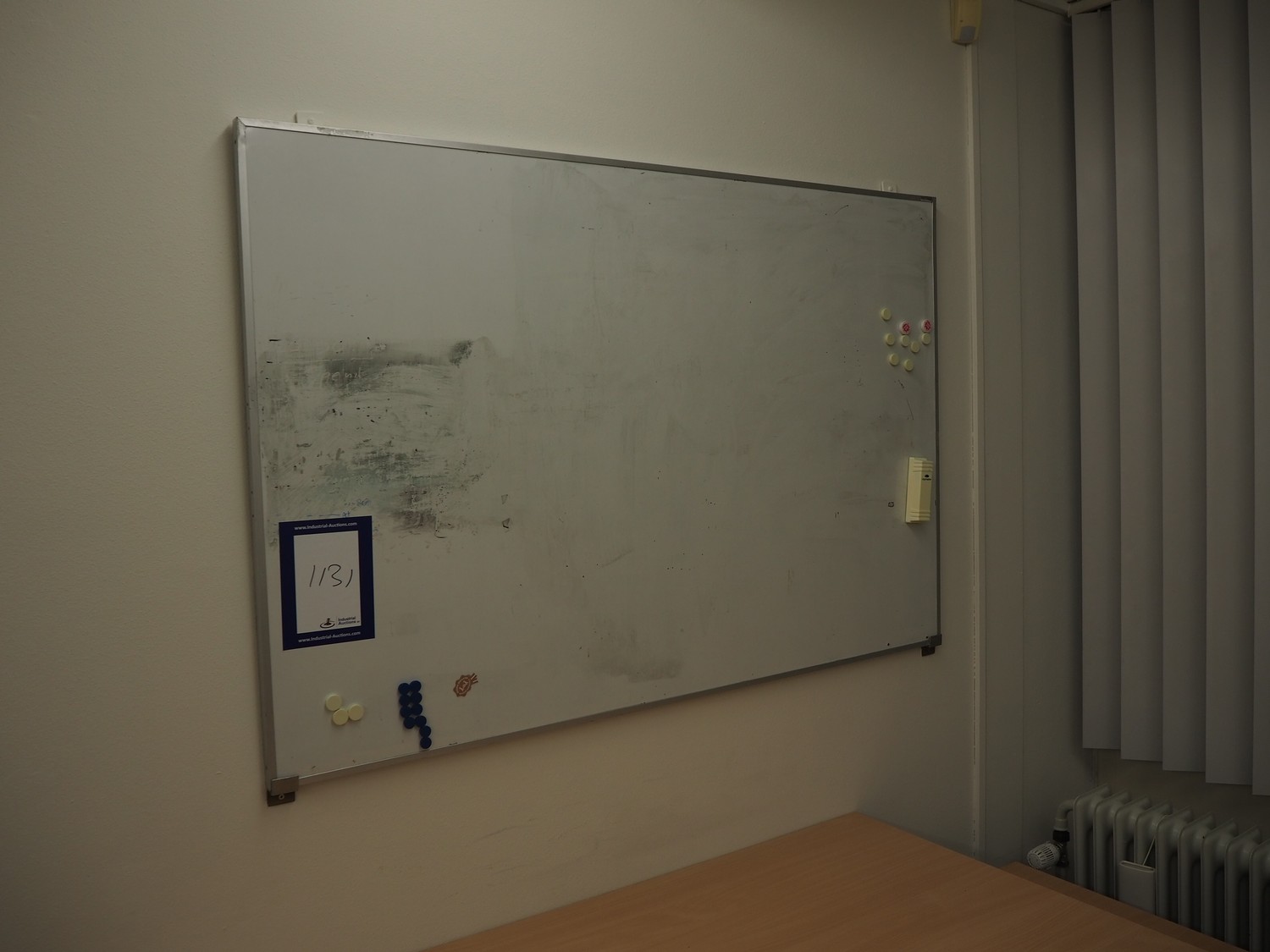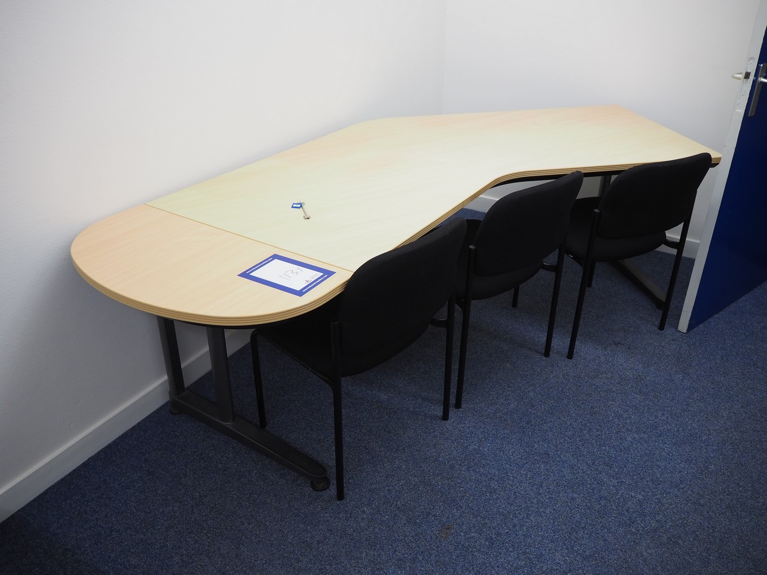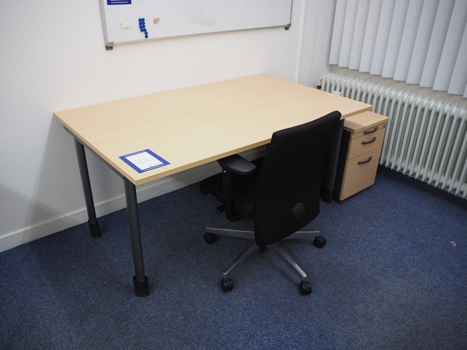 Office inventory consisting of: 4 desks, dimensions: (2x) 1600 mm x 800 mm x 740 mm, 2450 mm x 1500 mm x 740 mm, 1600 mm x 1000 mm x 740 mm, 5 chairs, dimensions: (3x) 560 mm x 600 mm x 800 mm, (2x) 700 mm x 600 mm x 900 mm, 3 cabinets, dimensions: (2x) 800 mm x 420 mm x 580 mm, white board. Without computer equipment.