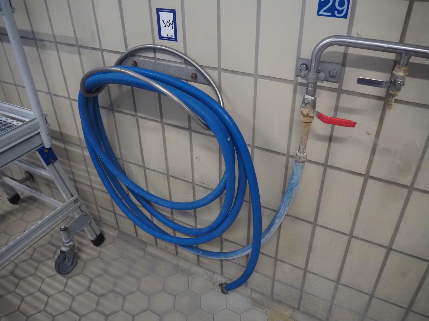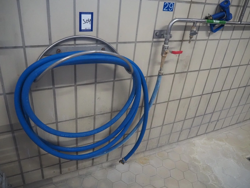 S/s hose reel with plastic hose, dimensions: 560 mm x 200 mm x 230 mm.