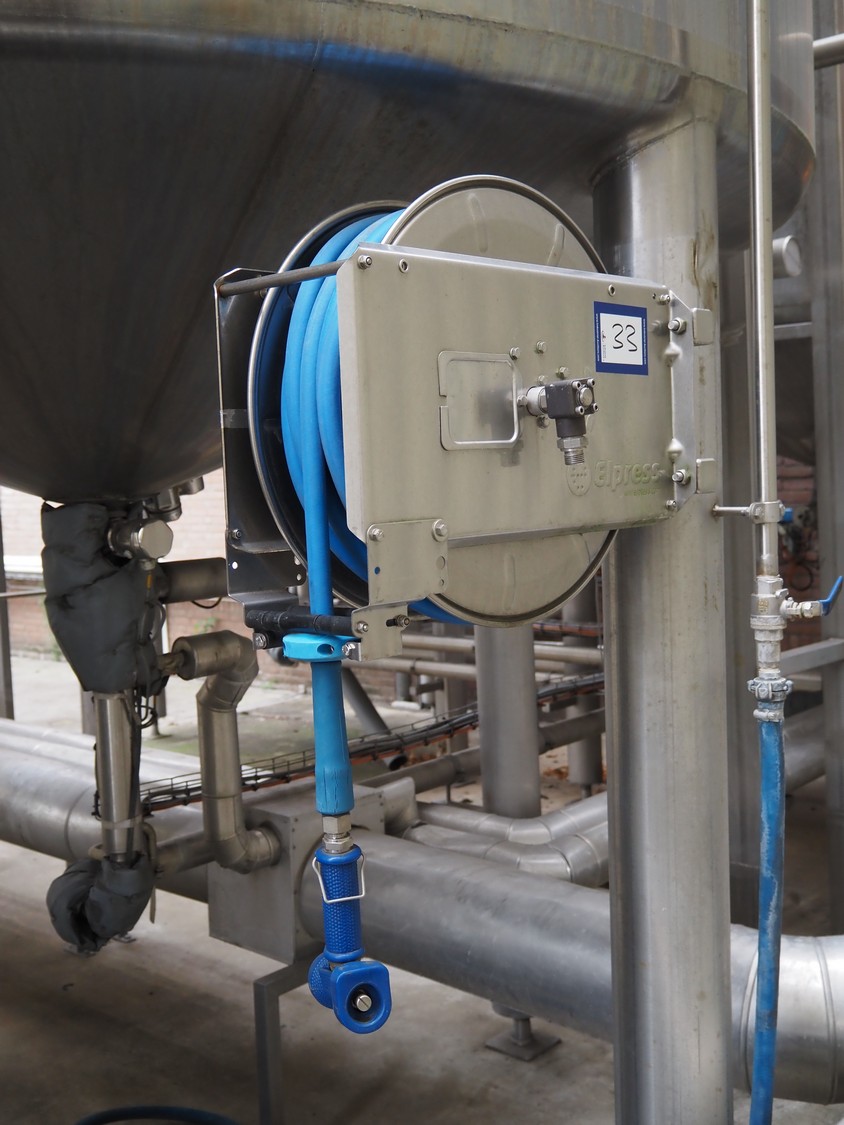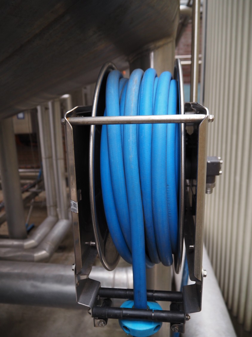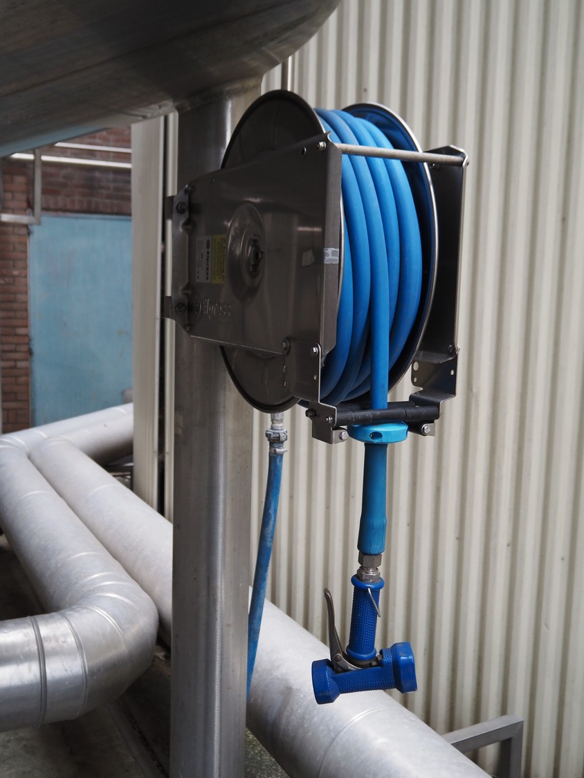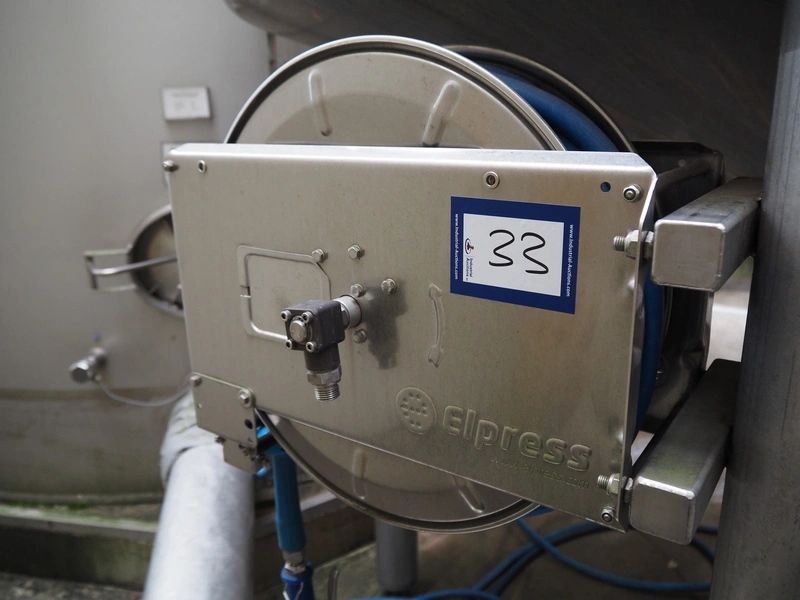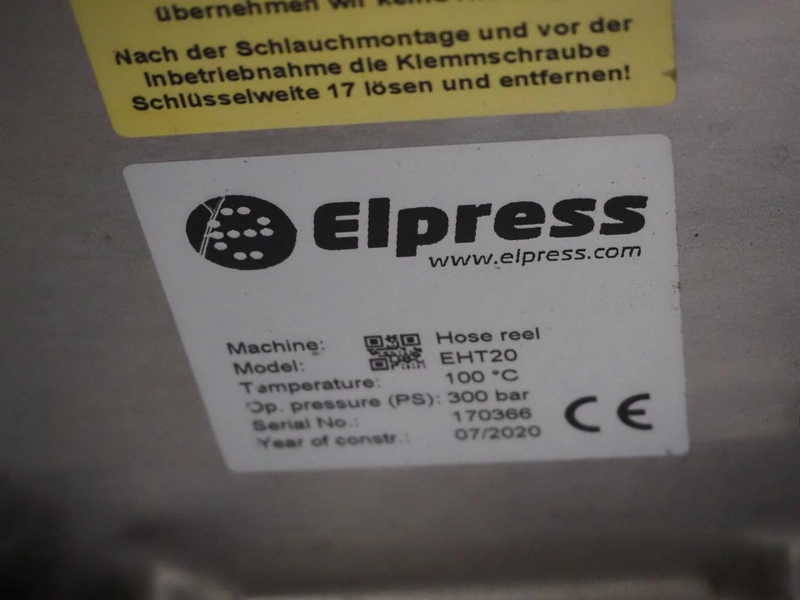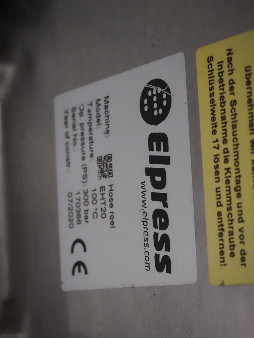 Elpress s/s hose reel with plastic hose and spray pistol, model: EHT20, serial number: 170366, year of construction: 07/2020, PS: max 300 bar, temperature: max 100 °C, dimensions: 600 mm x 300 mm x 560 mm.