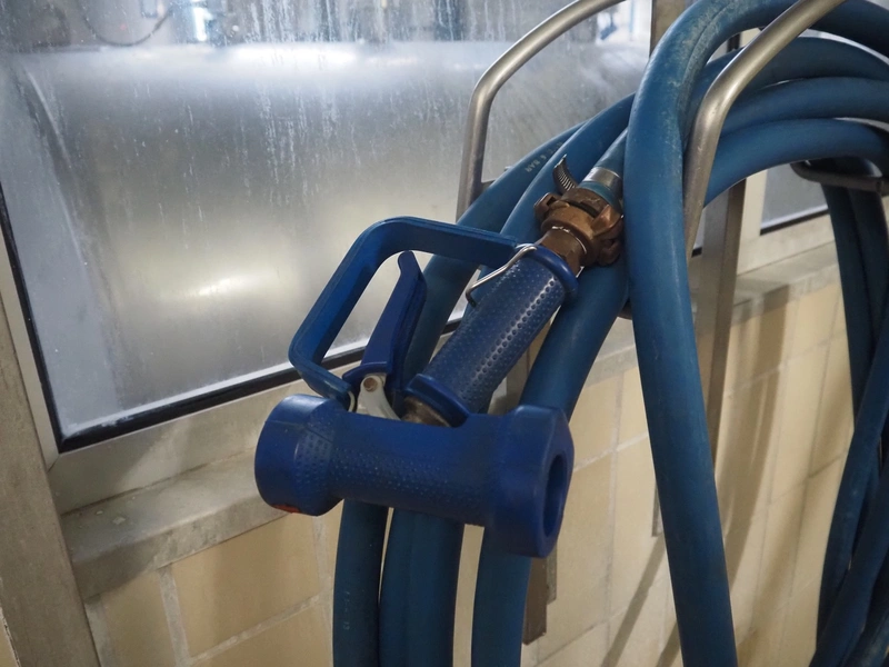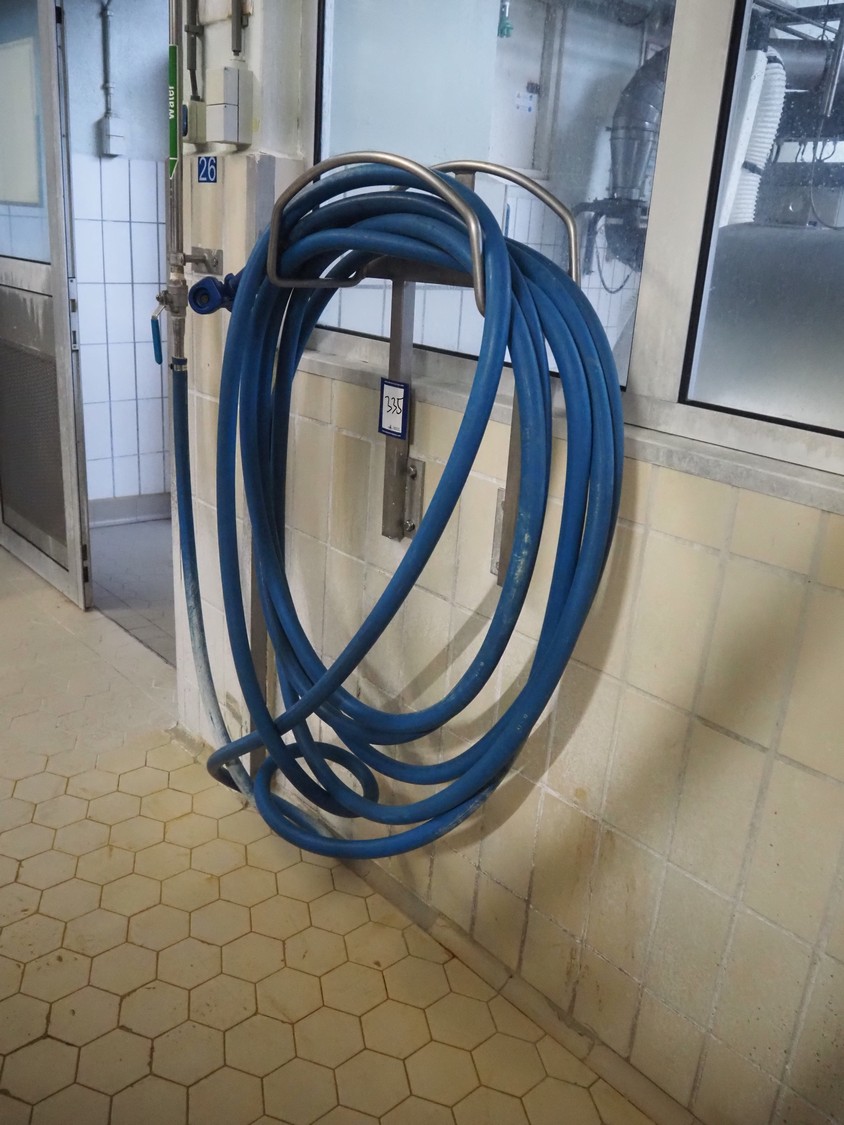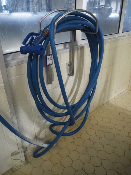 S/s hose reel with plastic hose and spray pistol, dimensions: 520 mm x 250 mm x 660 mm.