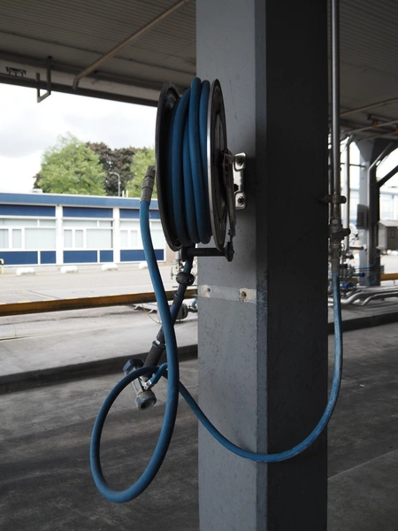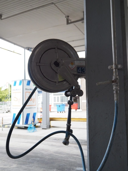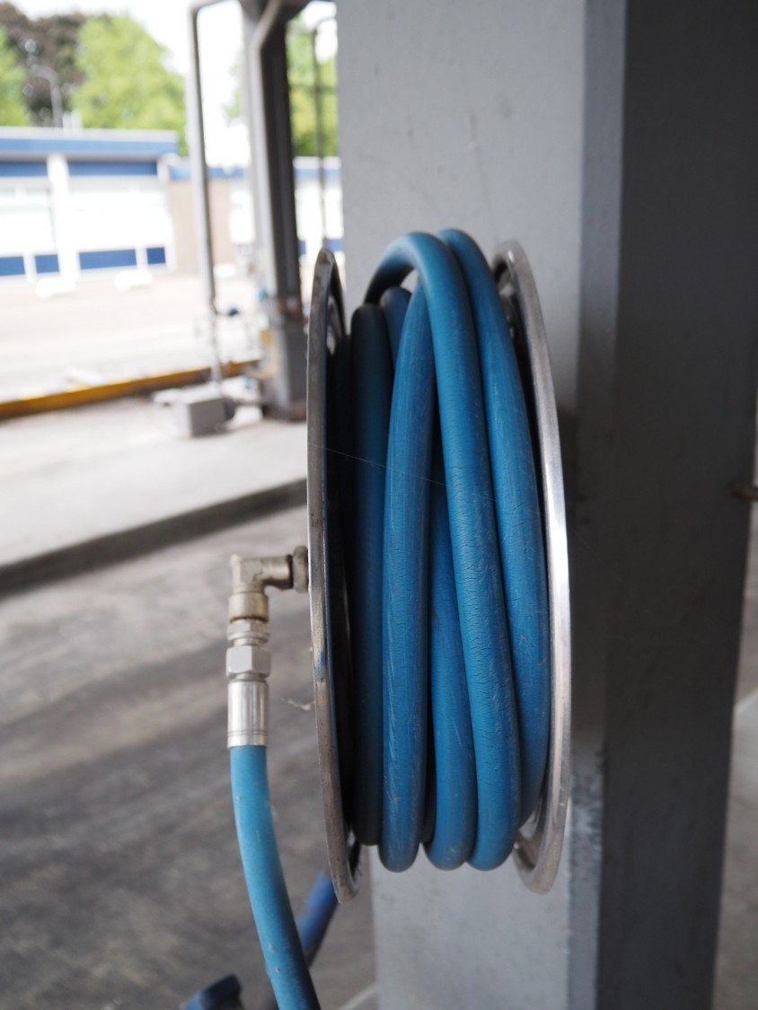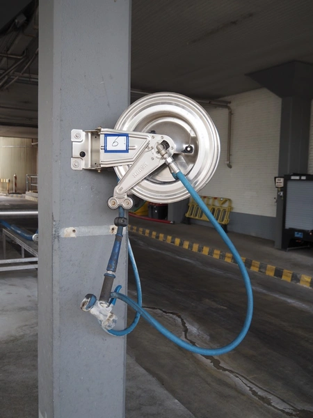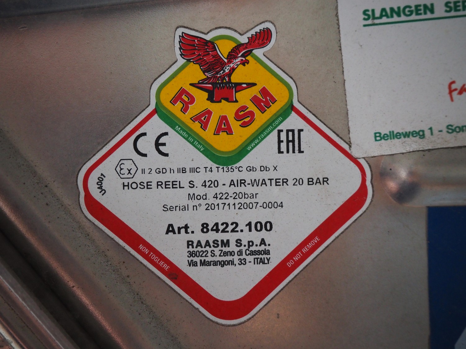 Raasm S.p.A. s/s hose reel with plastic hose and spray pistol, model: S420, serial number: 2017112007-0004, dimensions: 560 mm x 300 mm x 500 mm.