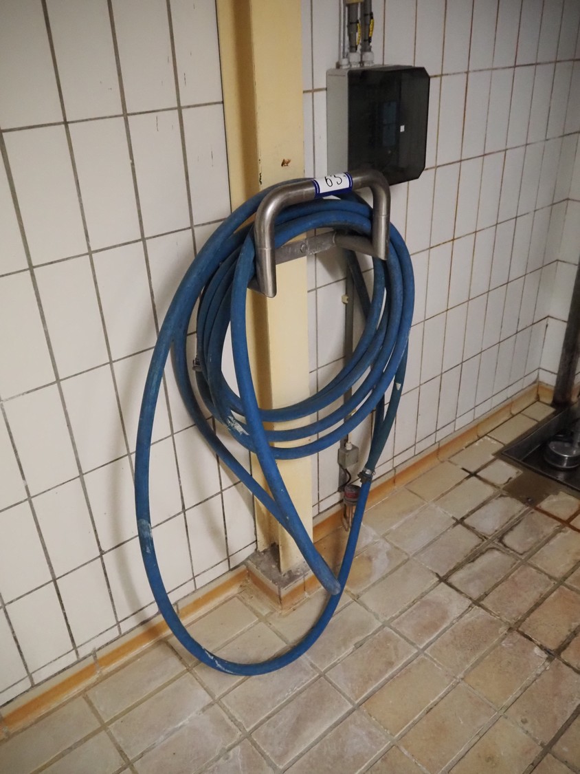 S/s hose reel with plastic hose, dimensions: 380 mm x 150 mm x 220 mm.