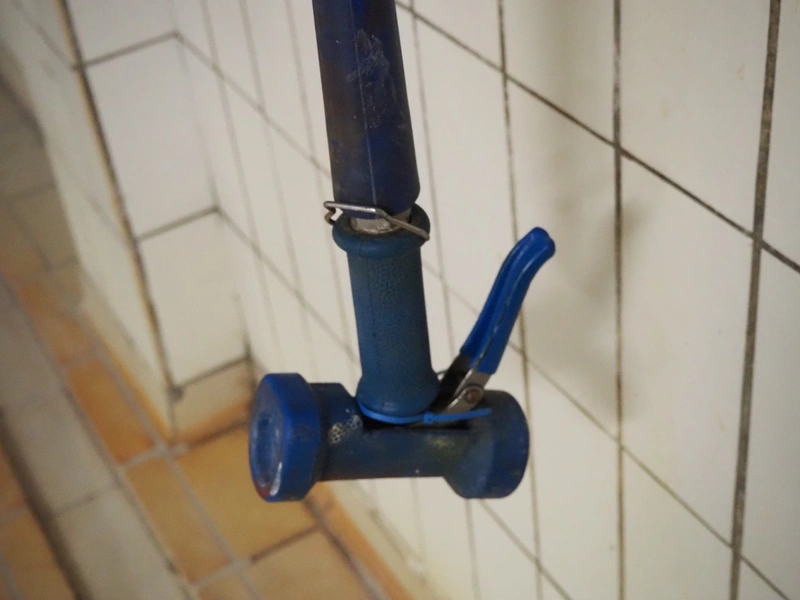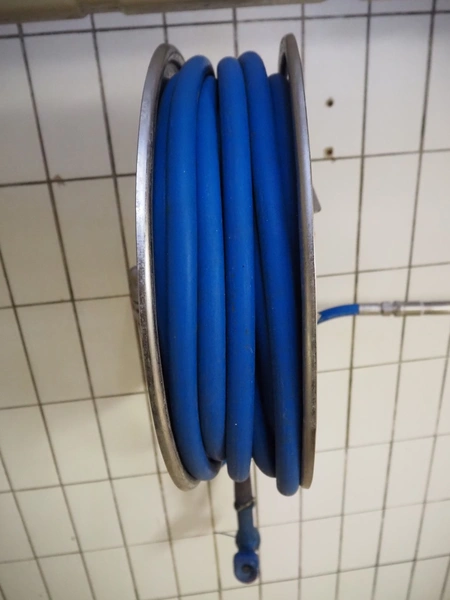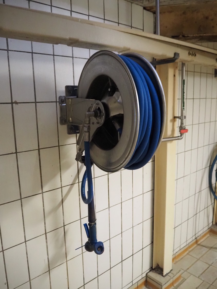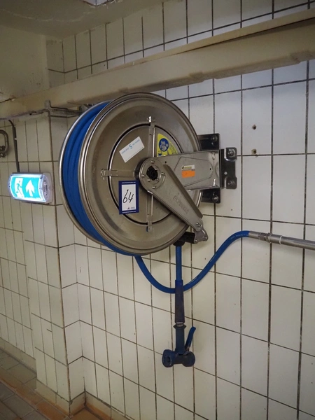 Ecodora s/s hose reel with plastic hose and spray pistol, dimensions: 650 mm x 250 mm x 500 mm.