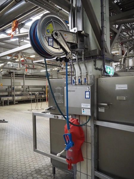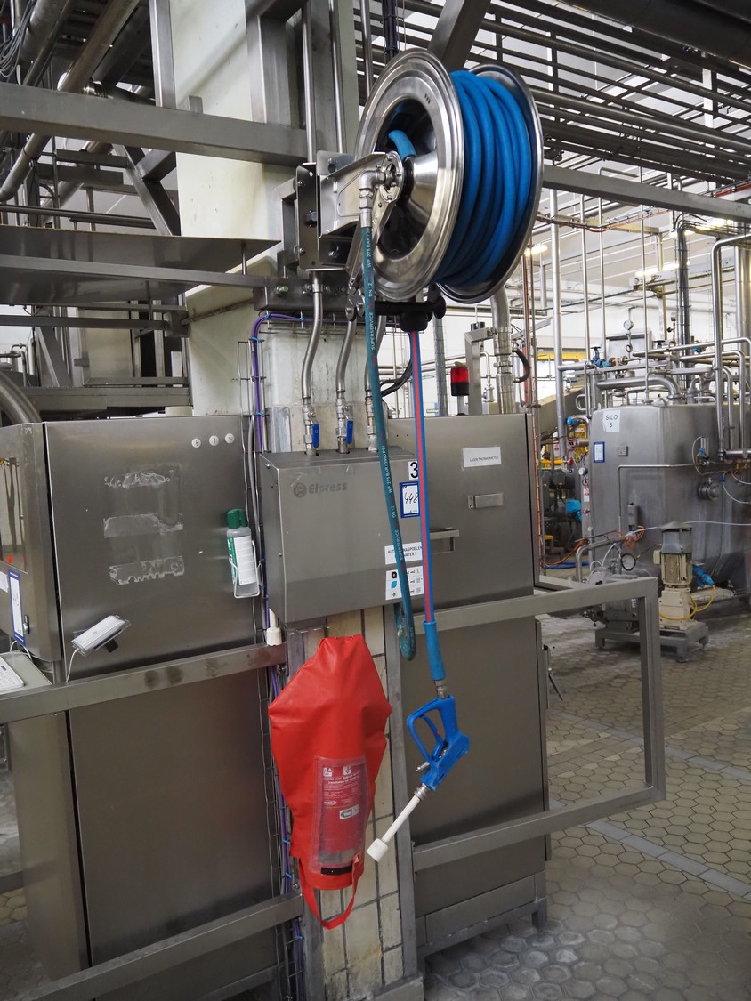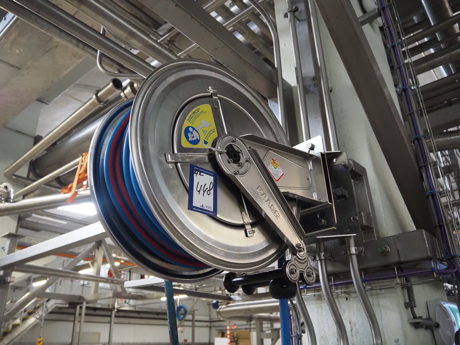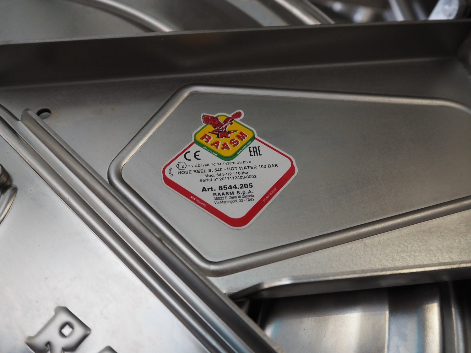 Raasm S.p.A. s/s hose reel with plastic hose and spray pistol, model: 544-1/2, serial number: 2017112408-0002, maximum pressure: 100 bar, dimensions: 720 mm x 350 mm x 550 mm and Elpress soap mixing station, type: mixing station: 83801050, serial number: 20006389-008, year of construction: 11/2020, dimensions: 470 mm x 120 mm x 460 mm.