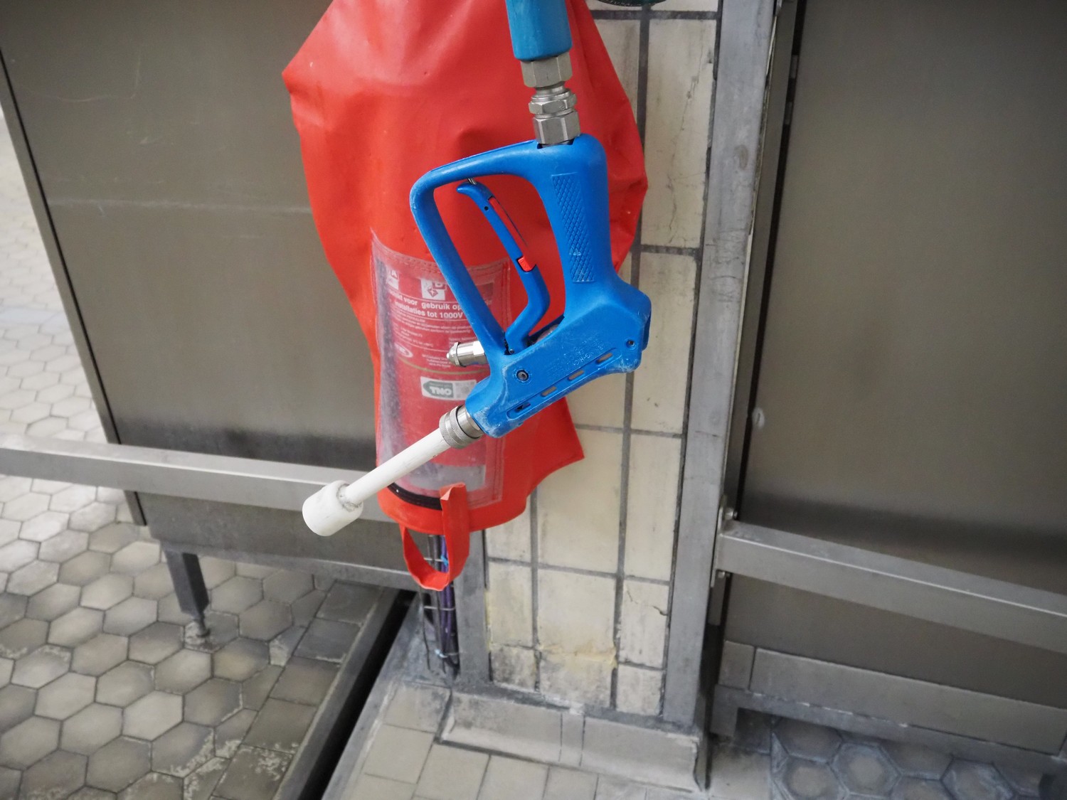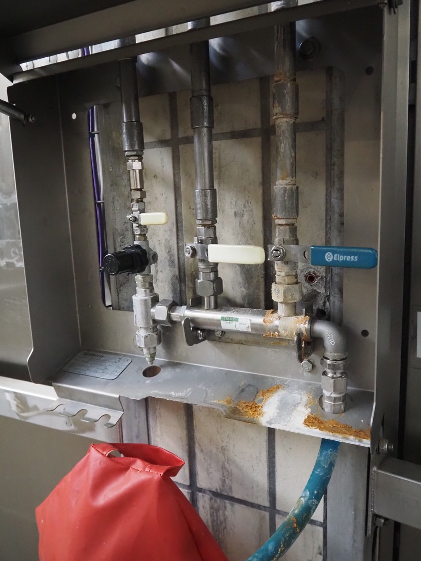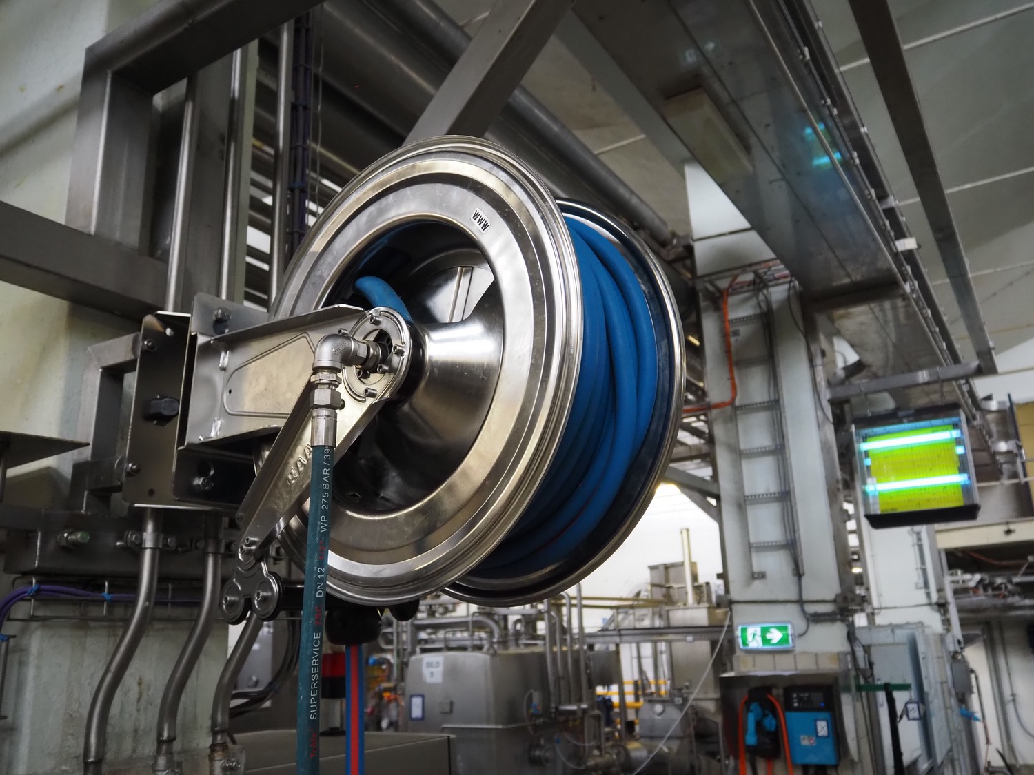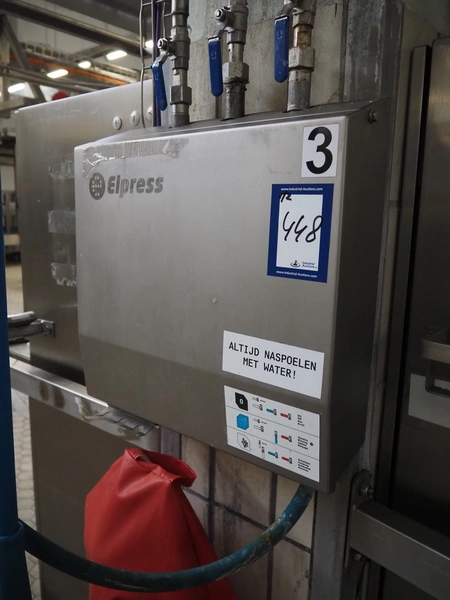 Raasm S.p.A. s/s hose reel with plastic hose and spray pistol, model: 544-1/2, serial number: 2017112408-0002, maximum pressure: 100 bar, dimensions: 720 mm x 350 mm x 550 mm and Elpress soap mixing station, type: mixing station: 83801050, serial number: 20006389-008, year of construction: 11/2020, dimensions: 470 mm x 120 mm x 460 mm.