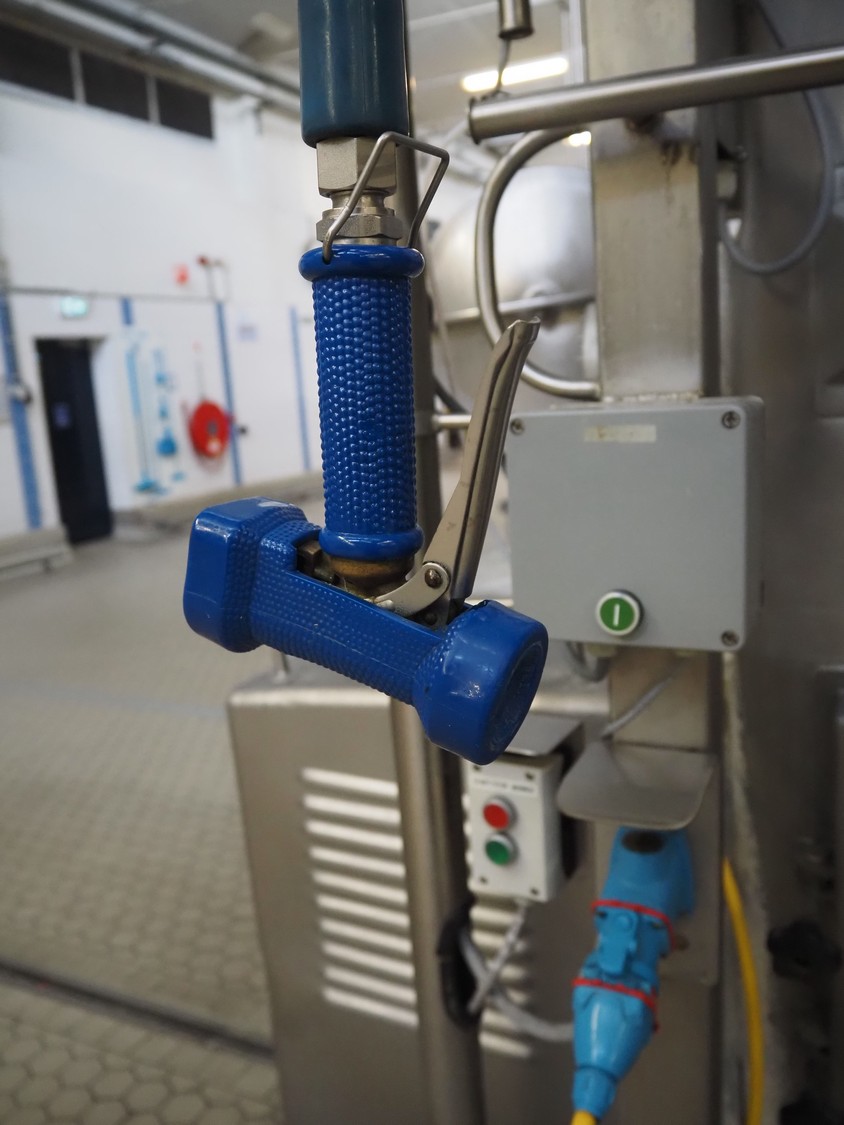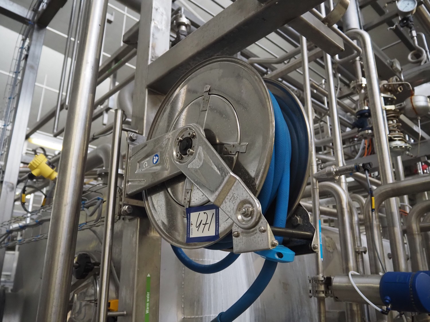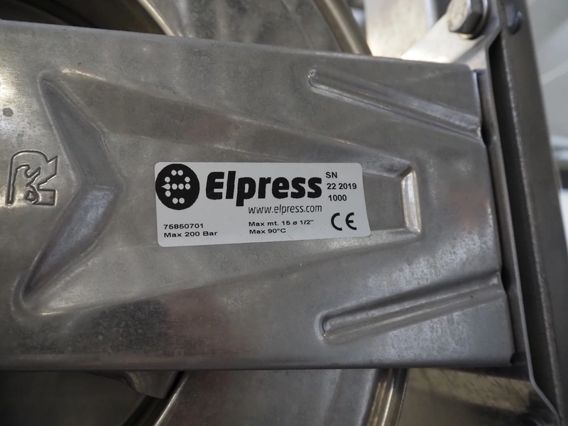 Elpress s/s hose reel with plastic hose and spray pistol, maximum pressure: 200 bar, dimensions: 500 mm x 250 mm x 500 mm.