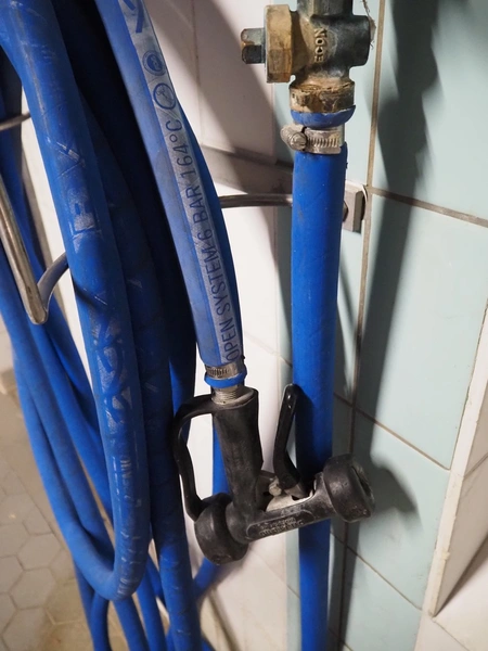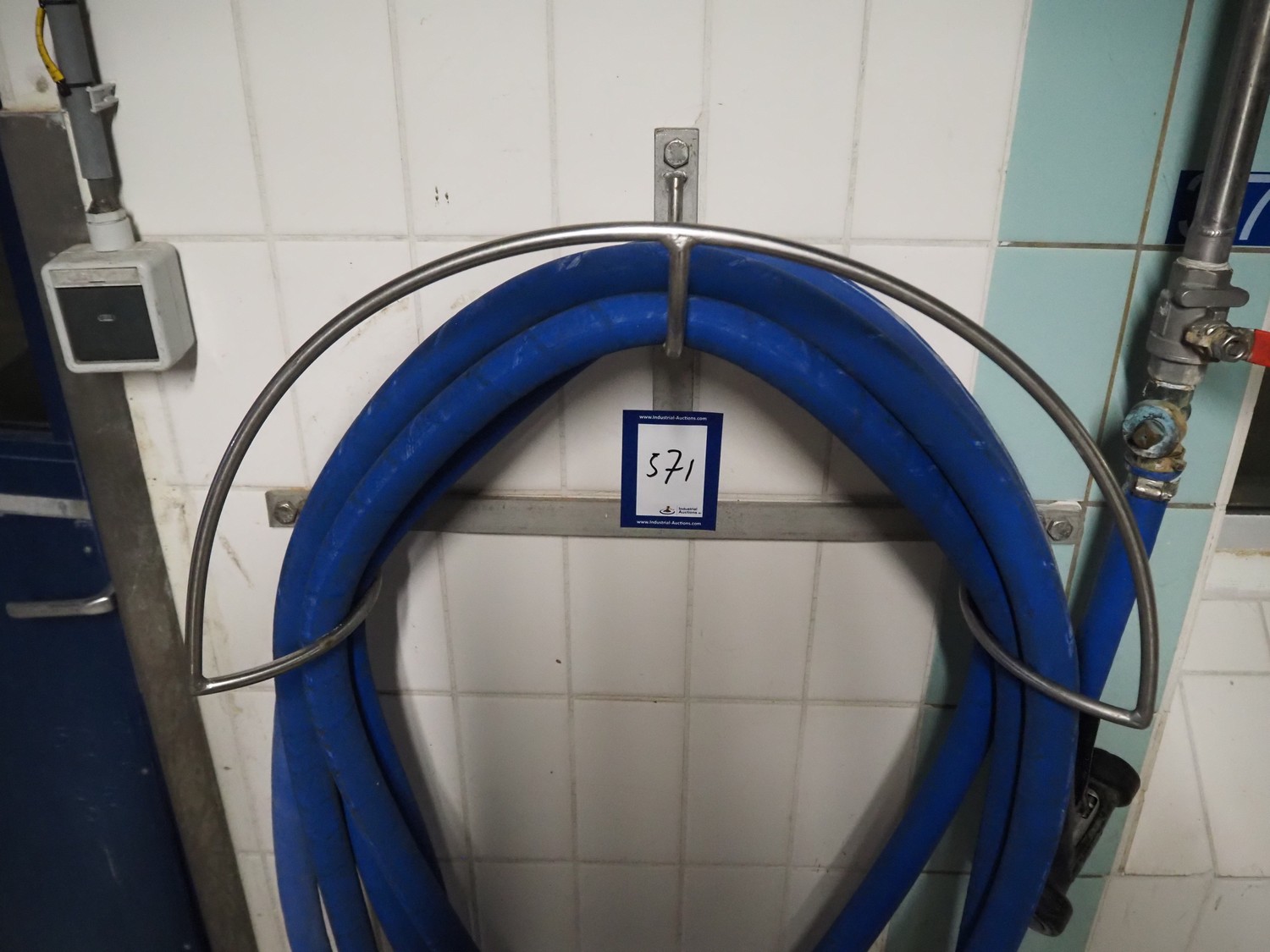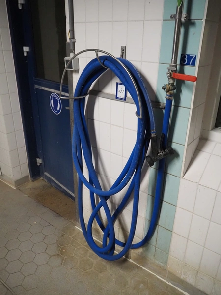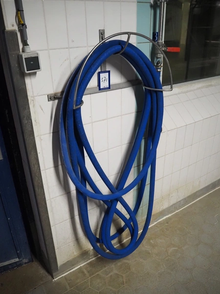 S/s hose reel with plastic hose and pistol, dimensions reel: 580 mm x 240 mm x 350 mm.