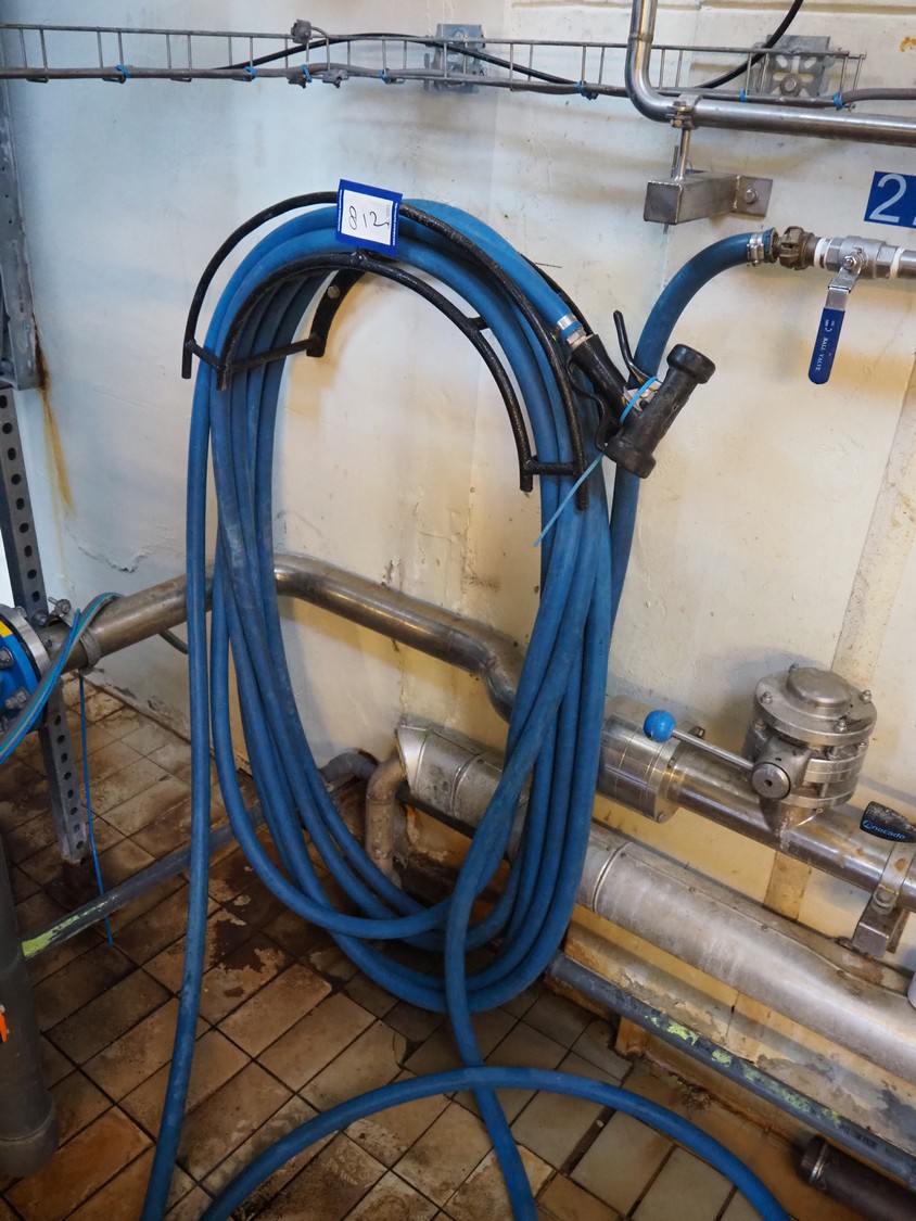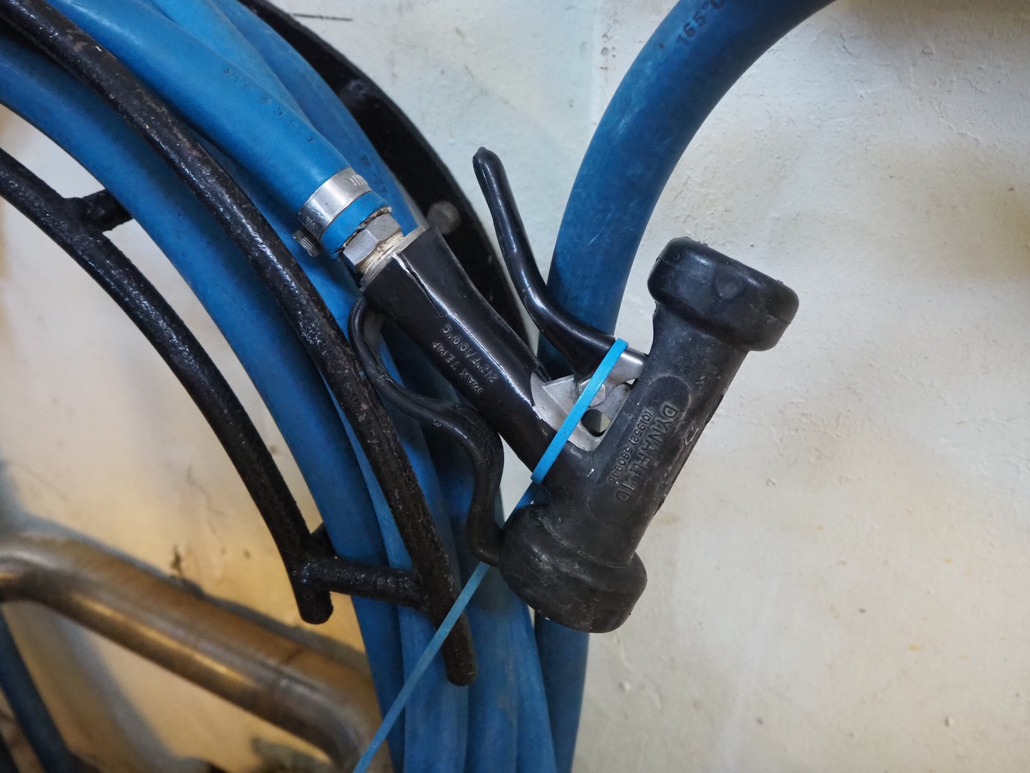 Steel hose reel with plastic hose and spray pistol, dimensions: 700 mm x 240 mm x 340 mm.