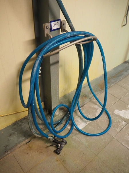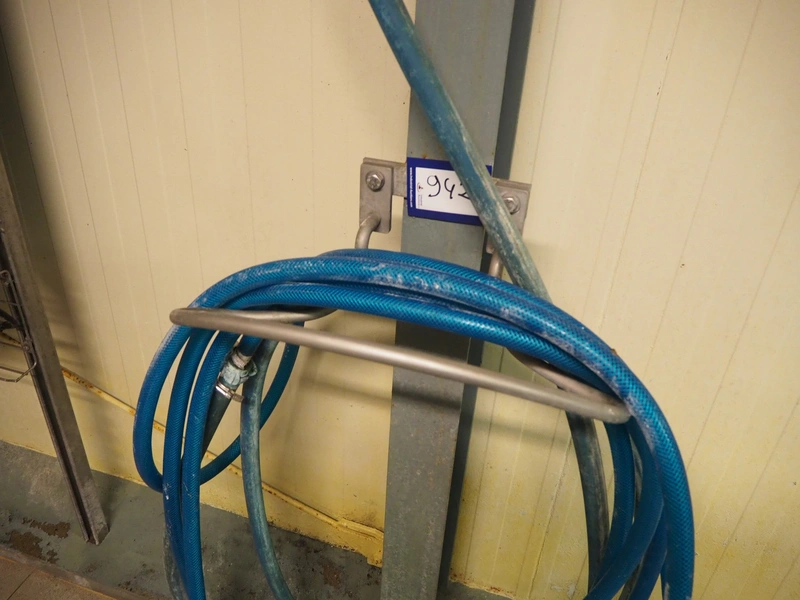 S/s hose reel with plastic hose and spray pistol, dimensions reel: 500 mm x 350 mm x 200 mm.