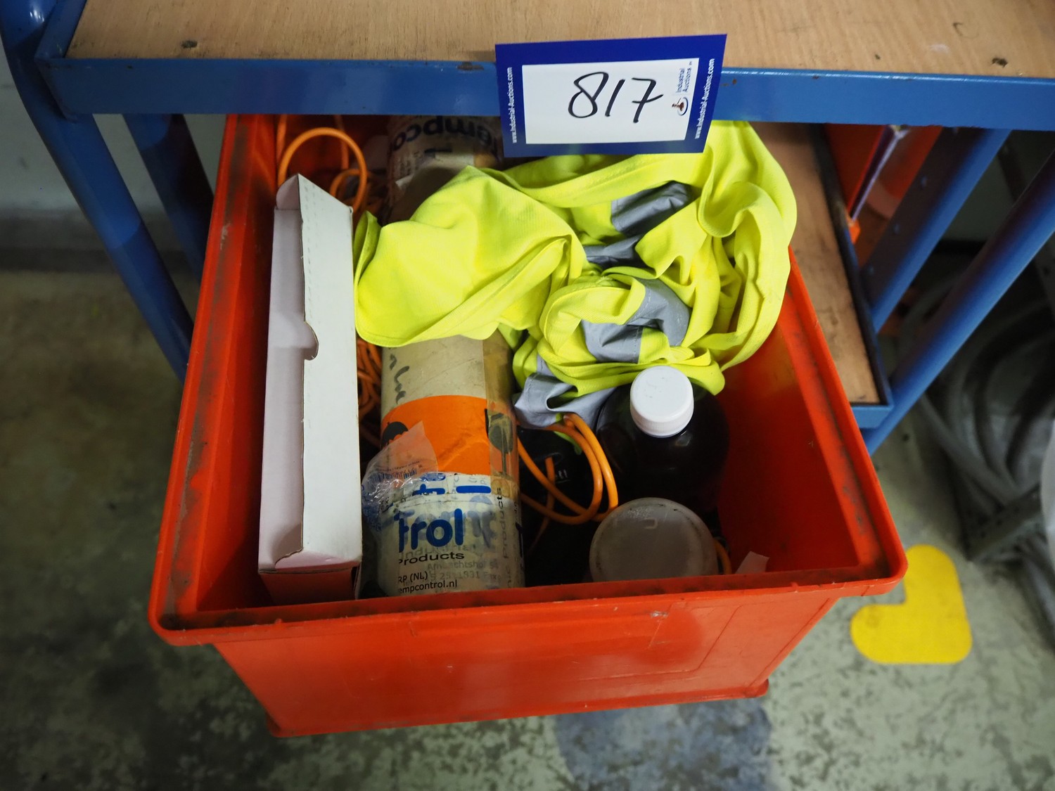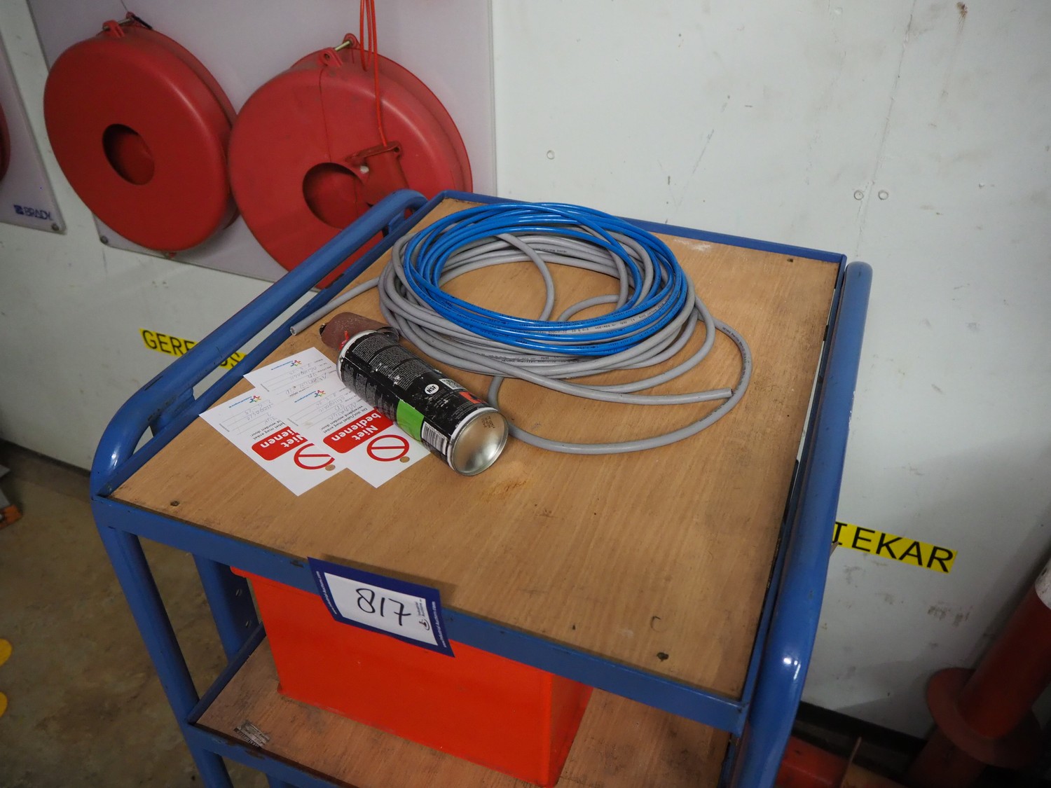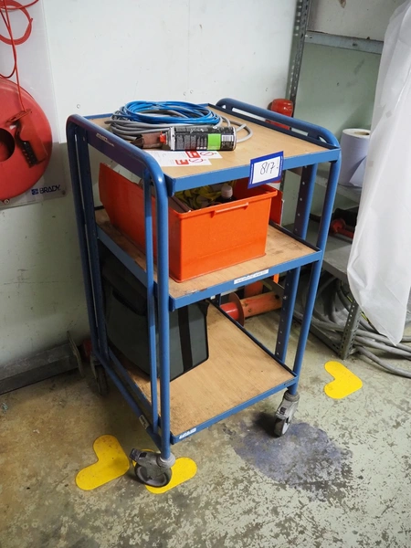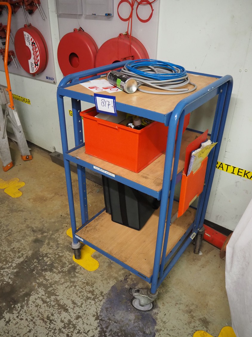 Steel trolley, dimensions: 640 mm x 560 mm x 1100 mm. With content.