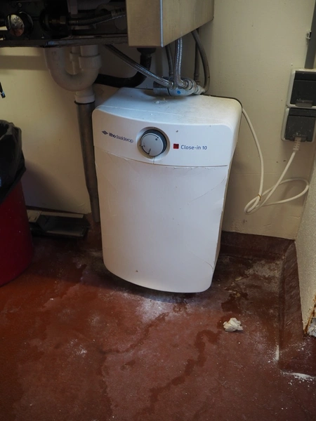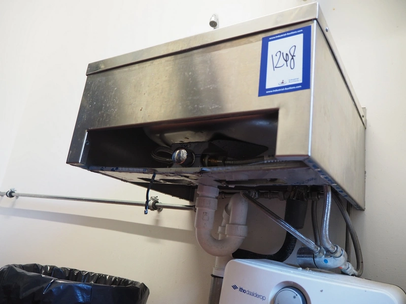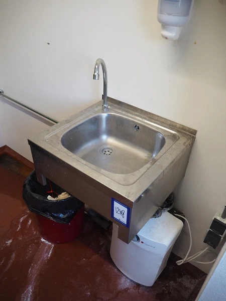 S/s sink with faucet, boiler, soap dispenser and paper dispenser, sink dimensions: 500 mm x 450 mm x 500 mm, boiler dimensions: 300 mm x 250 mm x 500 mm.