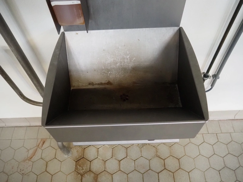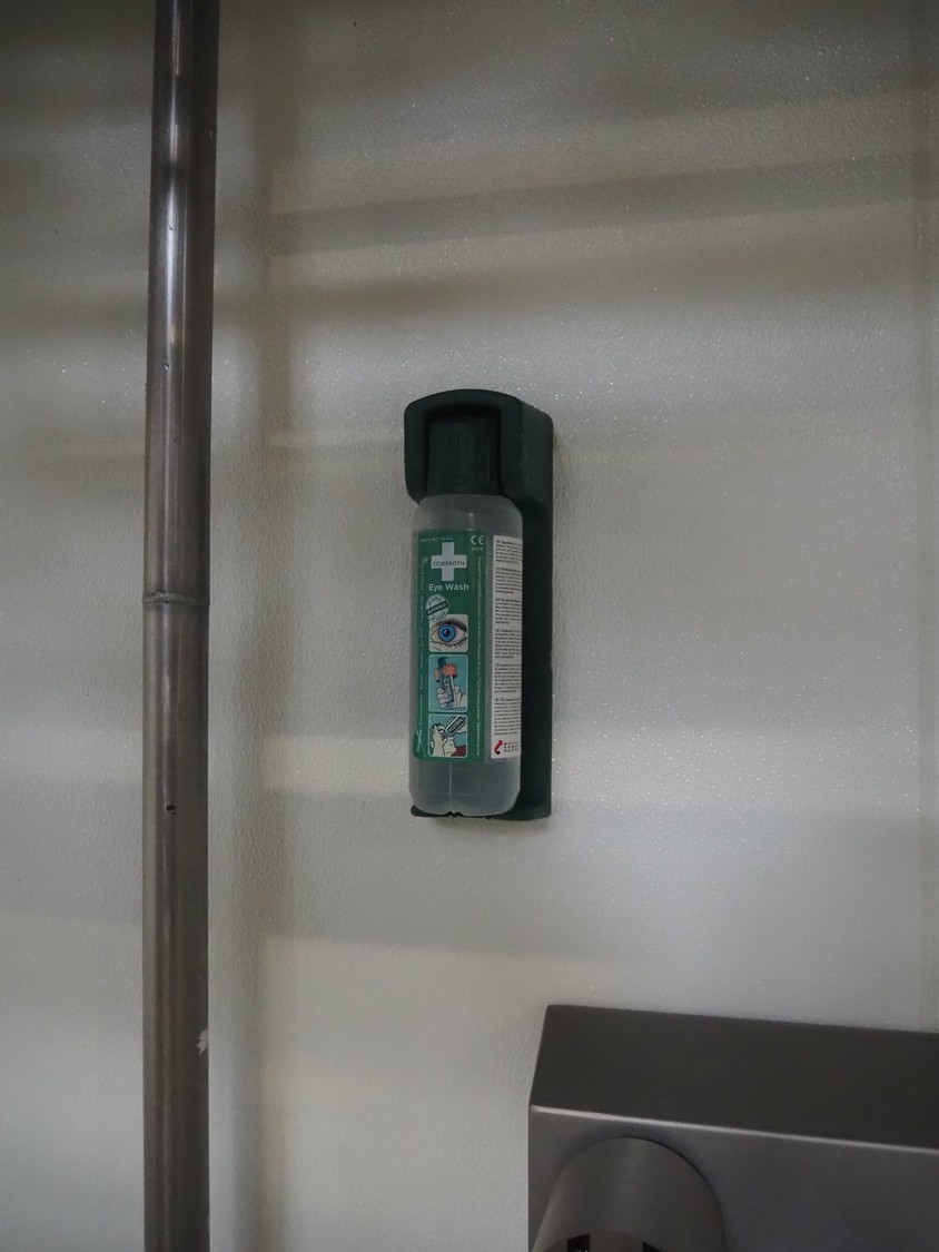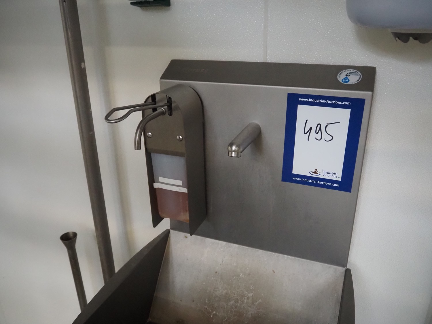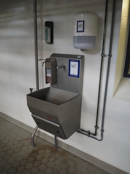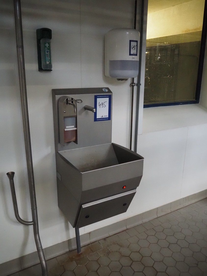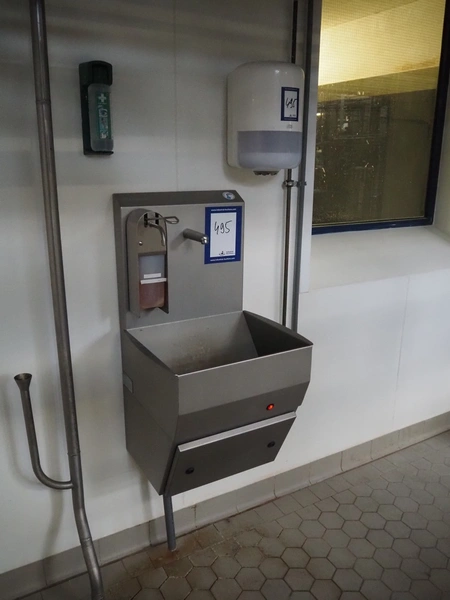 S/s sink with faucet, soap dispenser, paper dispenser and Cederroth eye wash, sink dimensions: 500 mm x 470 mm x 930 mm, paper dispenser dimensions: 240 mm x 250 mm x 400 mm, eye wash dimensions: 100 mm x 100 mm x 260 mm.