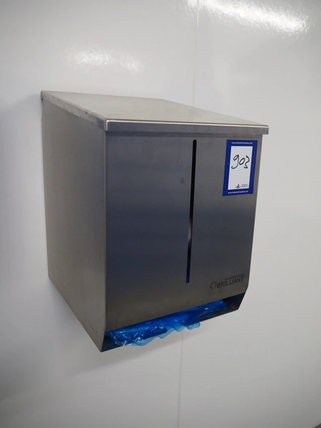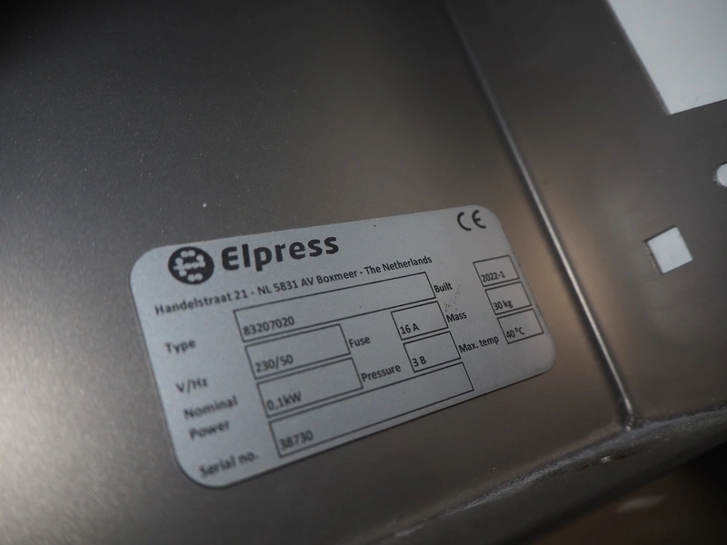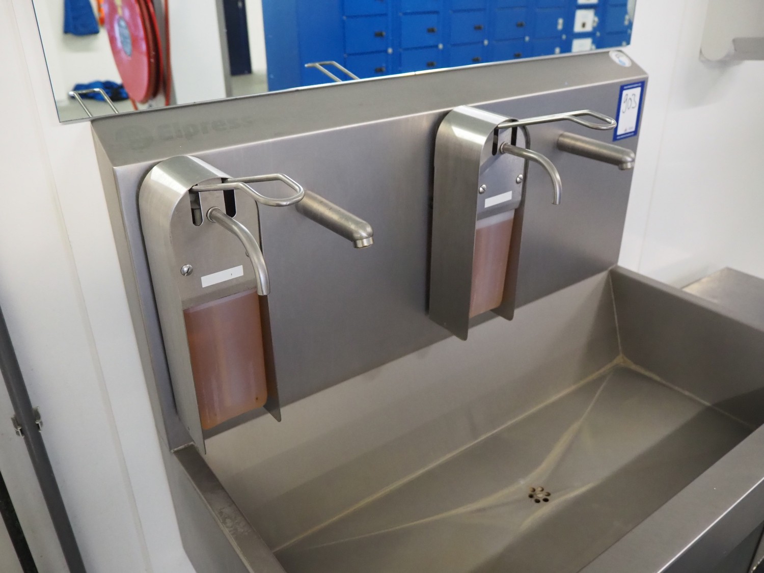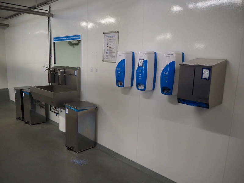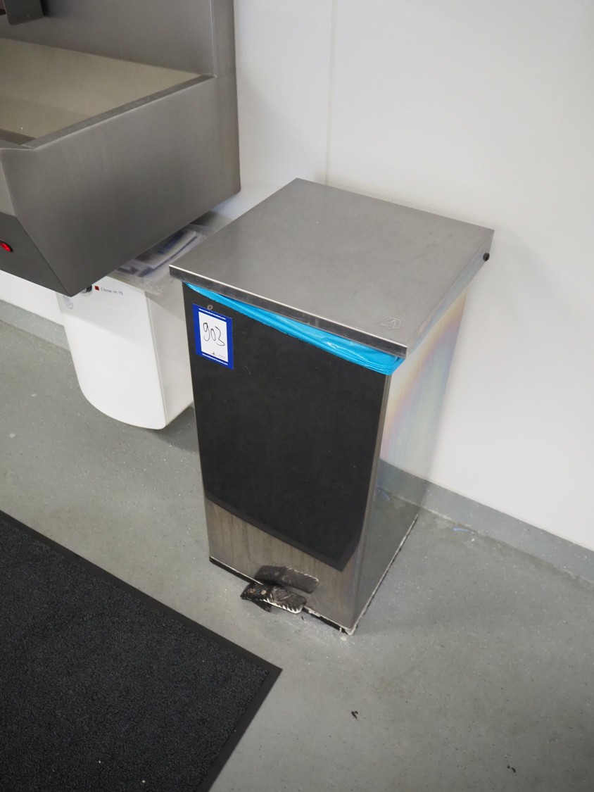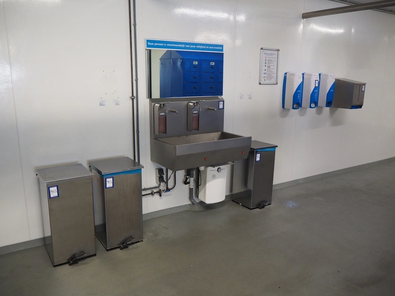 Elpress s/s sink, type: 83207020, serial number: 38730, year of construction: 2022-1, 230 V, 50 Hz, 16 A, 0.1 kW, dimensions: 950 mm x 950 mm x 660 mm, 3 s/s waste bins, dimensions: (3x) 390 mm x 390 mm x 750 mm and 3 hair net dispensers.