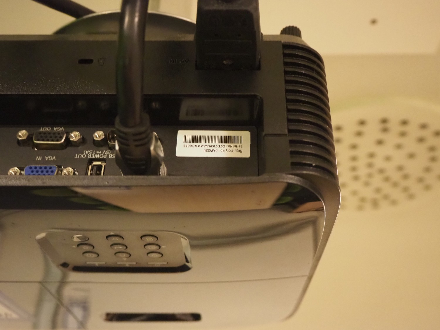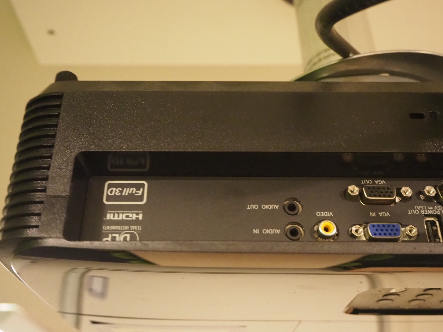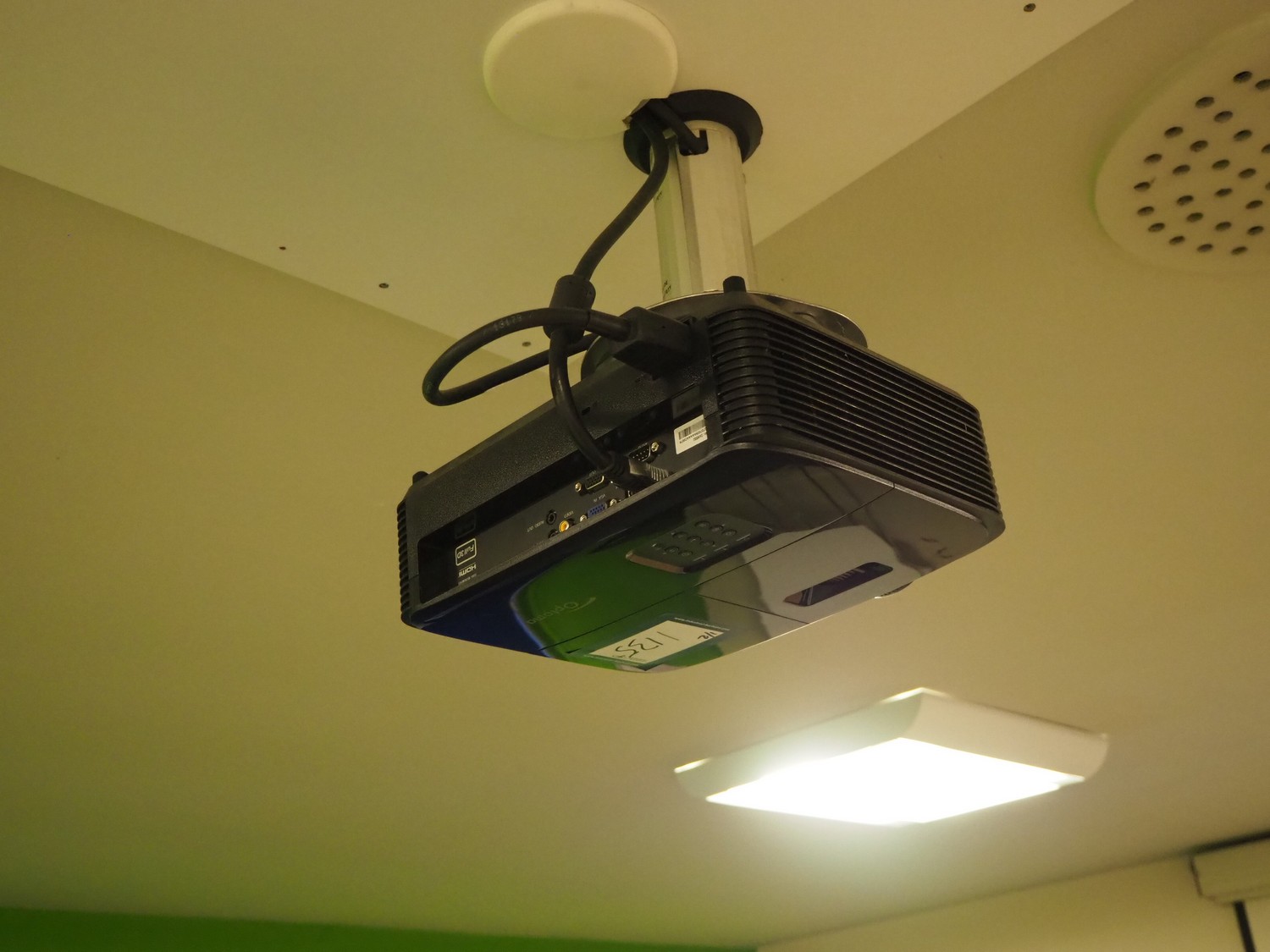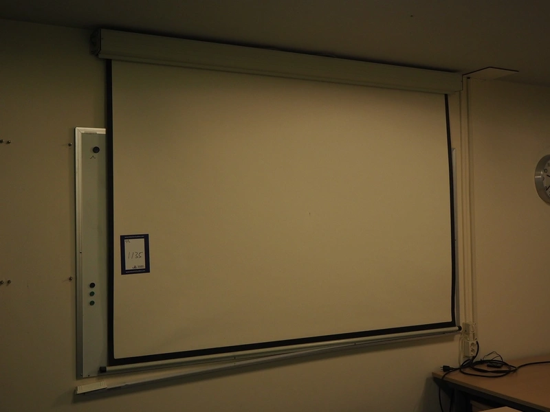 Optoma beamer with projection screen, beamer dimensions: 400 mm x 300 mm x 150 mm, screen dimensions: 2300 mm x 1600 mm.