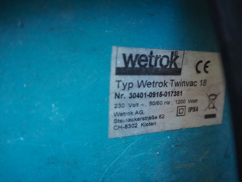 Wetrok vacuum cleaner, type: Wetrok Twinvac 18, number: 30401-0915-017381, 230 V, 1 Ph, 50/60 Hz, 1200 W, dimensions: 500 mm x 400 mm x 650 mm.
