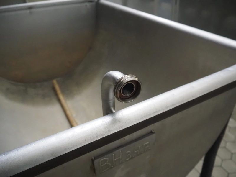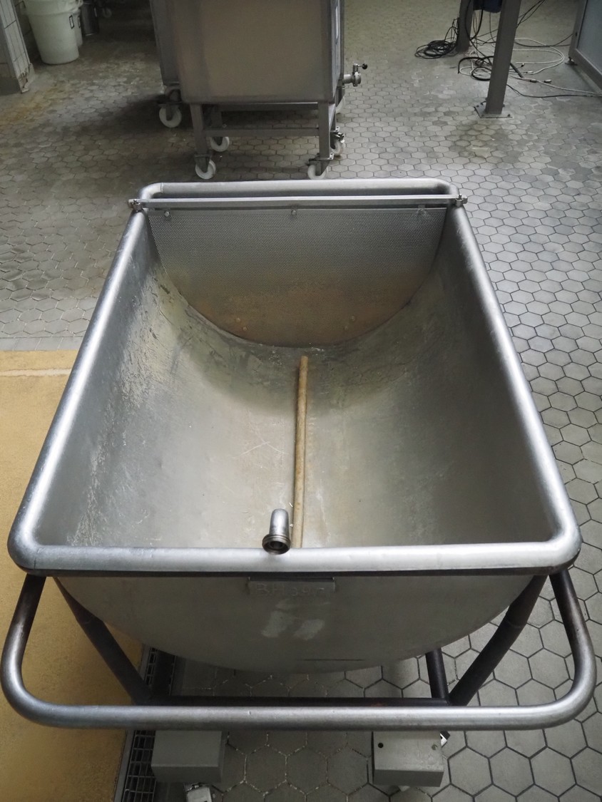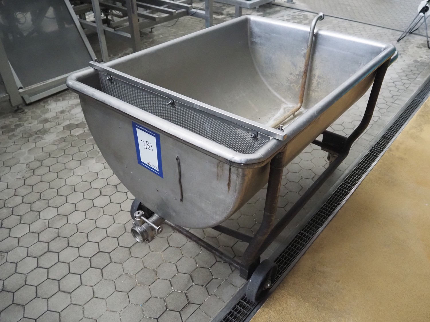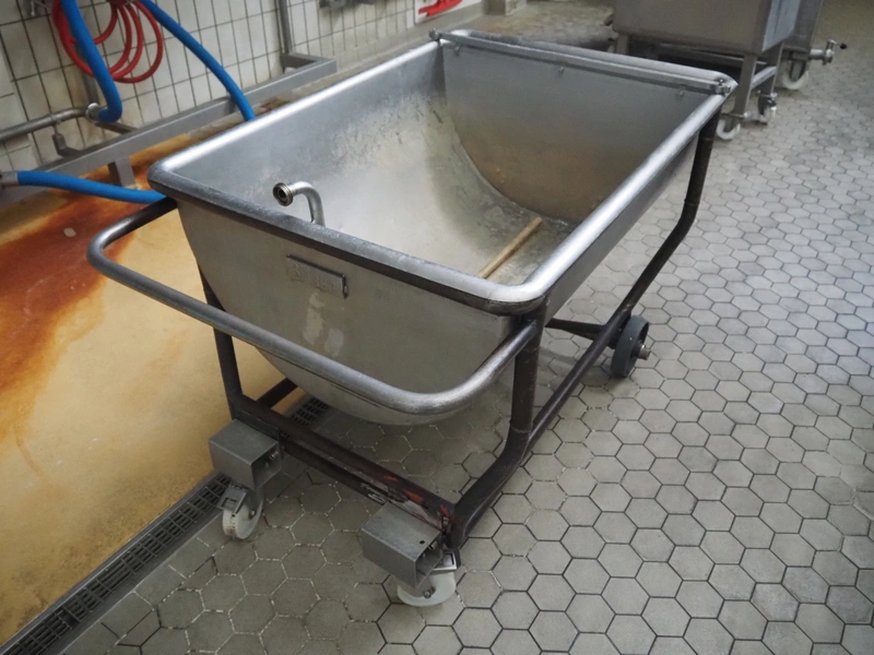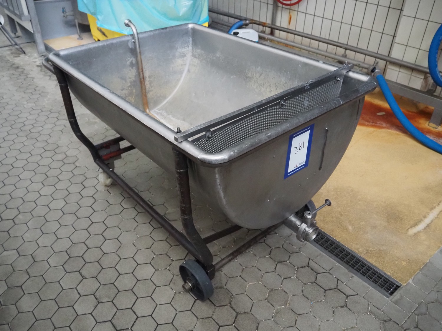 S/s tub with drain on steel mobile frame, inside dimensions: 1240 mm x 850 mm x 500 mm, total dimensions: 1530 mm x 950 mm x 1050 mm.