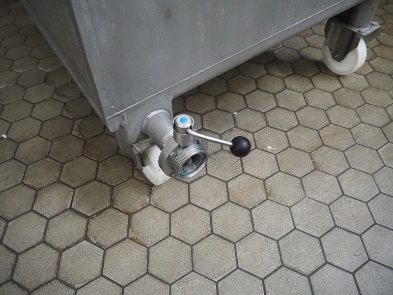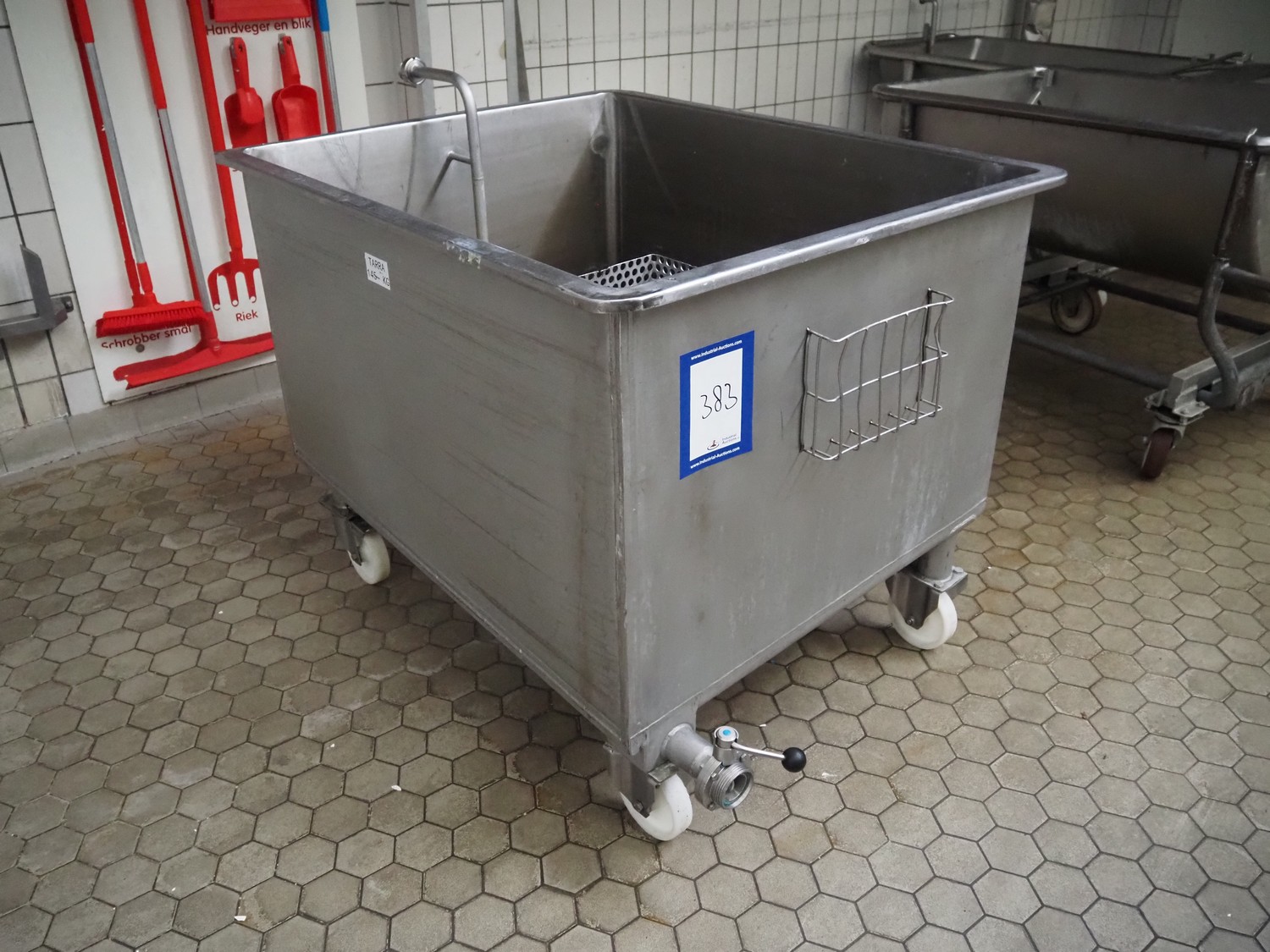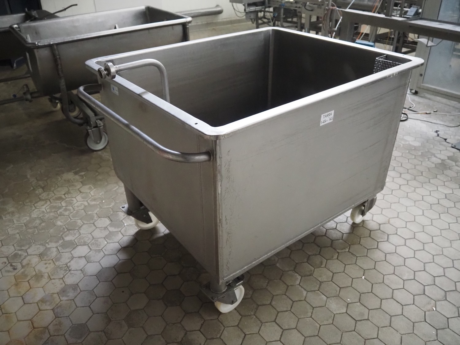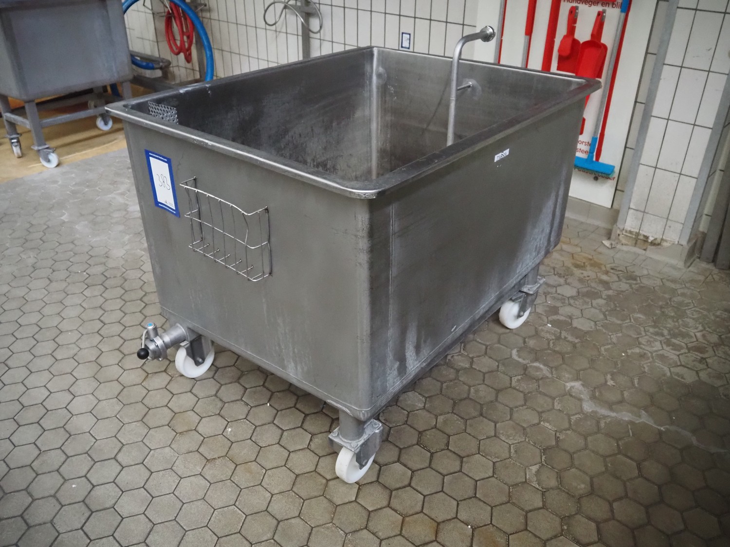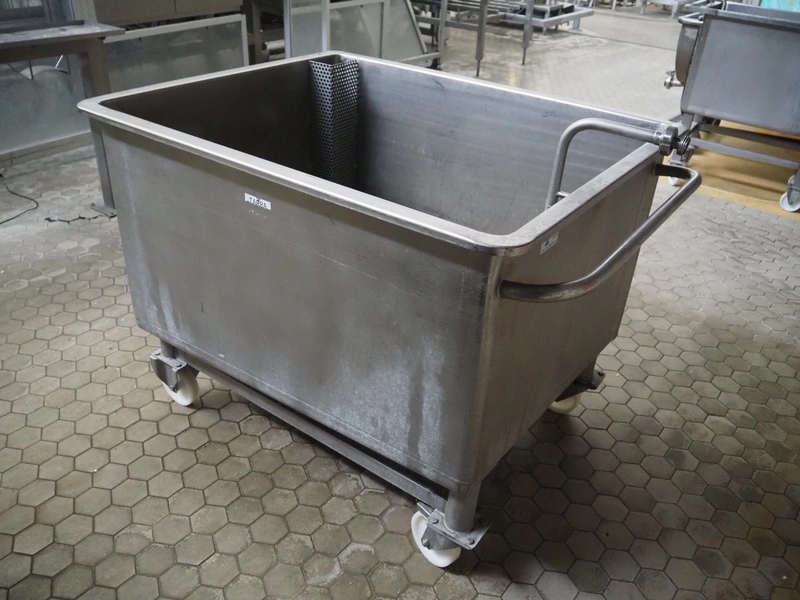 Mobile s/s tub with drain, inside dimensions: 1250 mm x 1000 mm x 770 mm, total dimensions: 1600 mm x 1100 mm x 1180 mm.
