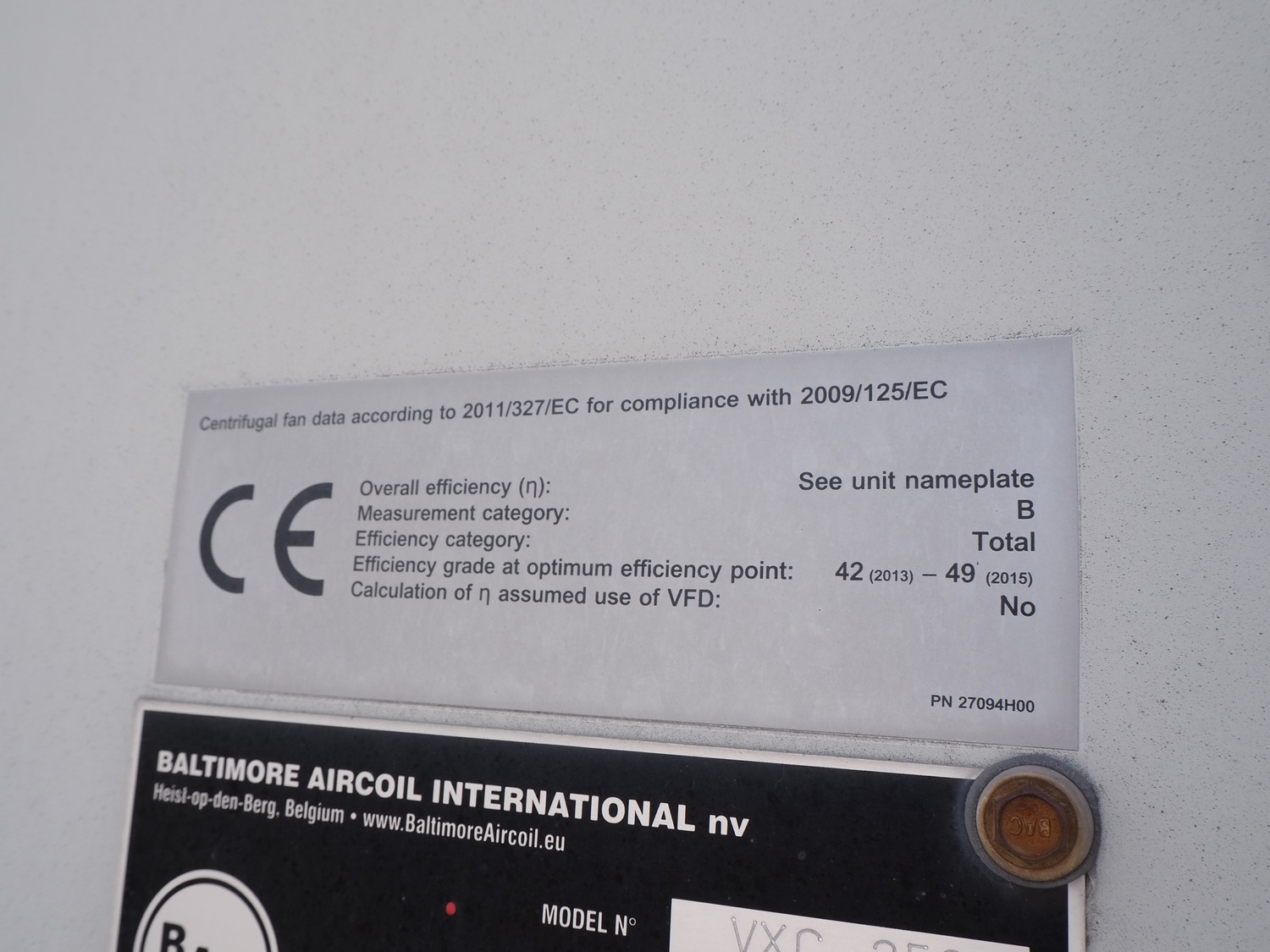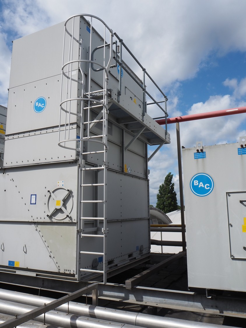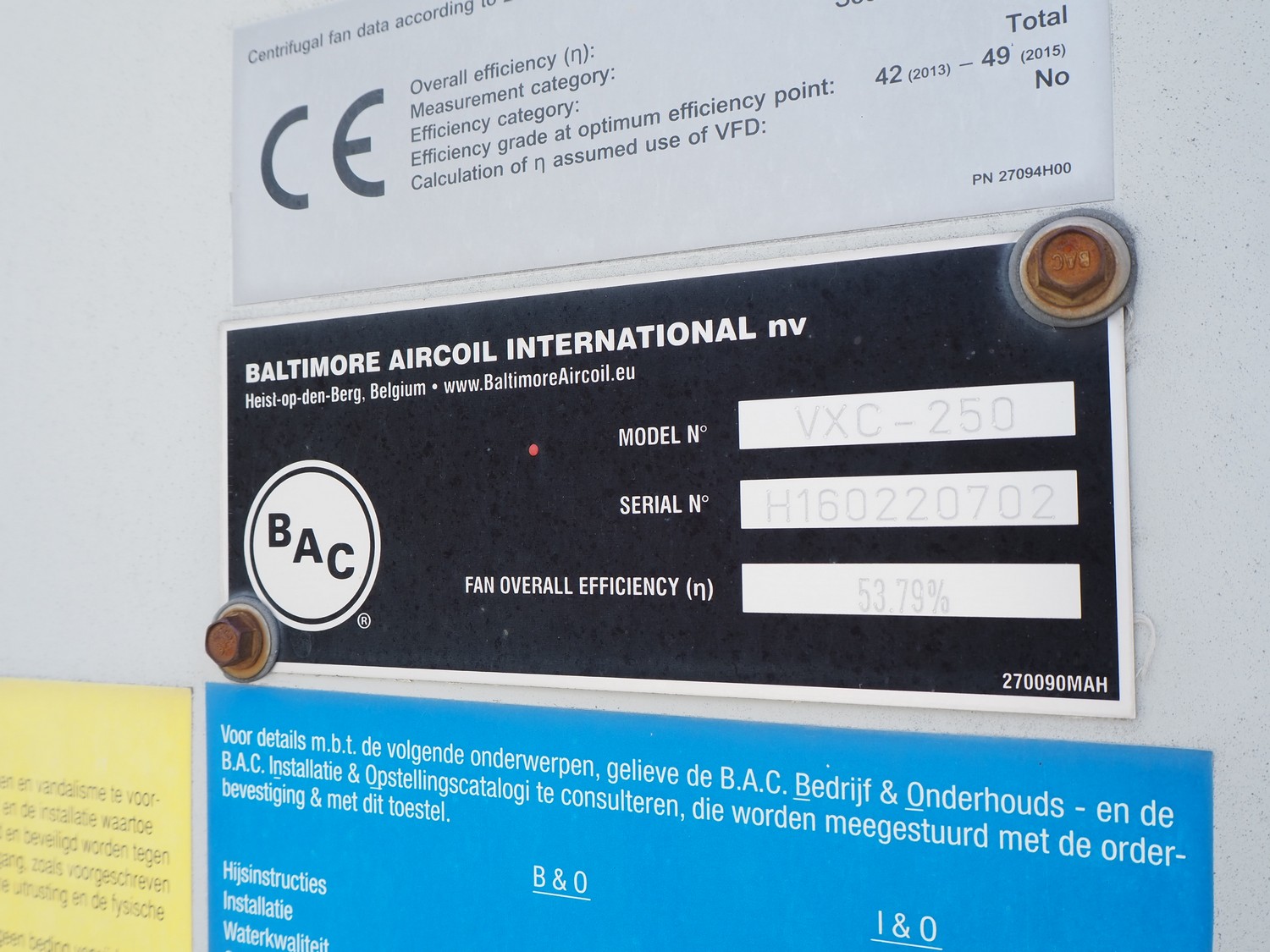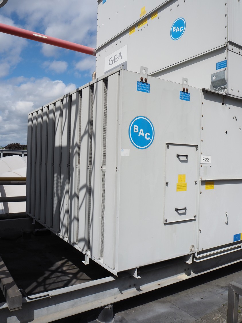Baltimore Aircoil International evaporative condenser, model: VXC-250, serial number: H160220702, fan overall efficiency: 53.79%, dimensions: 3600 mm x 3530 mm x 5000 mm.