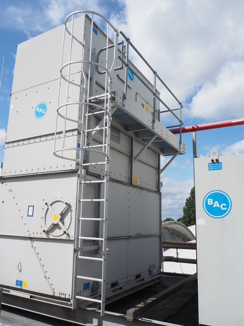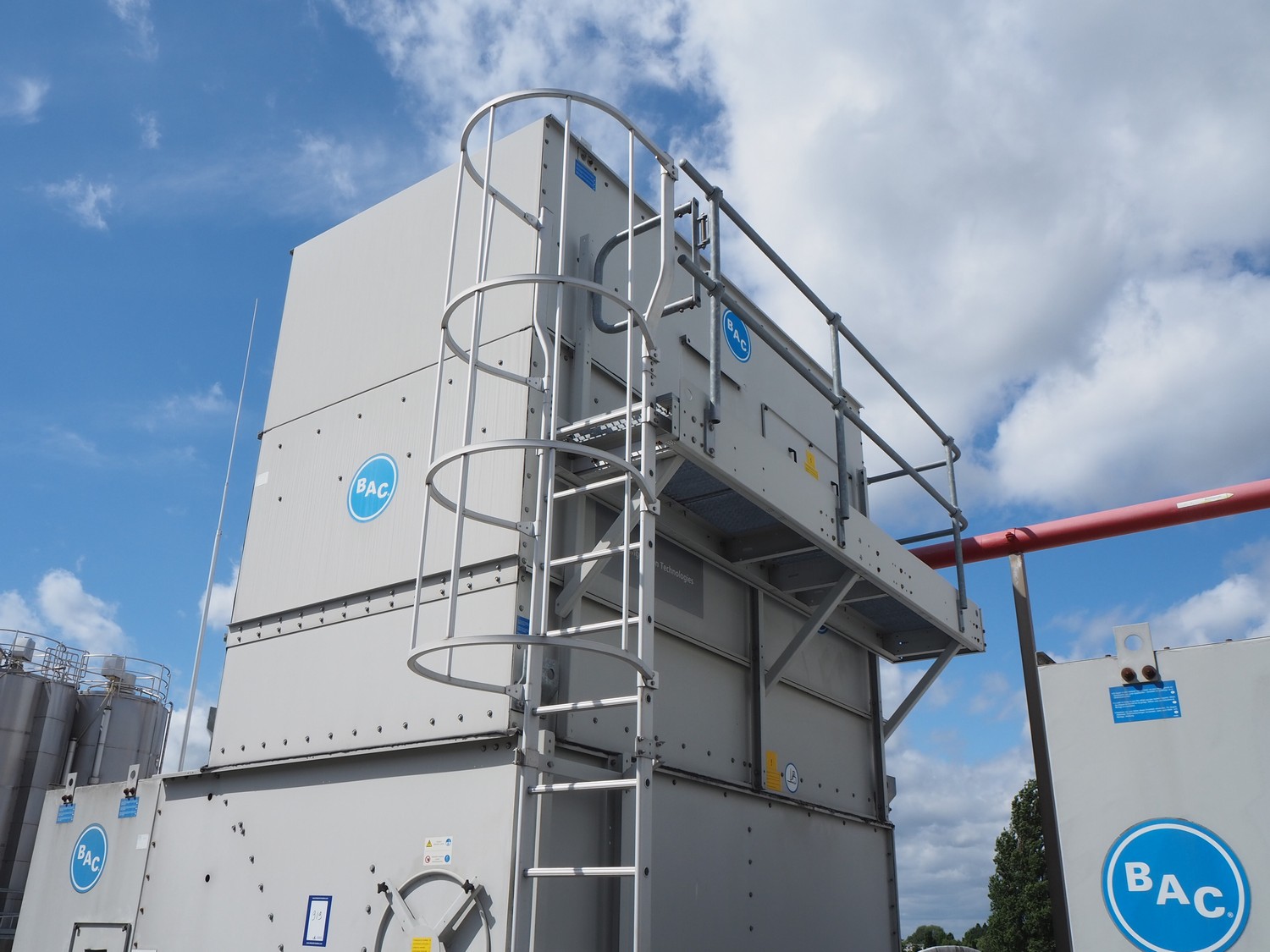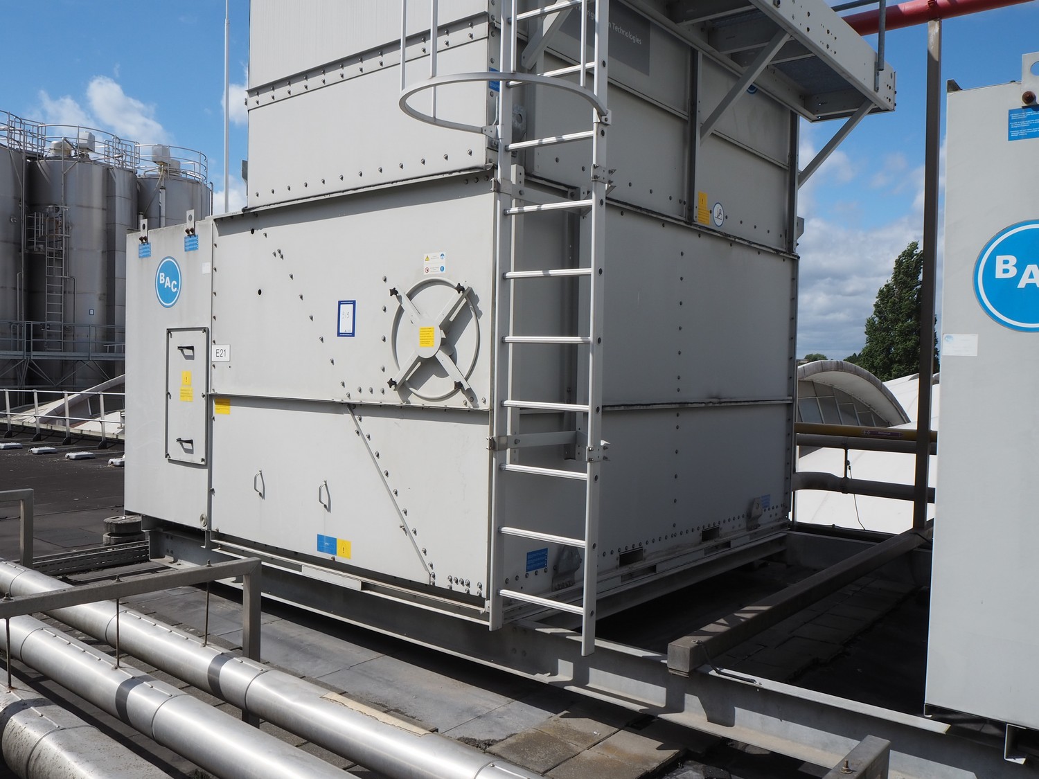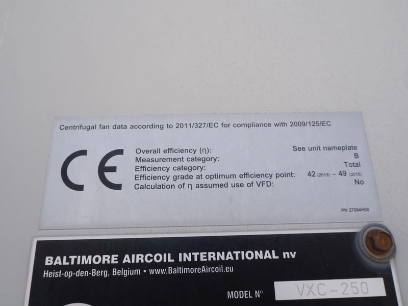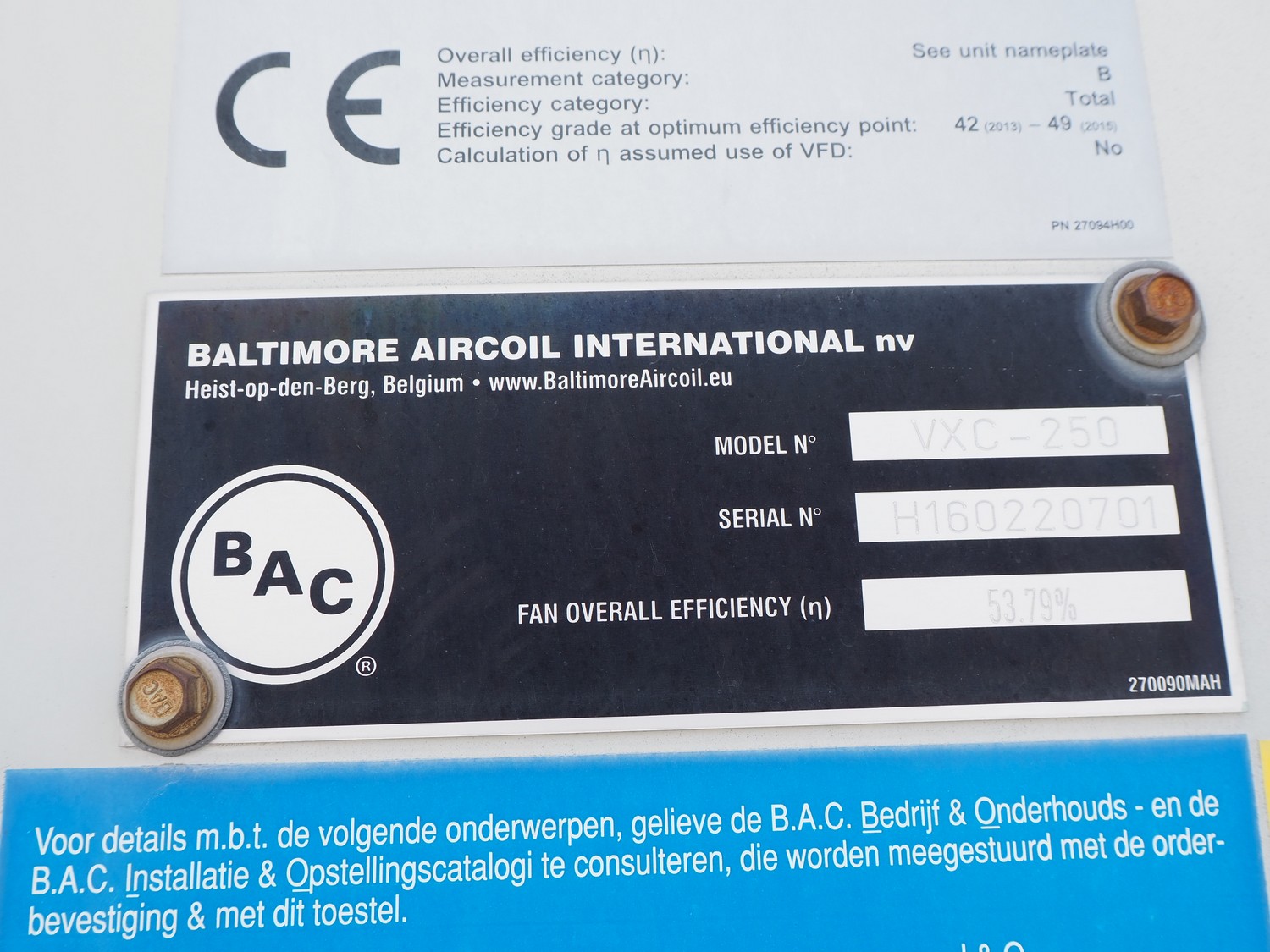 Baltimore Aircoil International evaporative condenser, model: VXC-250, serial number: H160220701, fan overall efficiency: 53.79%, dimensions: 3600 mm x 3530 mm x 5000 mm.