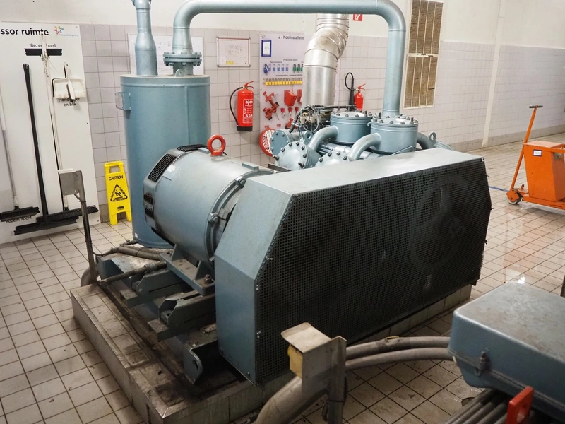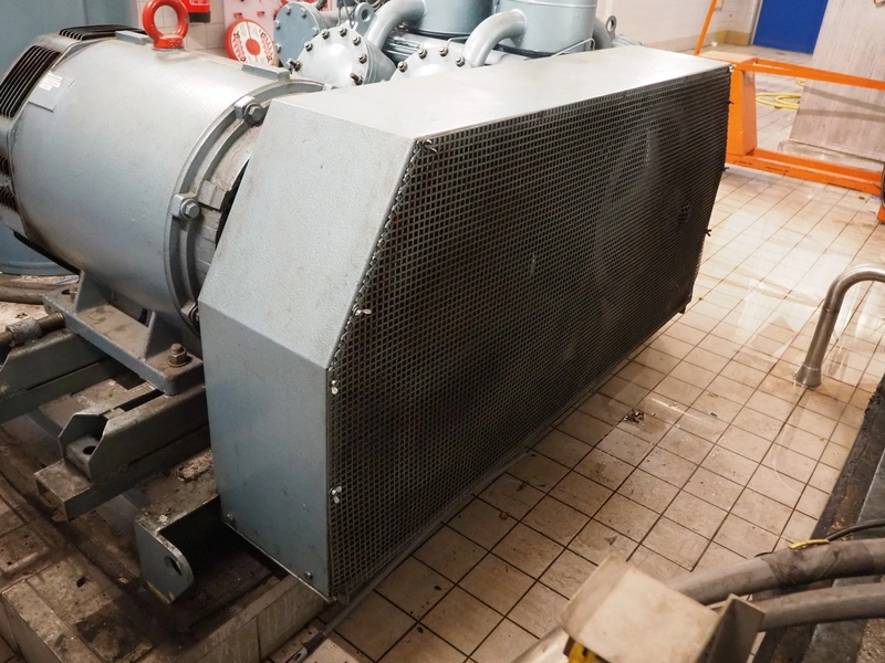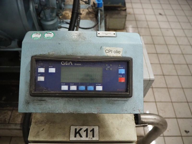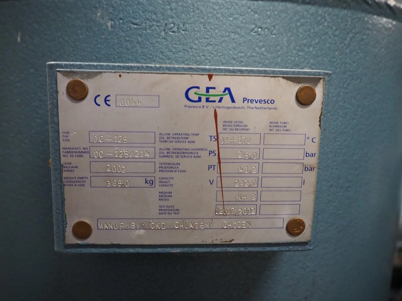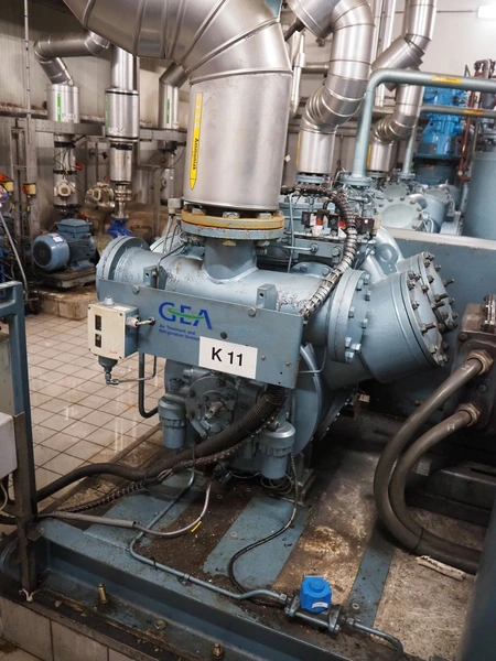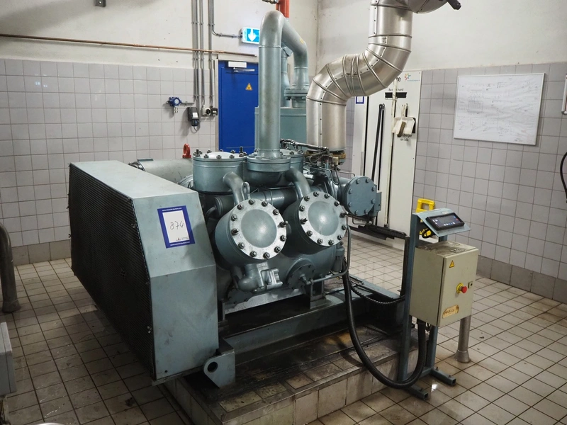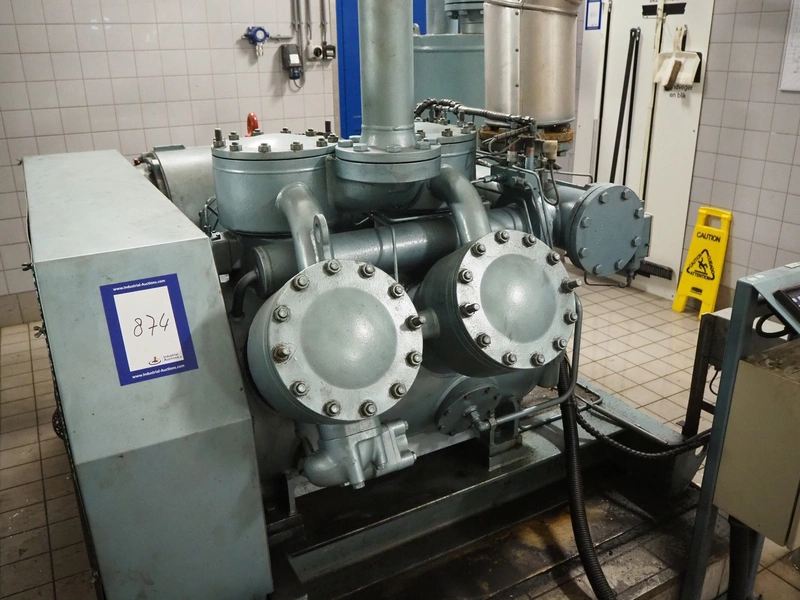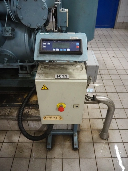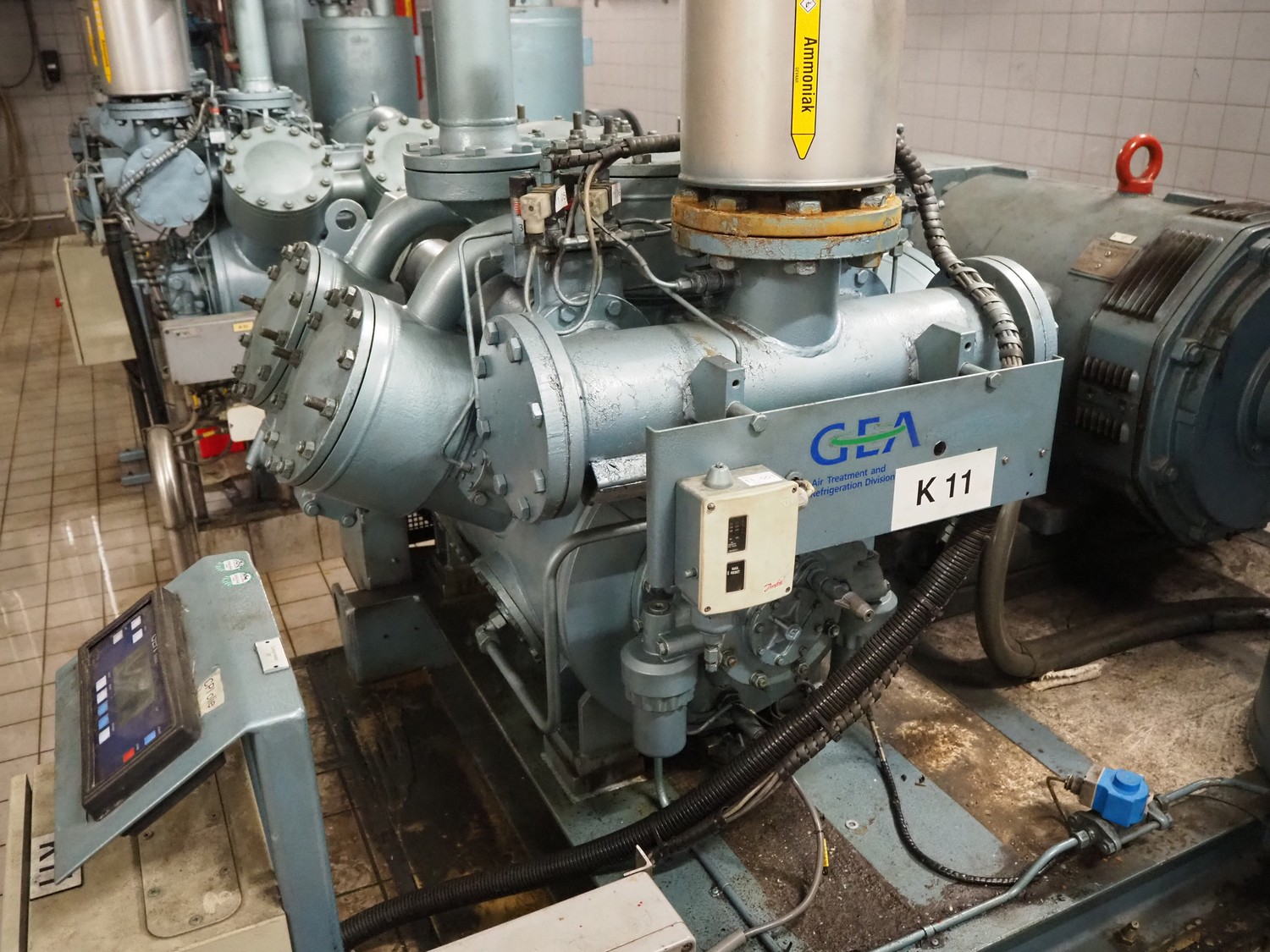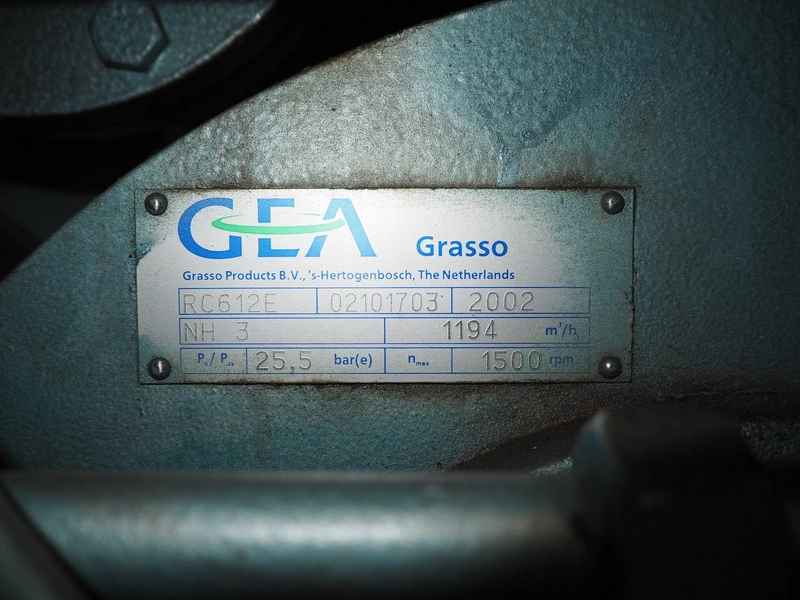 GEA reciprocating piston compressor, type: RC 612, number: 02101703, year of construction: 2002, capacity: 1194 m³/h, refrigerant: NH 3, 25.5 bar, 1500 rpm, dimensions: 2500 mm x 2100 mm x 1800 mm.