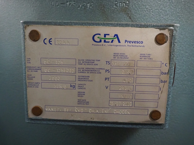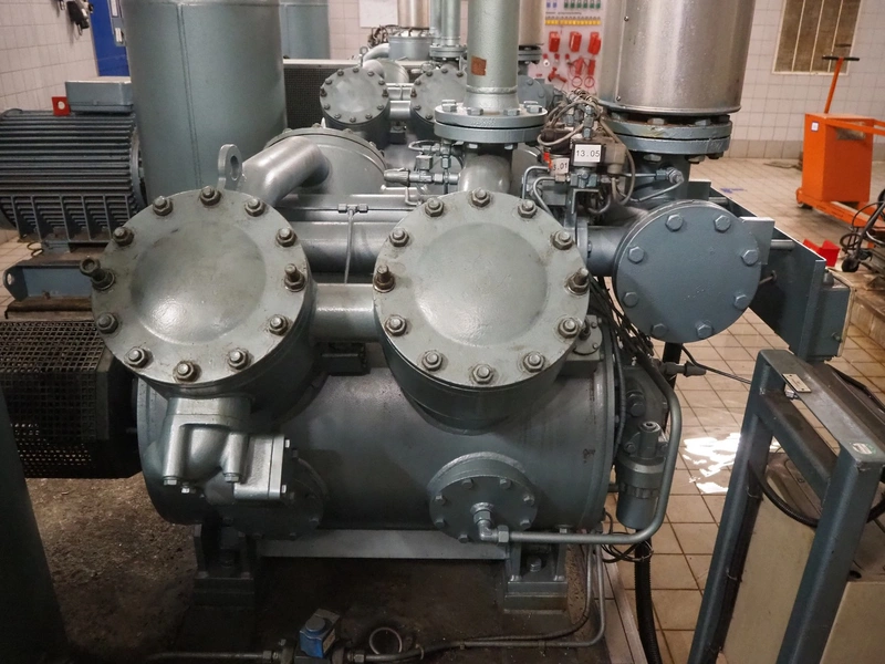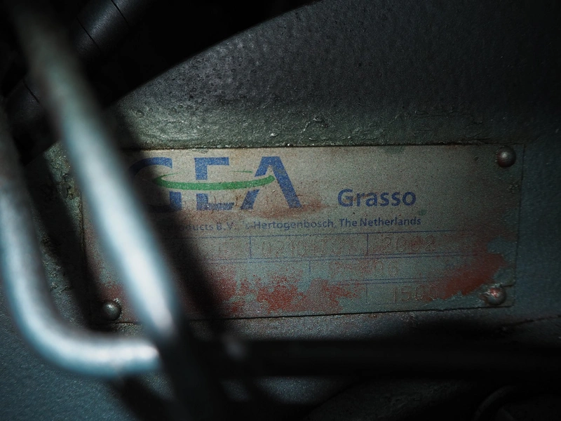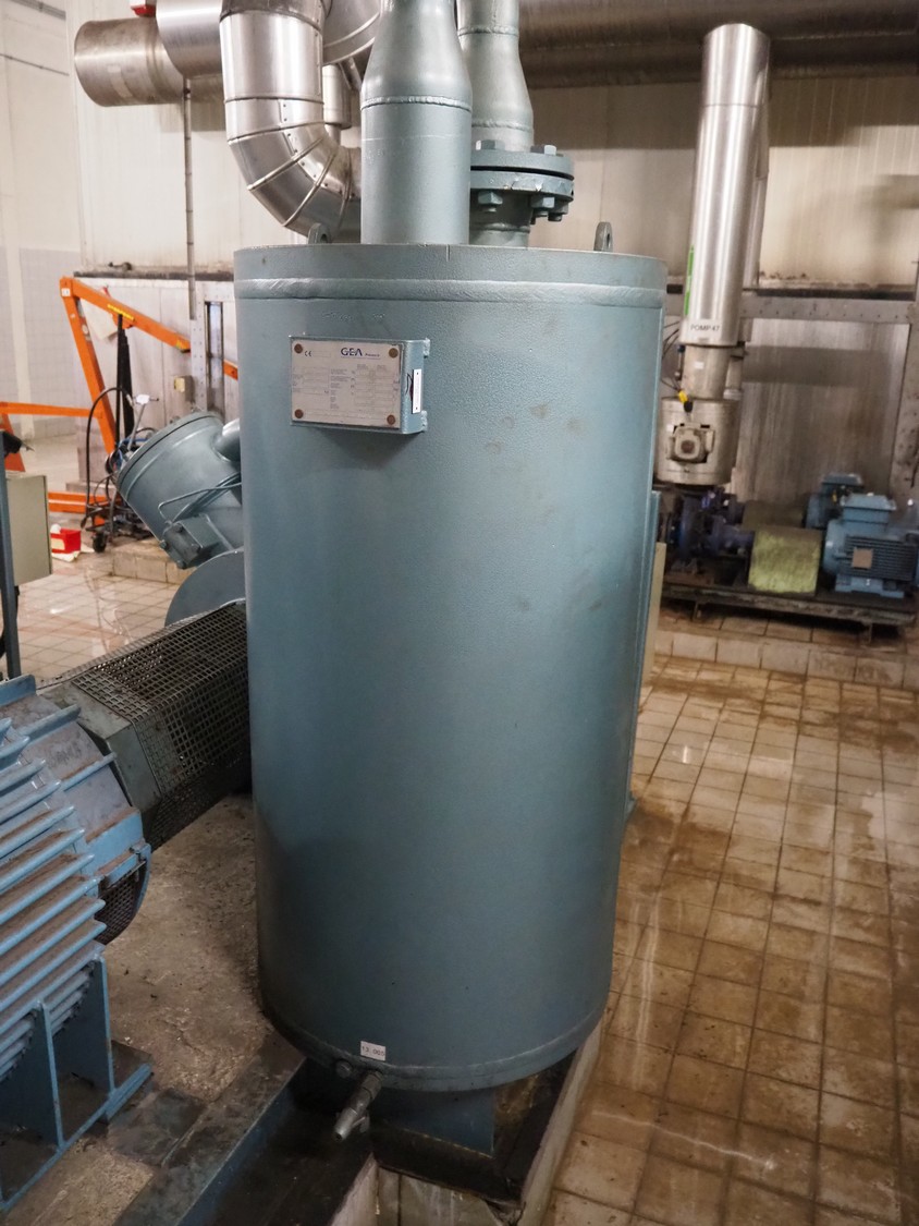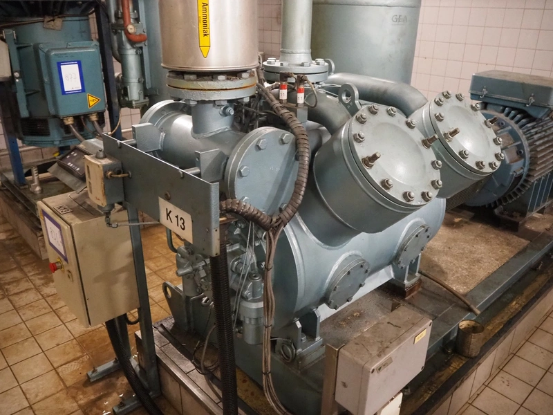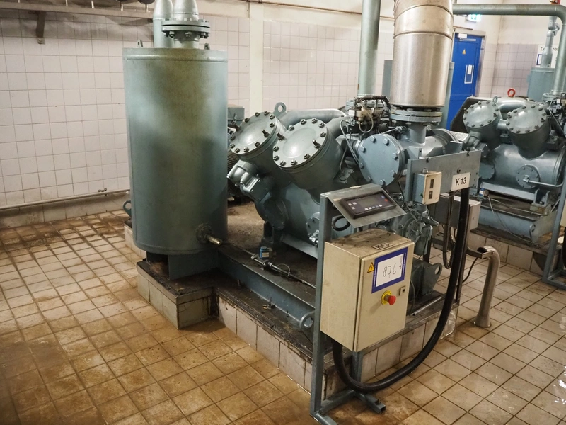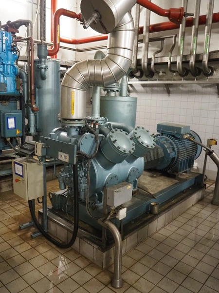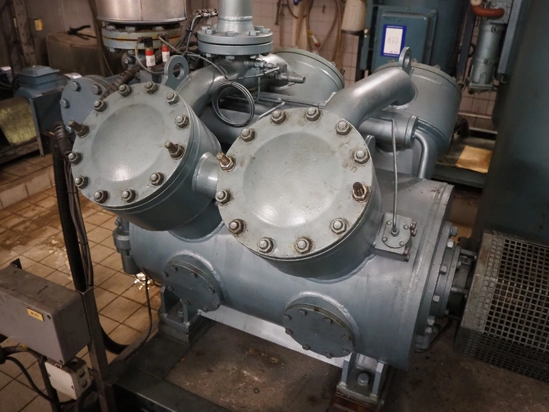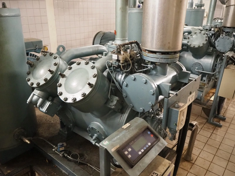 GEA reciprocating piston compressor, type: RC 412E, number: 02101701, year of construction: 2002, capacity: 796 m³/h, refrigerant: NH 3, 25.5 bar, 1500 rpm, dimensions: 3000 mm x 1500 mm x 1700 mm.