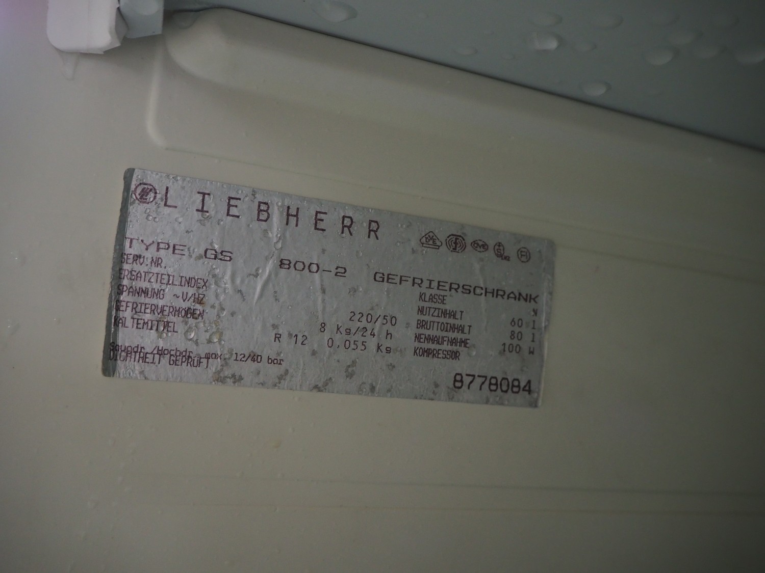 Liebherr freezer, type: GS 800-2, serial number: 8778084, 220 V, 50 Hz, volume: 60 litre, refrigerant: R12/0.055 kg, dimensions: 550 mm x 650 mm x 630 mm.