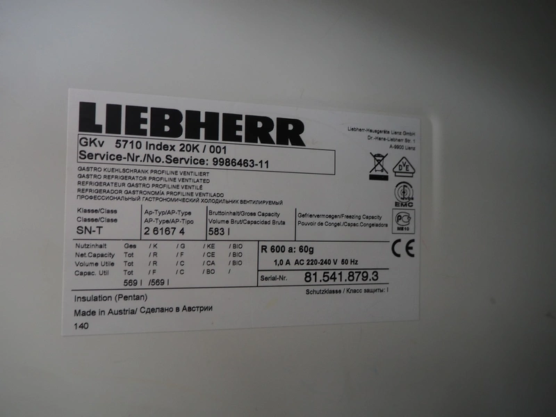 Liebherr refrigerator, type: 5710 Index 20K / 001, serial number: 81.541.879.3, 220/240 V, 50 Hz, 1.0 A, capacity: 569 litre, refrigerant: R 600 a/60 g, dimensions: 740 mm x 750 mm x 1860 mm. Please notice that this lot will be available at the end of the project in December 2025.