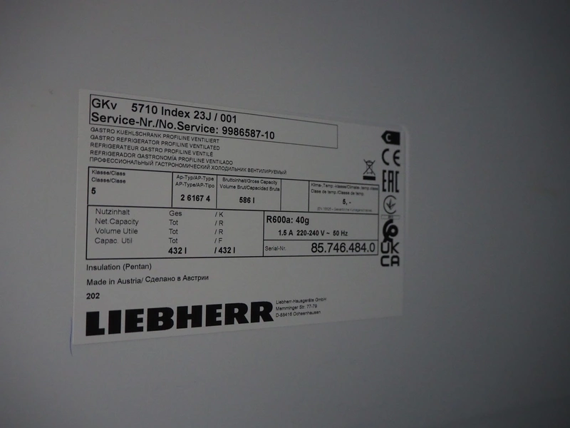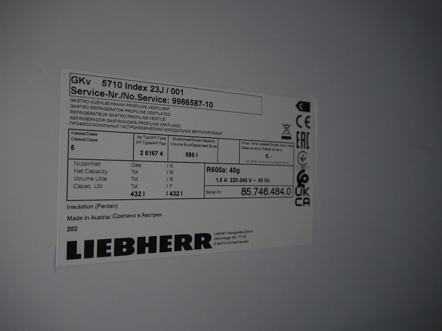 Liebherr refrigerator, type: GKv 5710 Index 23J/001, serial number: 85.746.484.0, 220/240 V, 50 Hz, 1.5 A, capacity: 432 litre, refrigerant: R600a/40 g, dimensions: 740 mm x 750 mm x 1840 mm. Please notice that this lot will be available at the end of the project in December 2025.