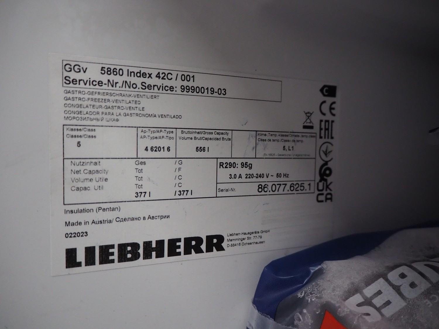 Liebherr s/s freezer, type: GGv 5860 Index 42C/001, serial number: 86.077.625.1, 220/240 V, 50 Hz, 3.0 A, capacity: 377 litre, refrigerant: R290/95 g, dimensions: 740 mm x 750 mm x 2070 mm. Please notice that this lot will be available at the end of the project in December 2025.
