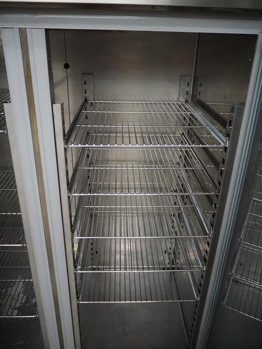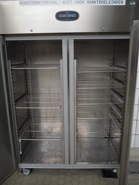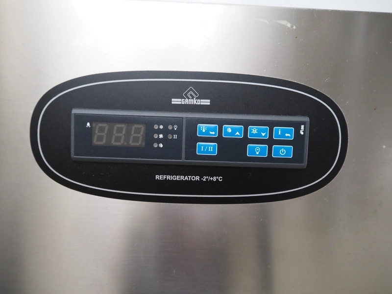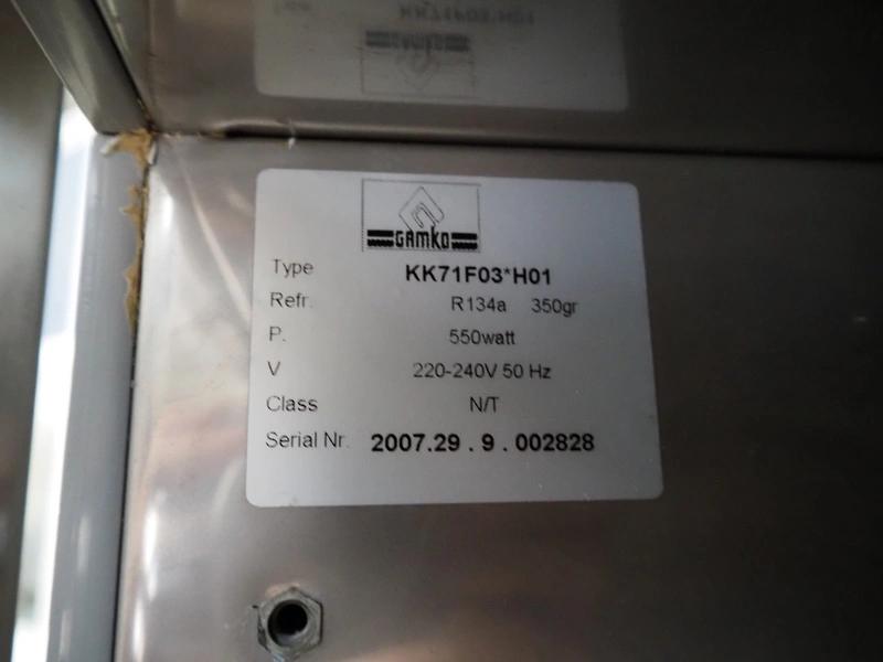 Gamko s/s refrigerator, type: KK71F03*H01, serial number: 2007.29.9.002828, 220-240 V, 50 Hz, 550 W, refrigerant: R134a/350 gram, temperature range: -2/+8 °C, dimensions: 1430 mm x 800 mm x 2100 mm.