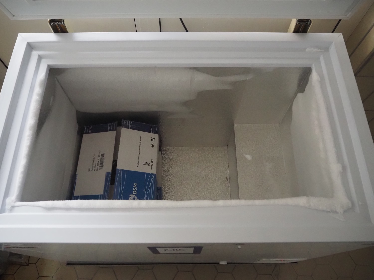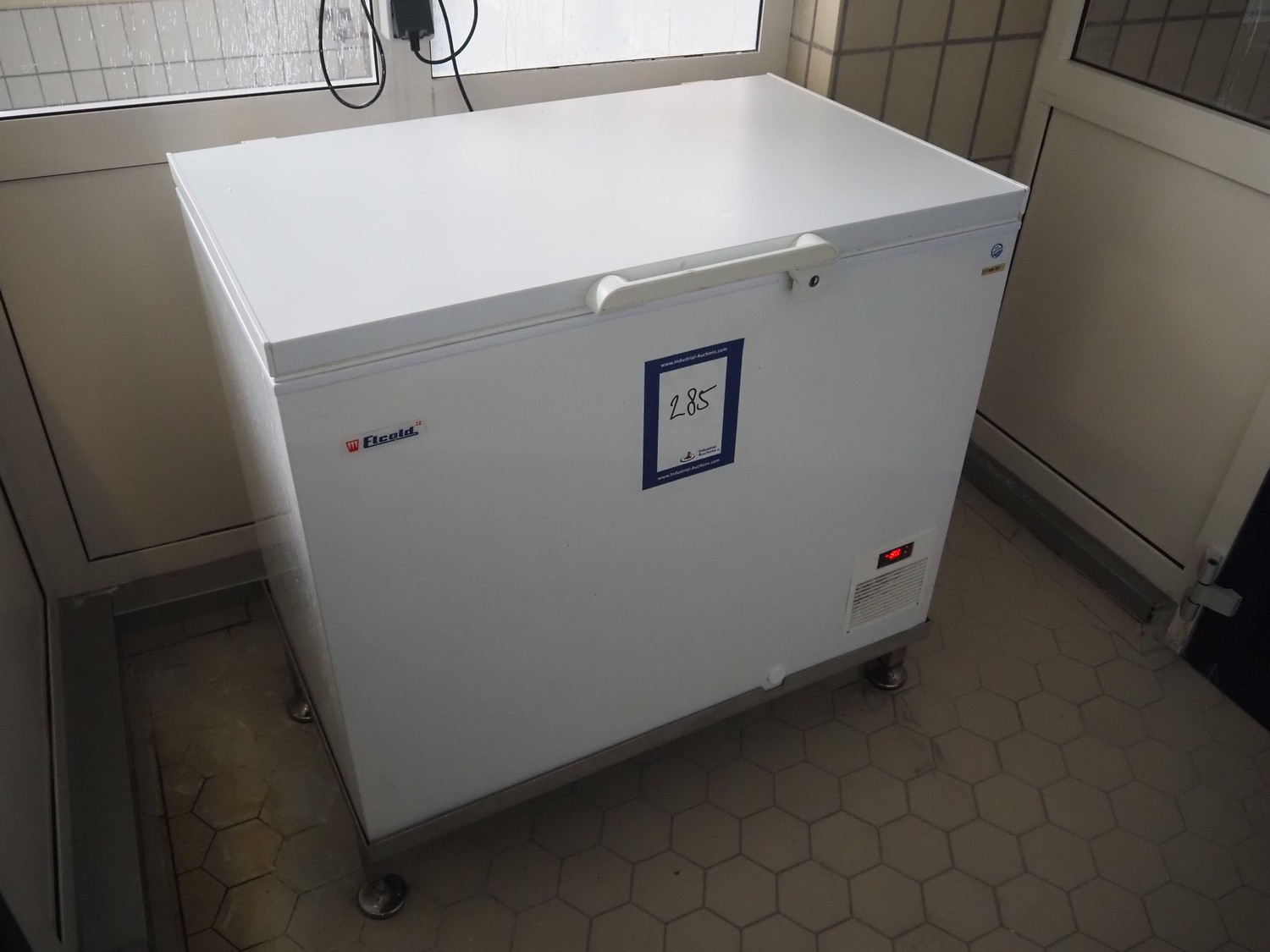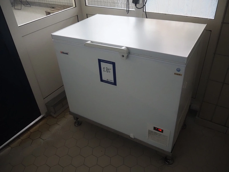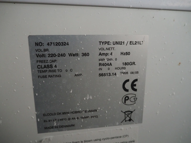 Elcold chest freezer, type: UNI21/EL21LT, number: 47120324, 220-240 V, 50 Hz, 4 A, 360 W, refrigerant: R404A/180 gram, dimensions: 1060 mm x 750 mm x 1020 mm.