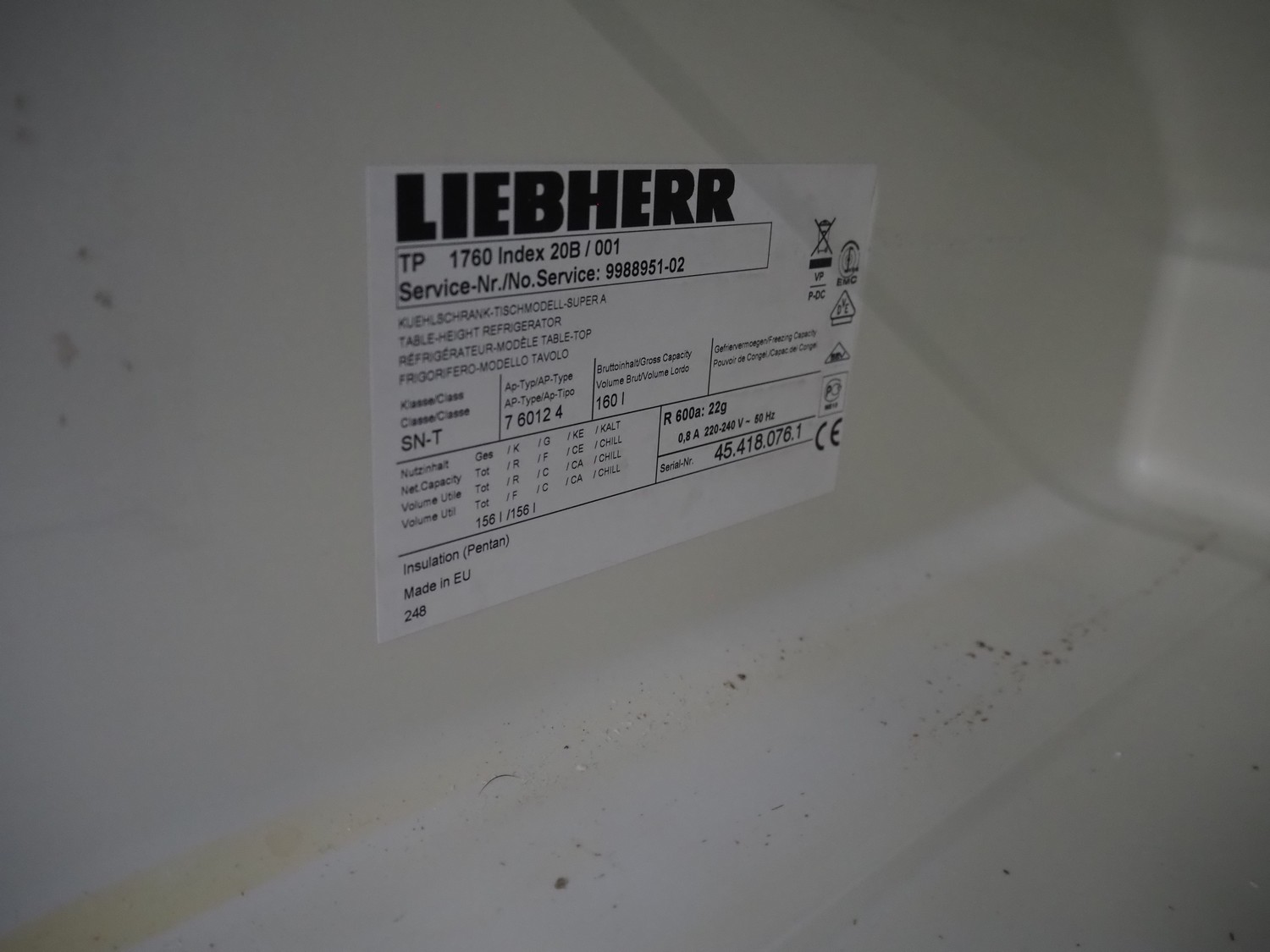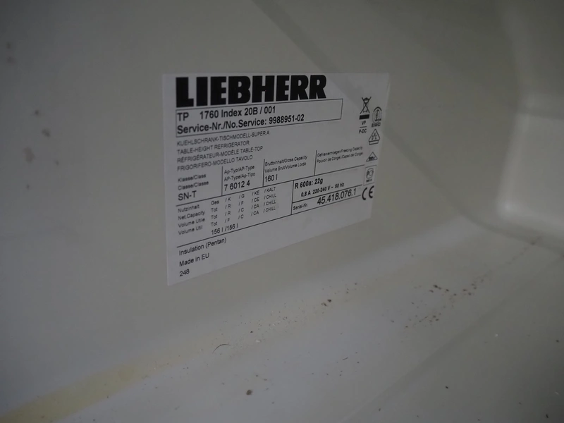 Liebherr refrigerator, type: 1760 Index 20B / 001, serial number: 45.418.076.1, 220/240 V, 1 Ph, 50 Hz, 0.8 A, volume: 156 litre, refrigerant: R 600a/22 g, dimensions: 600 mm x 650 mm x 1230 mm.